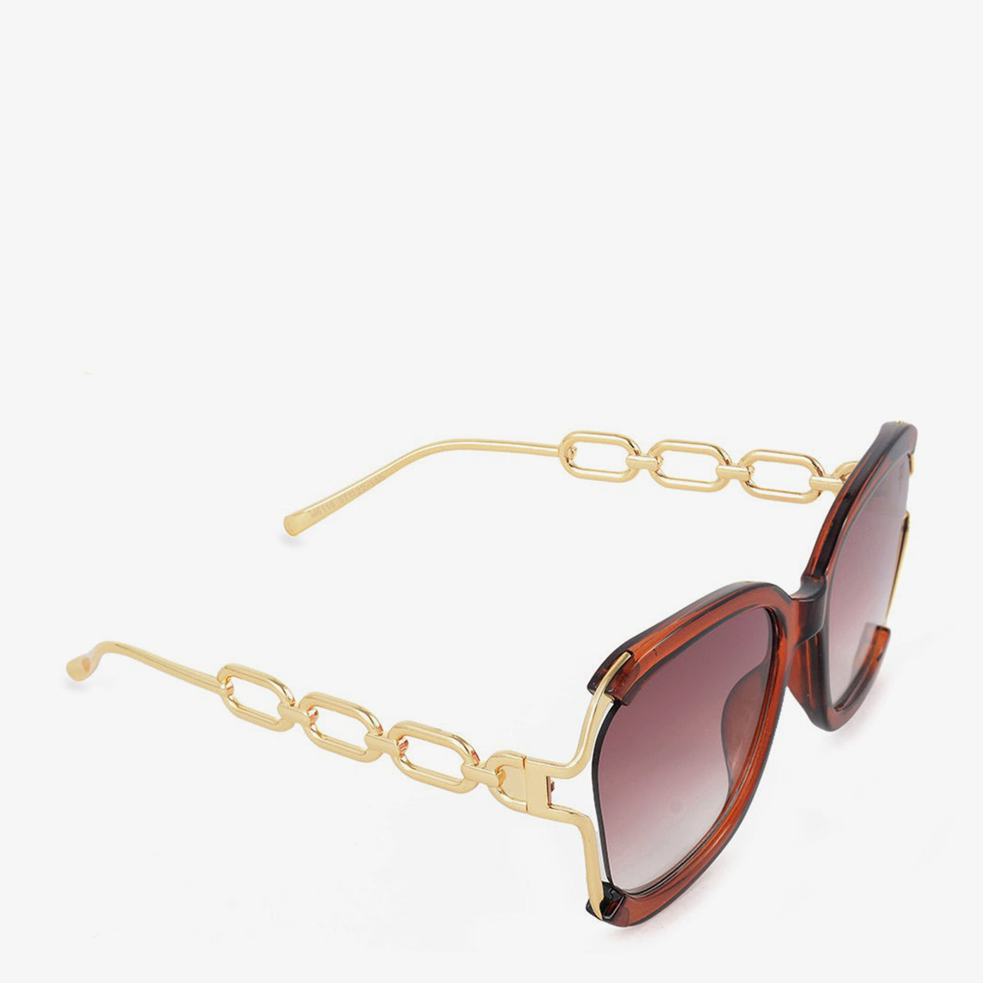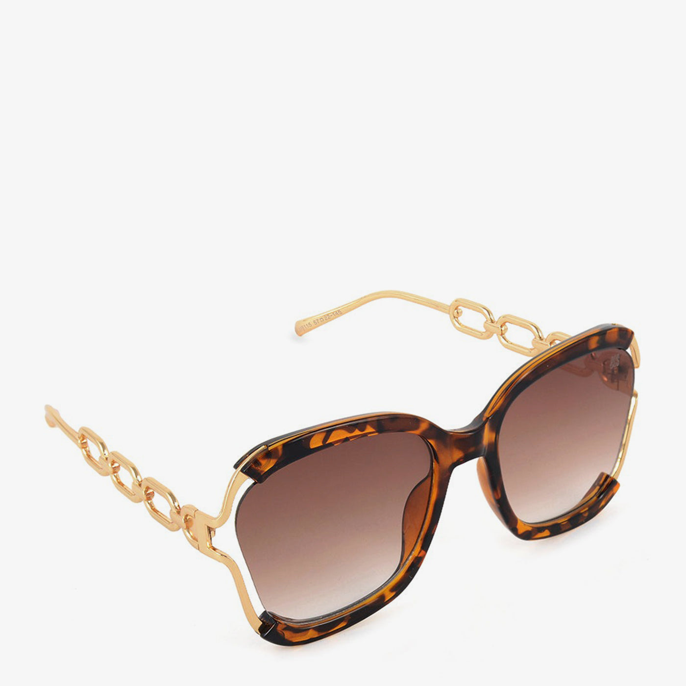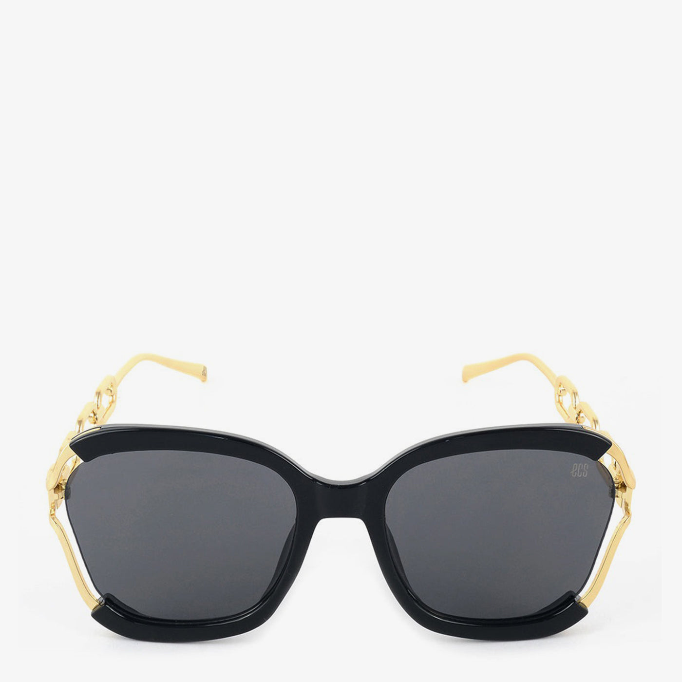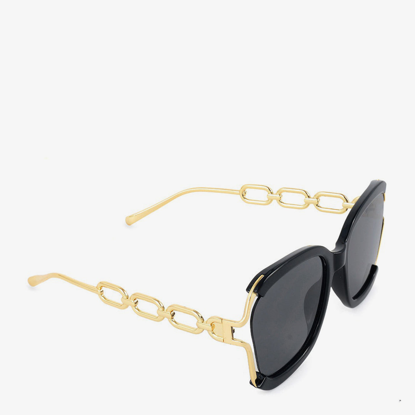 These glamorous oversized sunglasses feature a black frame with unique gold detailing around the lenses and temples. The lenses have a dark tint. A statement accessory to elevate any outfit.