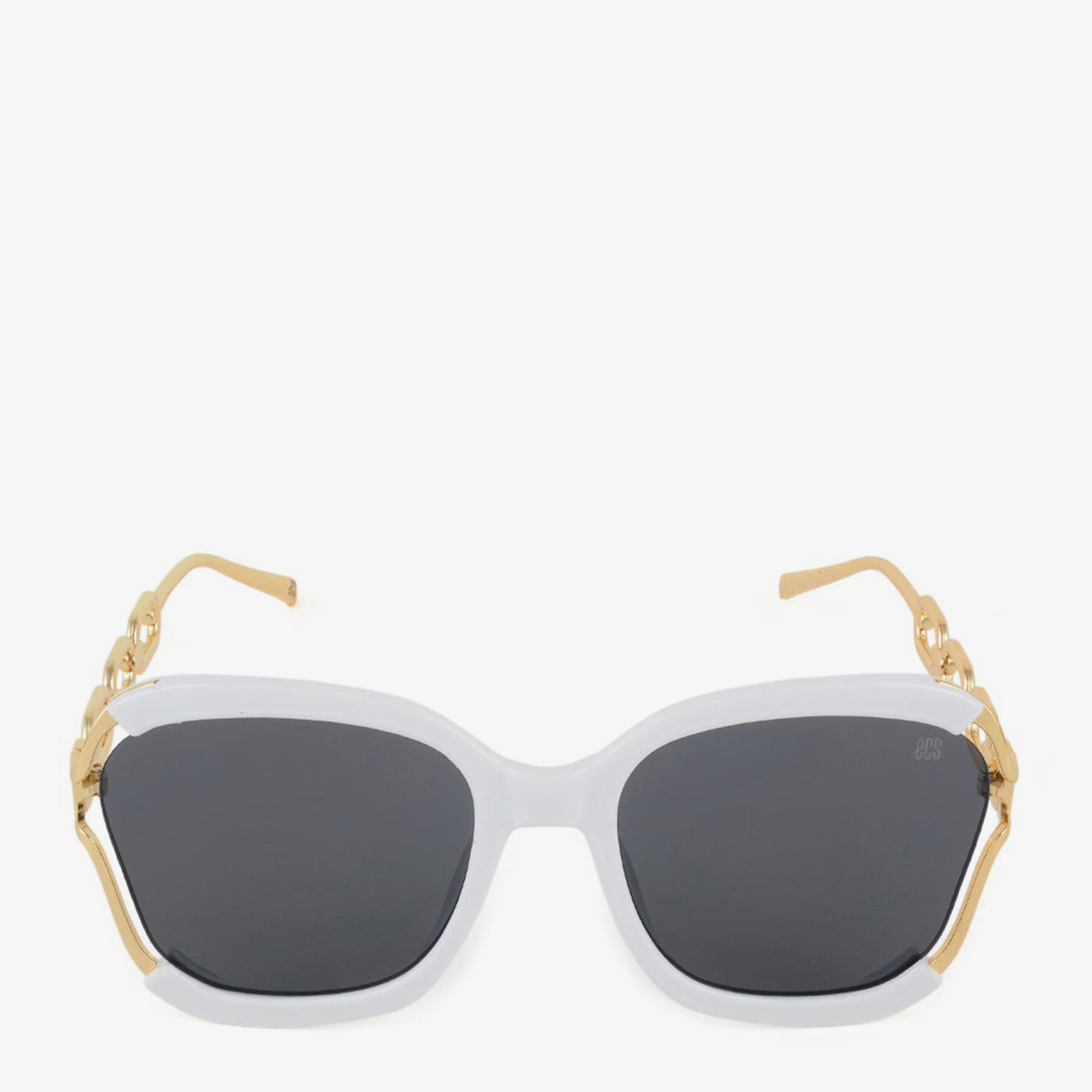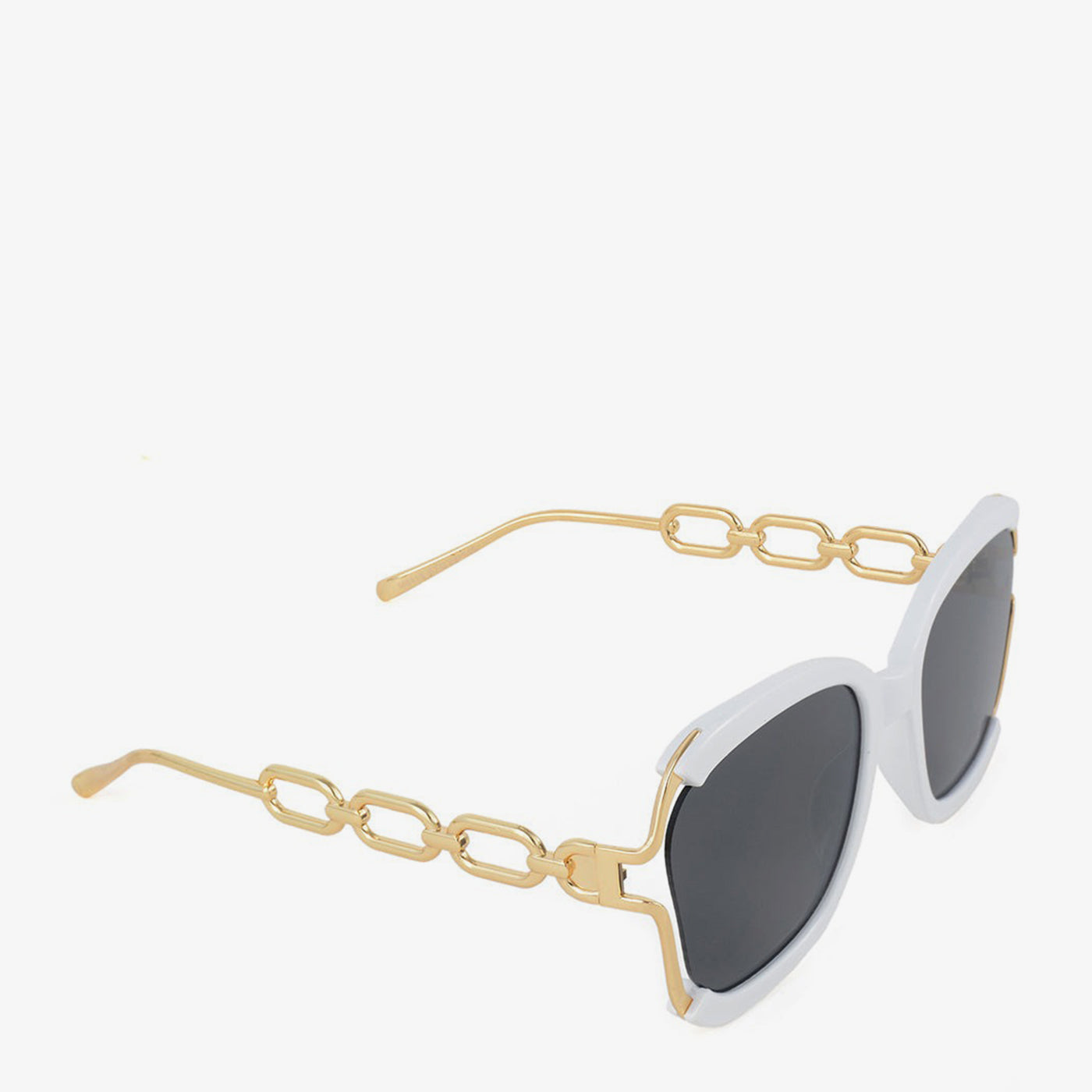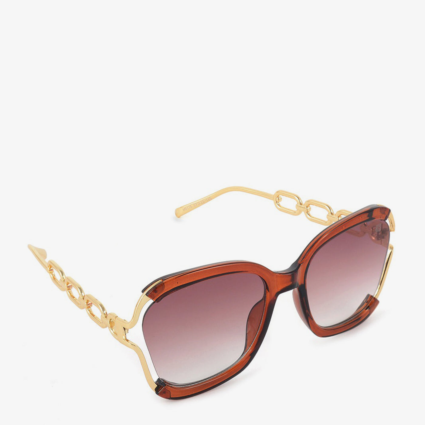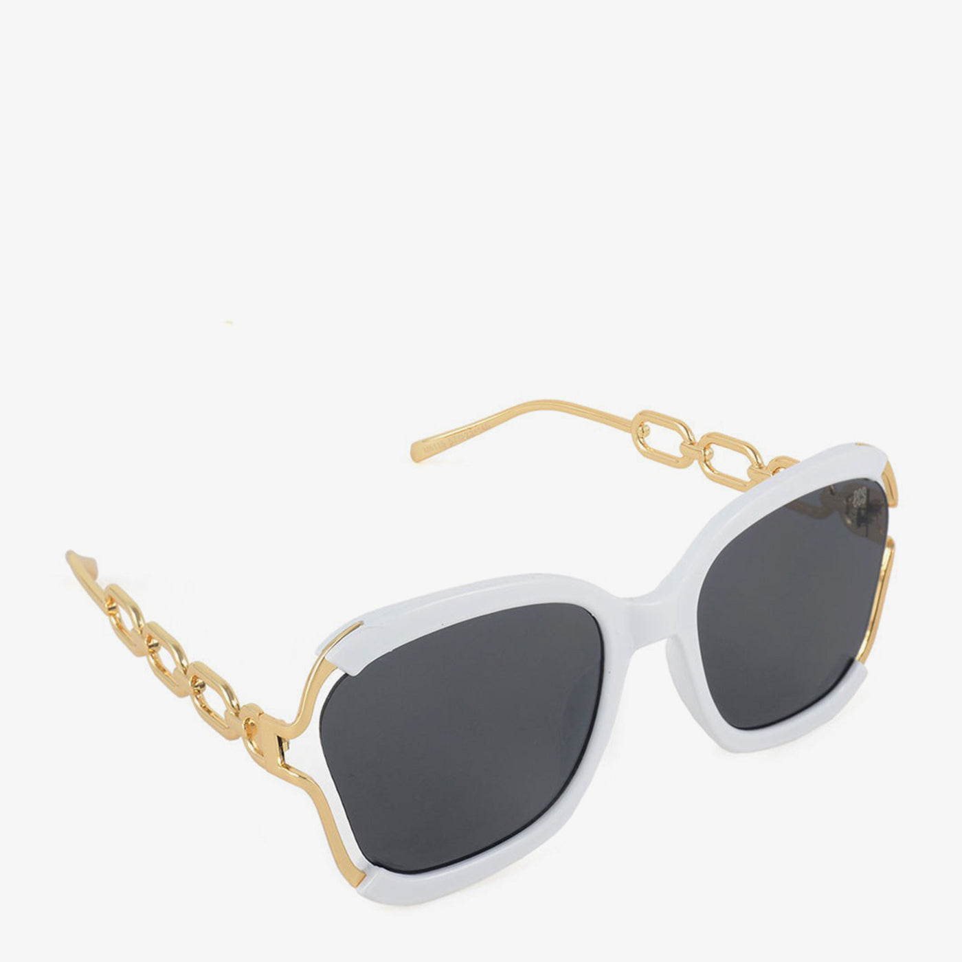 These glamorous oversized sunglasses feature a black frame with unique gold detailing around the lenses and temples. The lenses have a dark tint. A statement accessory to elevate any...