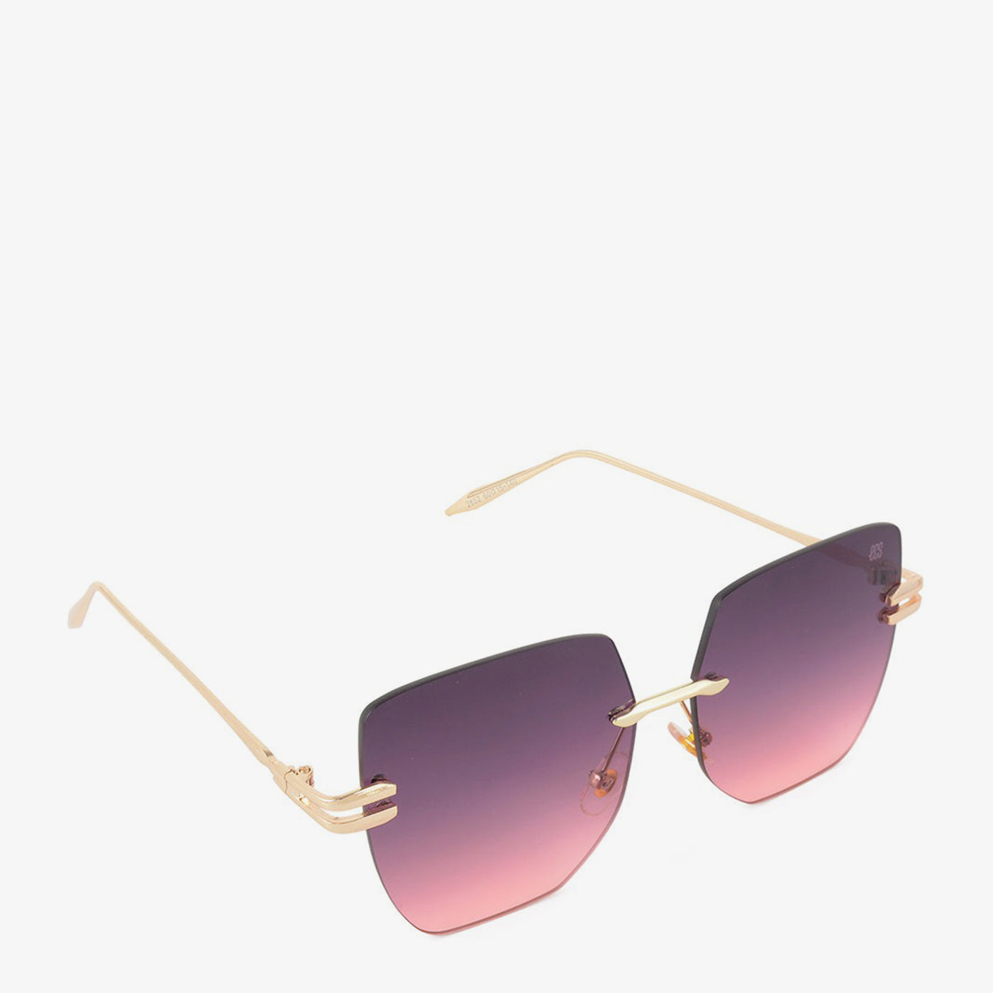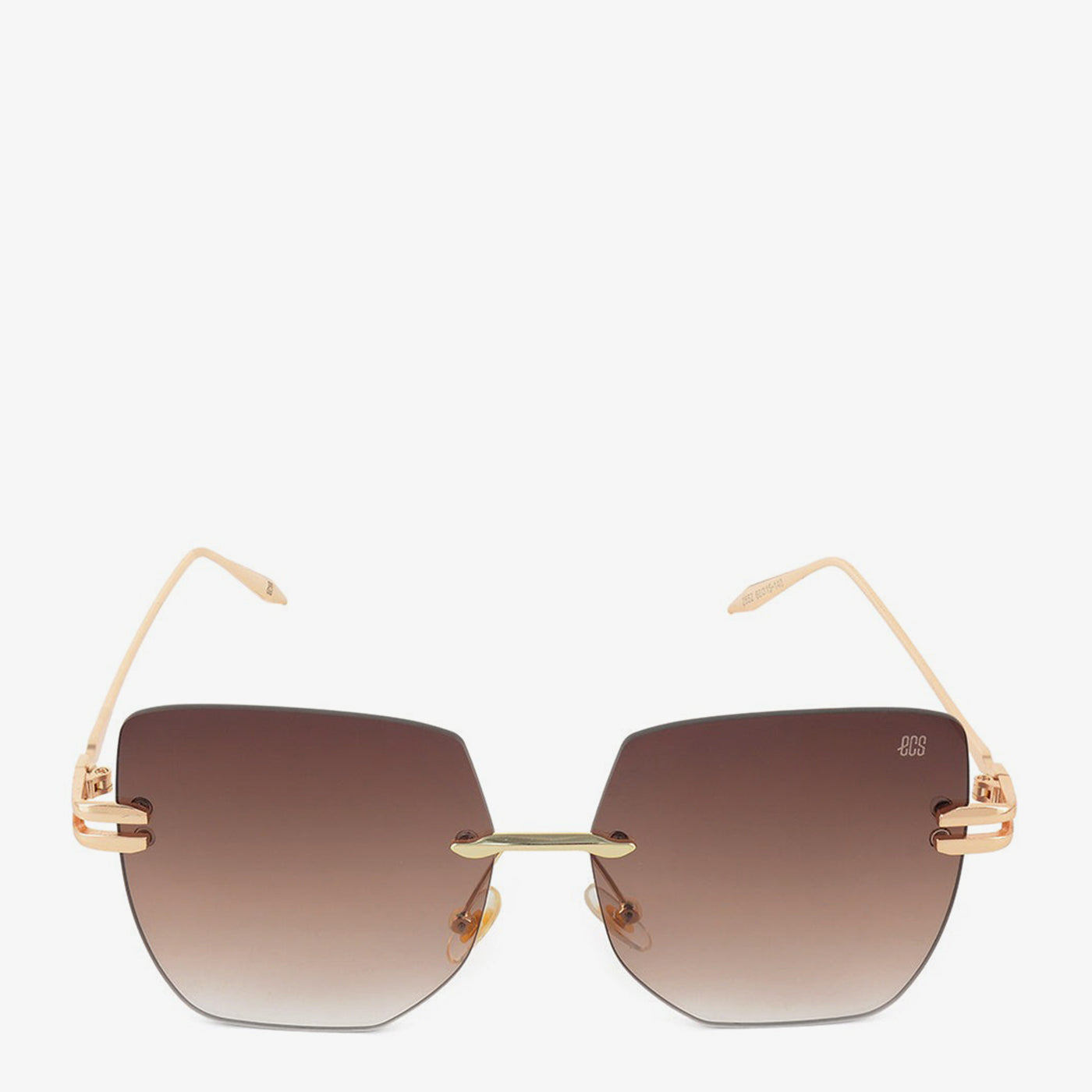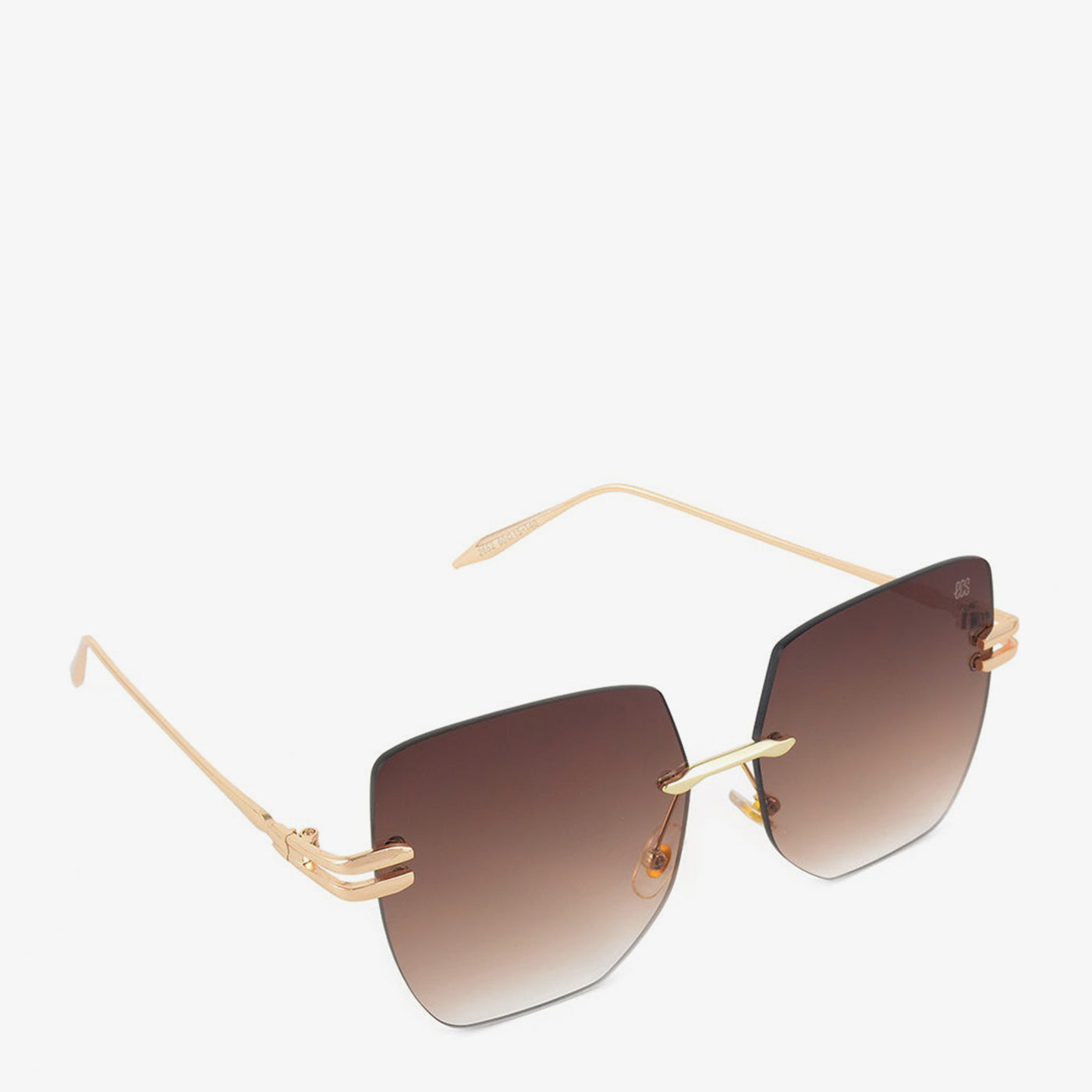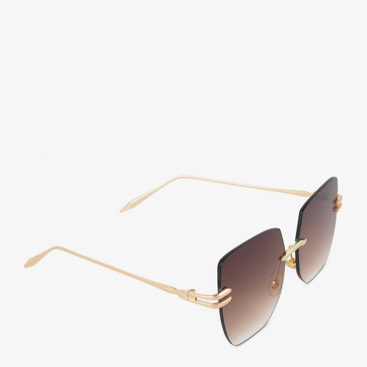 These modern rimless sunglasses feature a unique geometric lens shape with gold metallic accents. The lenses have a warm brown gradient. A stylish and contemporary accessory.