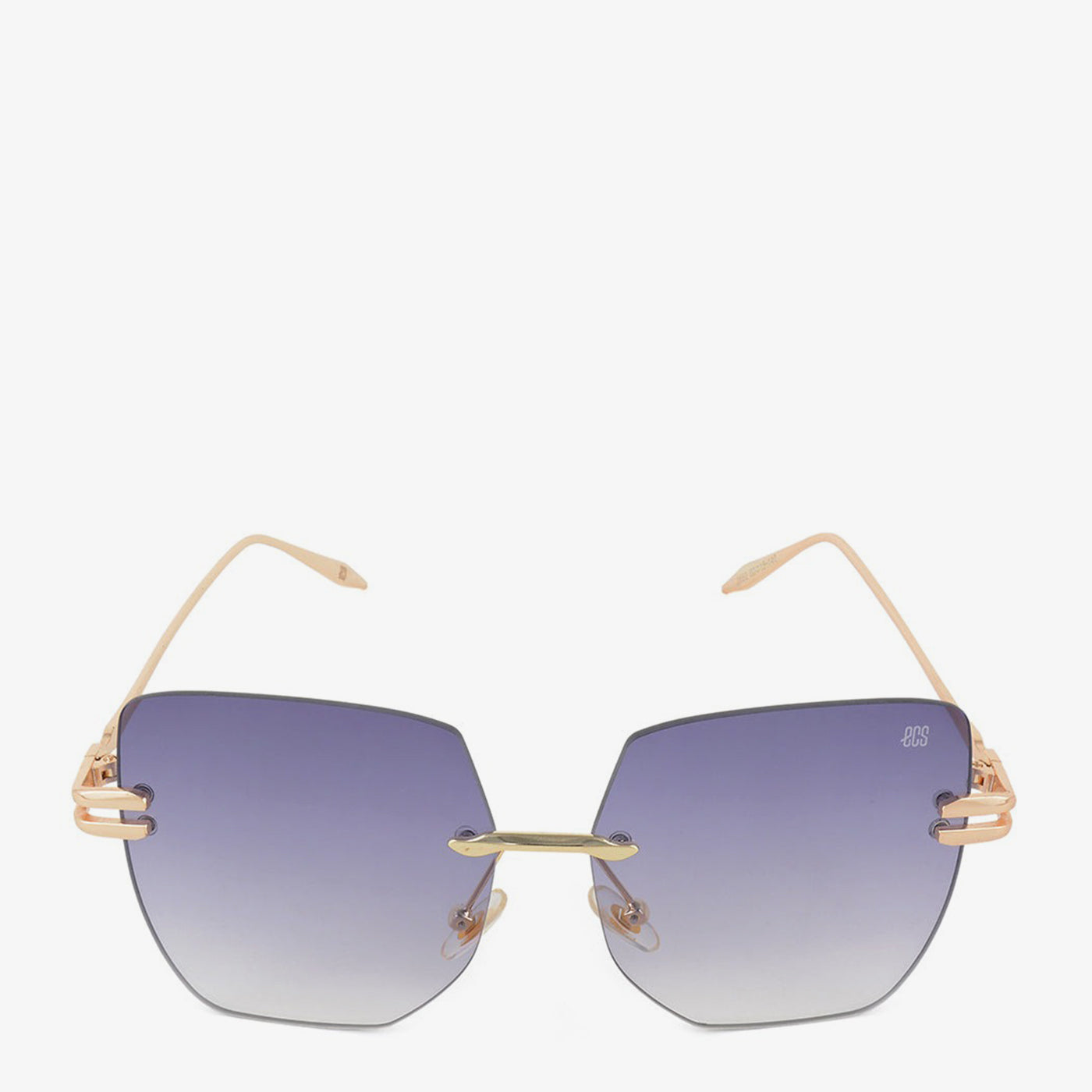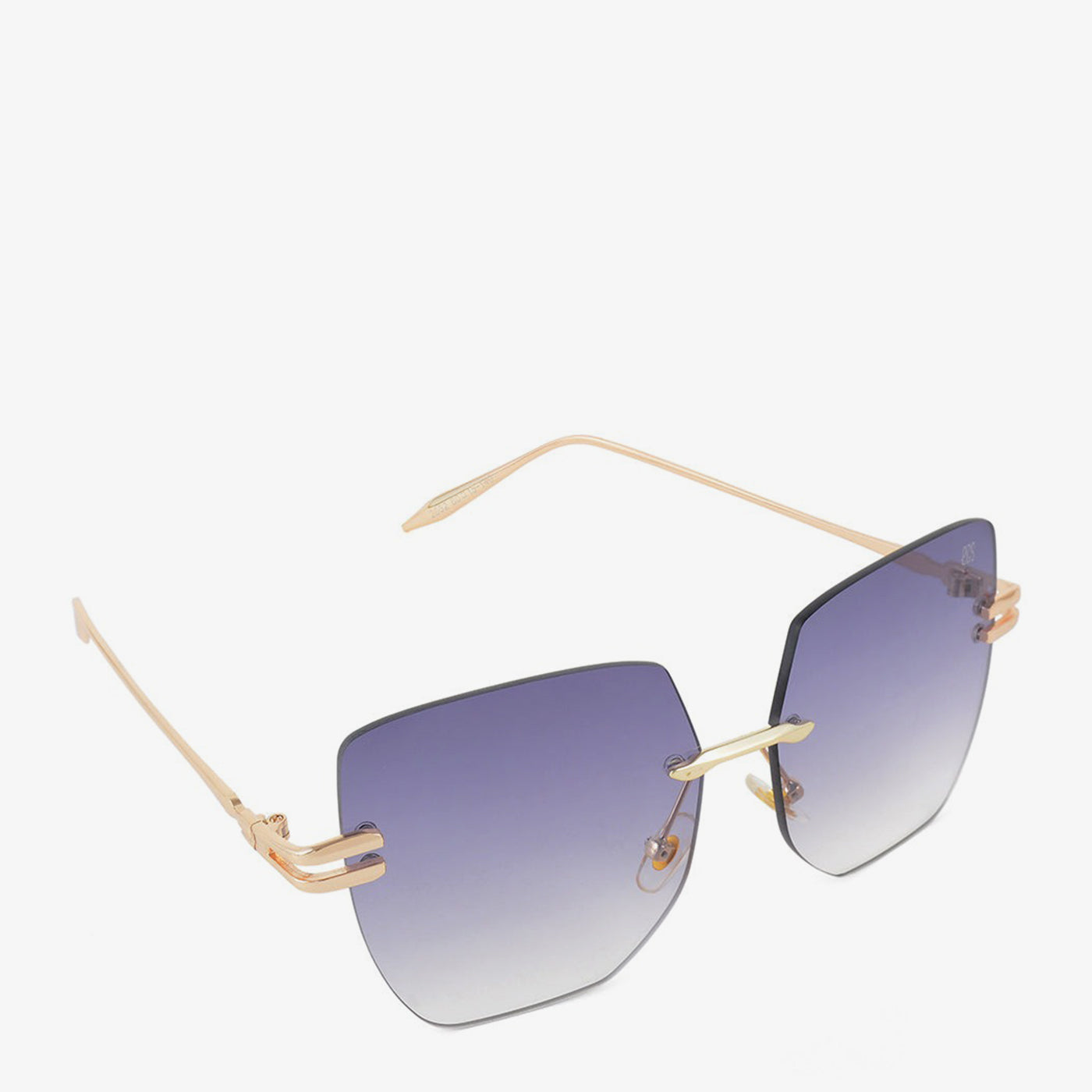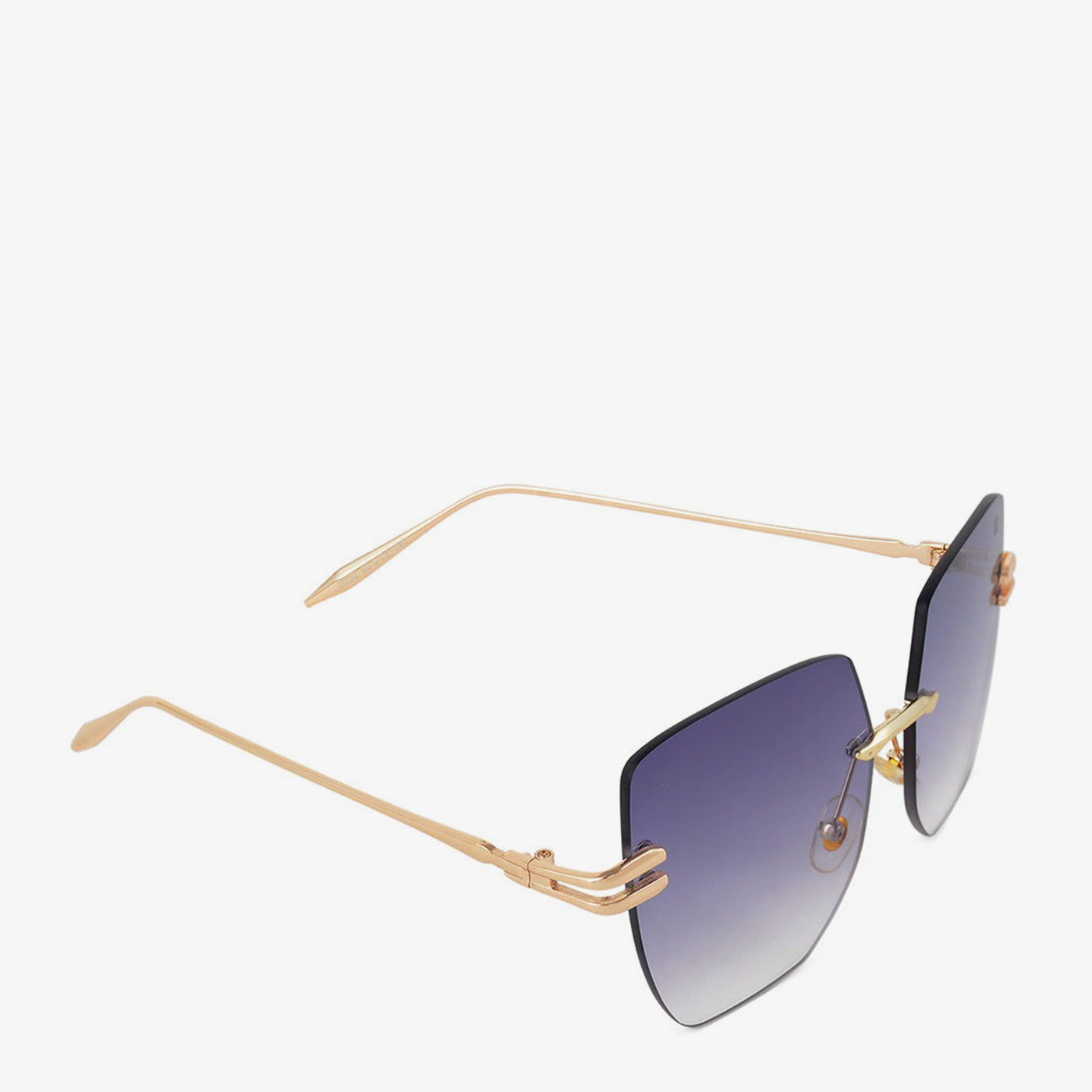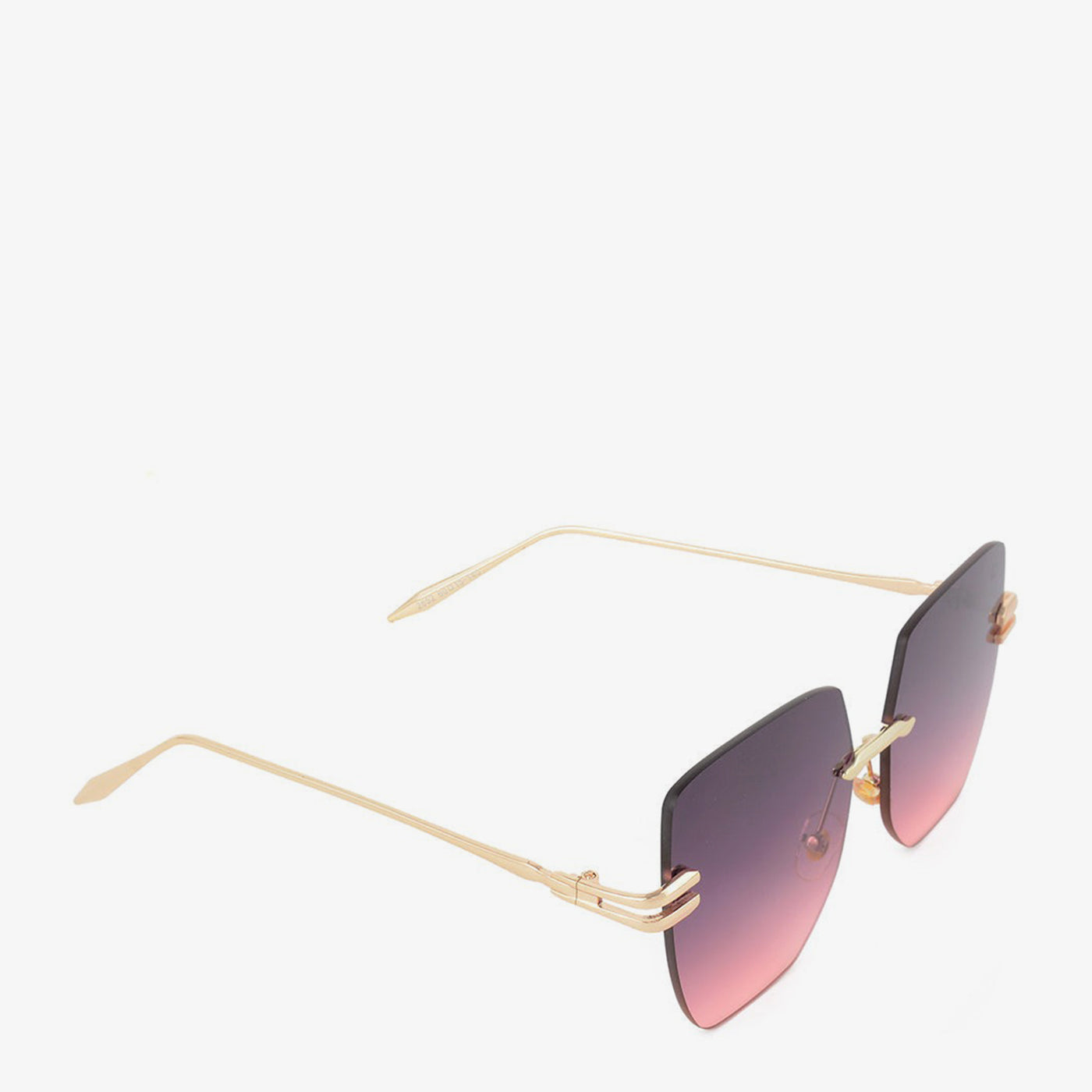 These modern rimless sunglasses feature a unique geometric lens shape with gold metallic accents. The lenses have a warm brown gradient. A stylish and contemporary accessory.