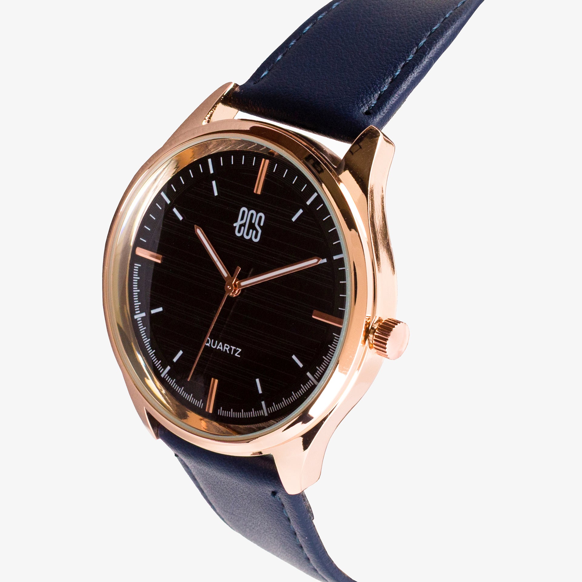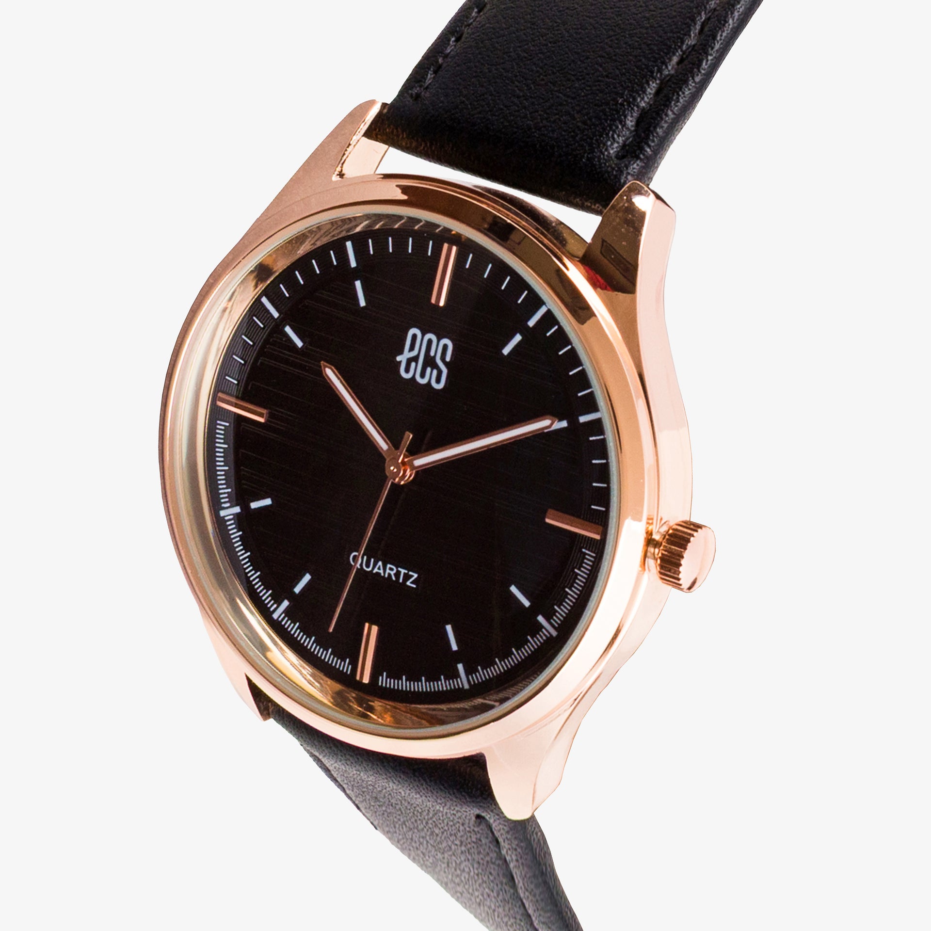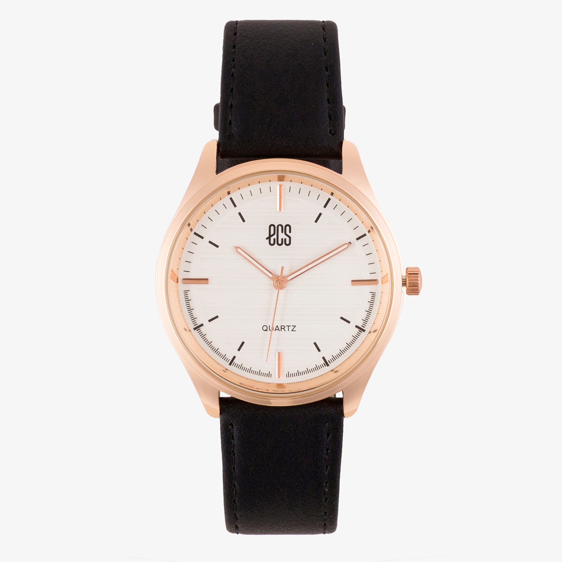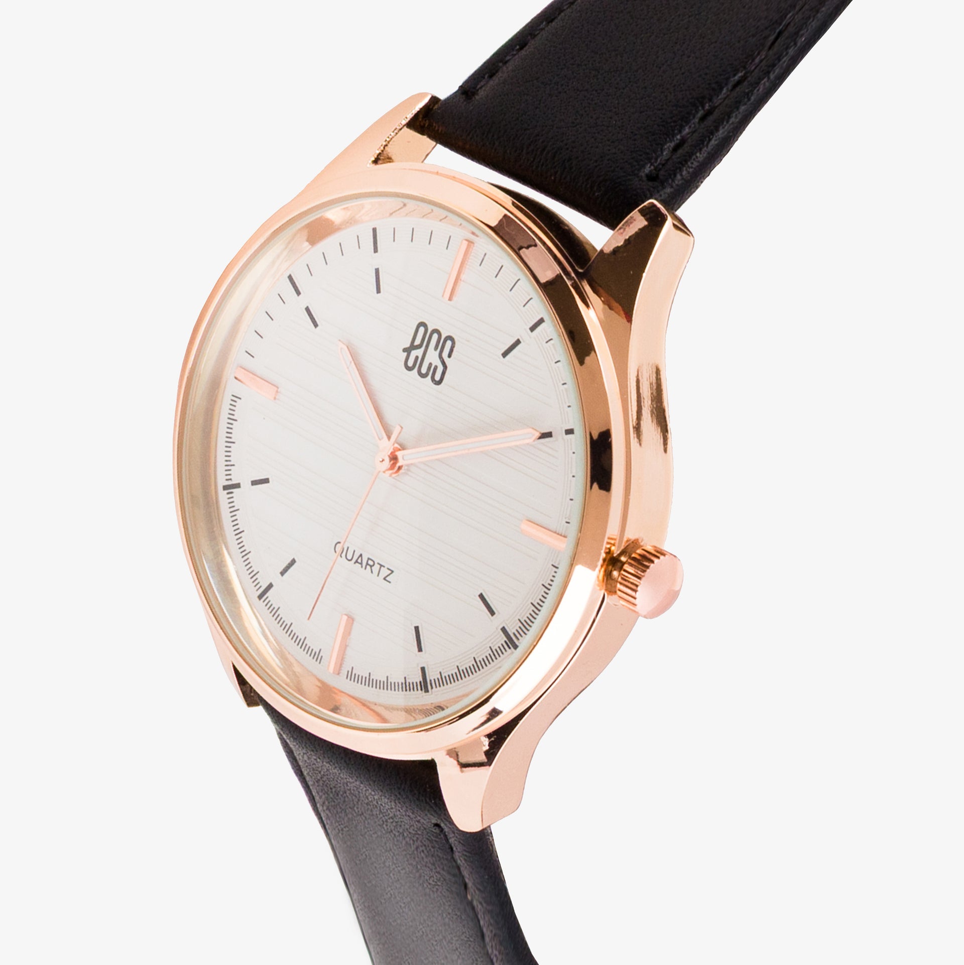 A sleek analogue watch with a rose-gold frame and linear dial texture, designed for understated elegance. It blends modern simplicity with a classic silhouette.