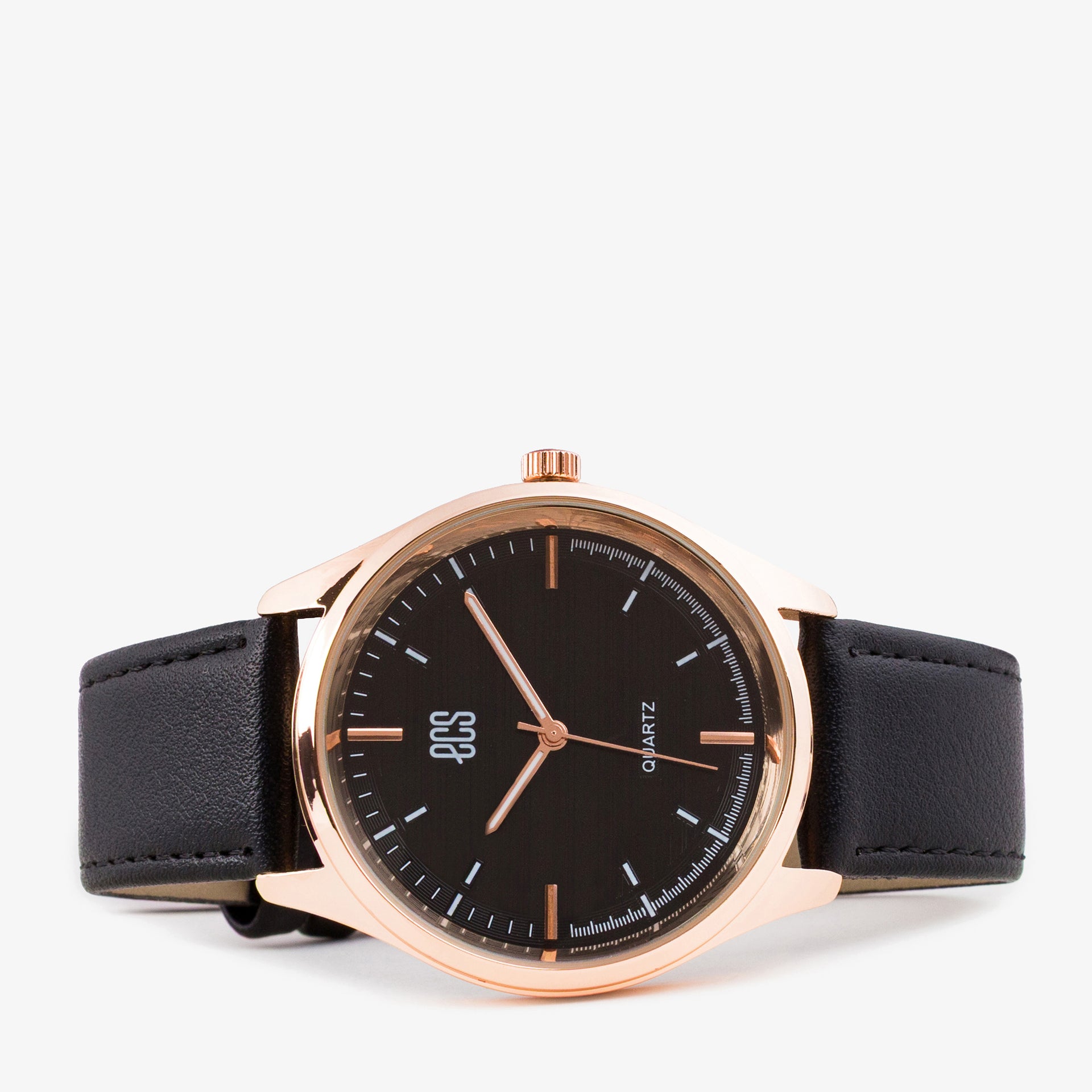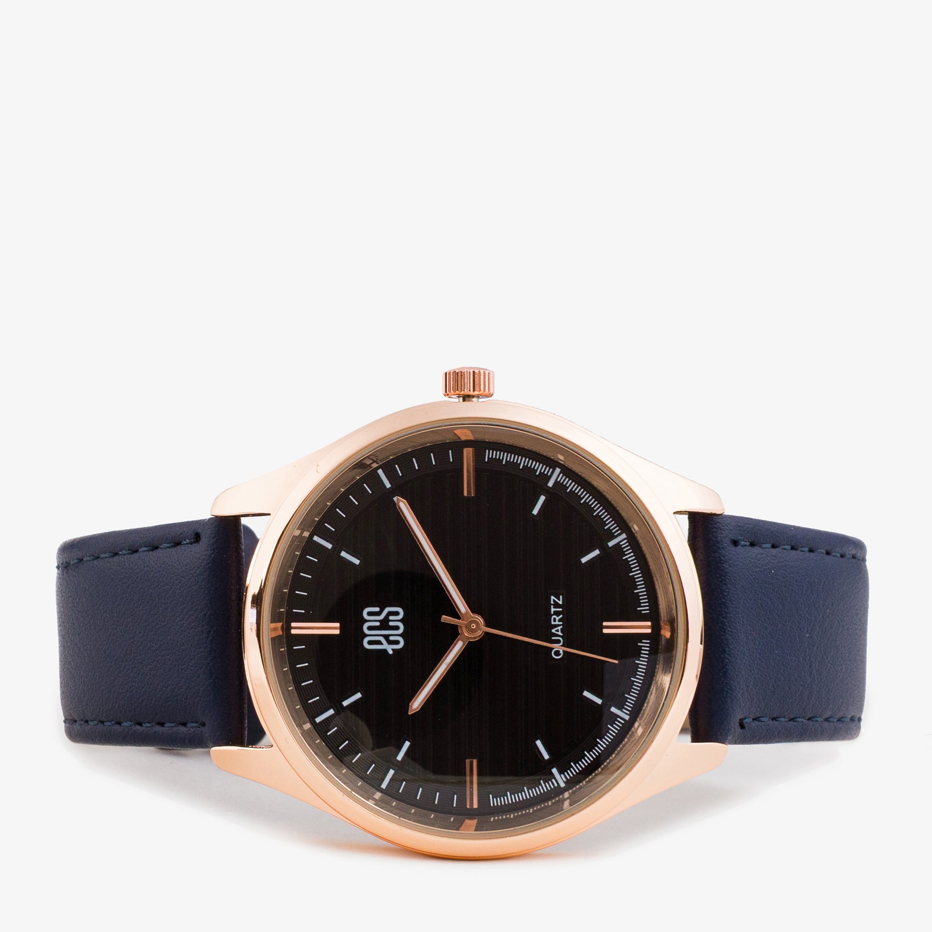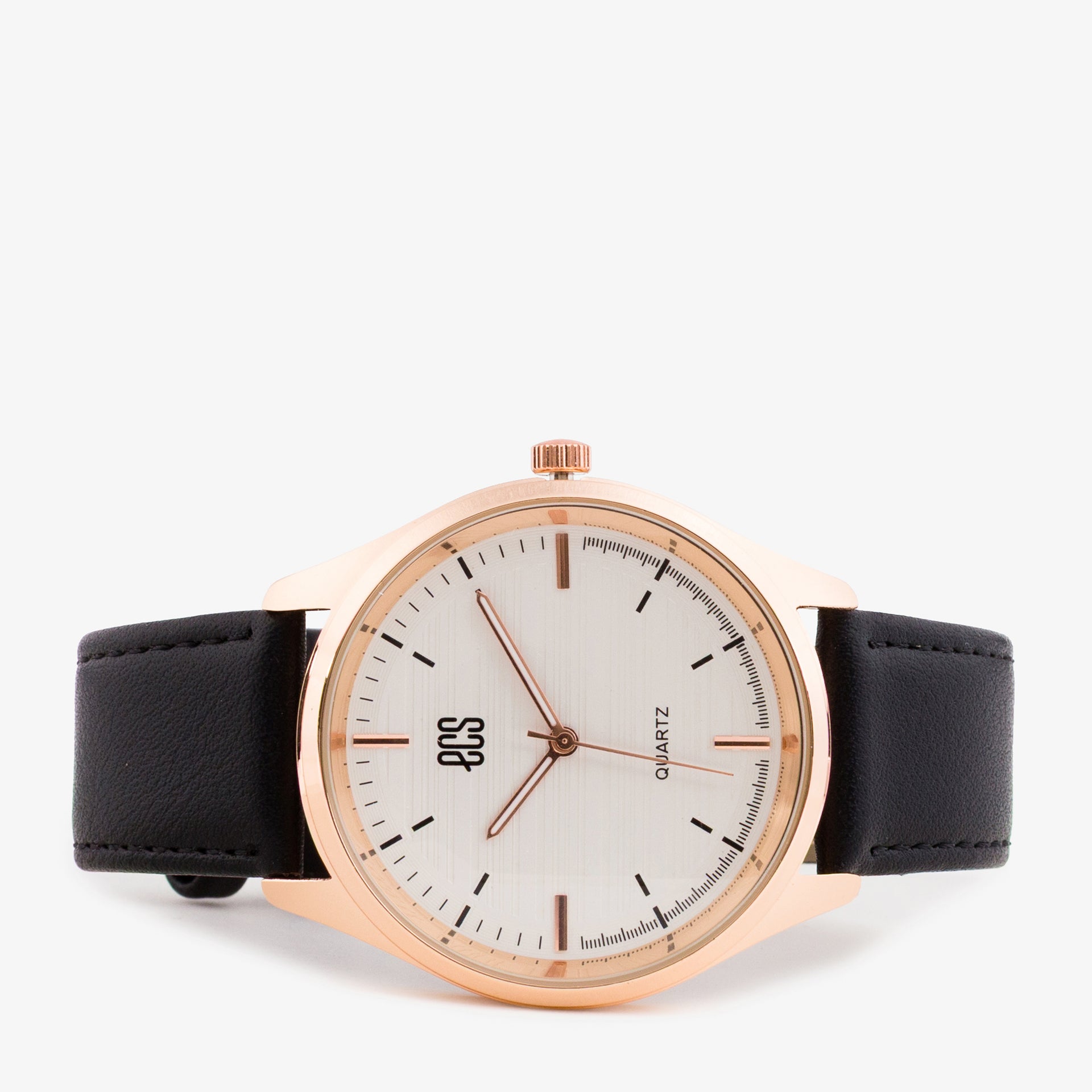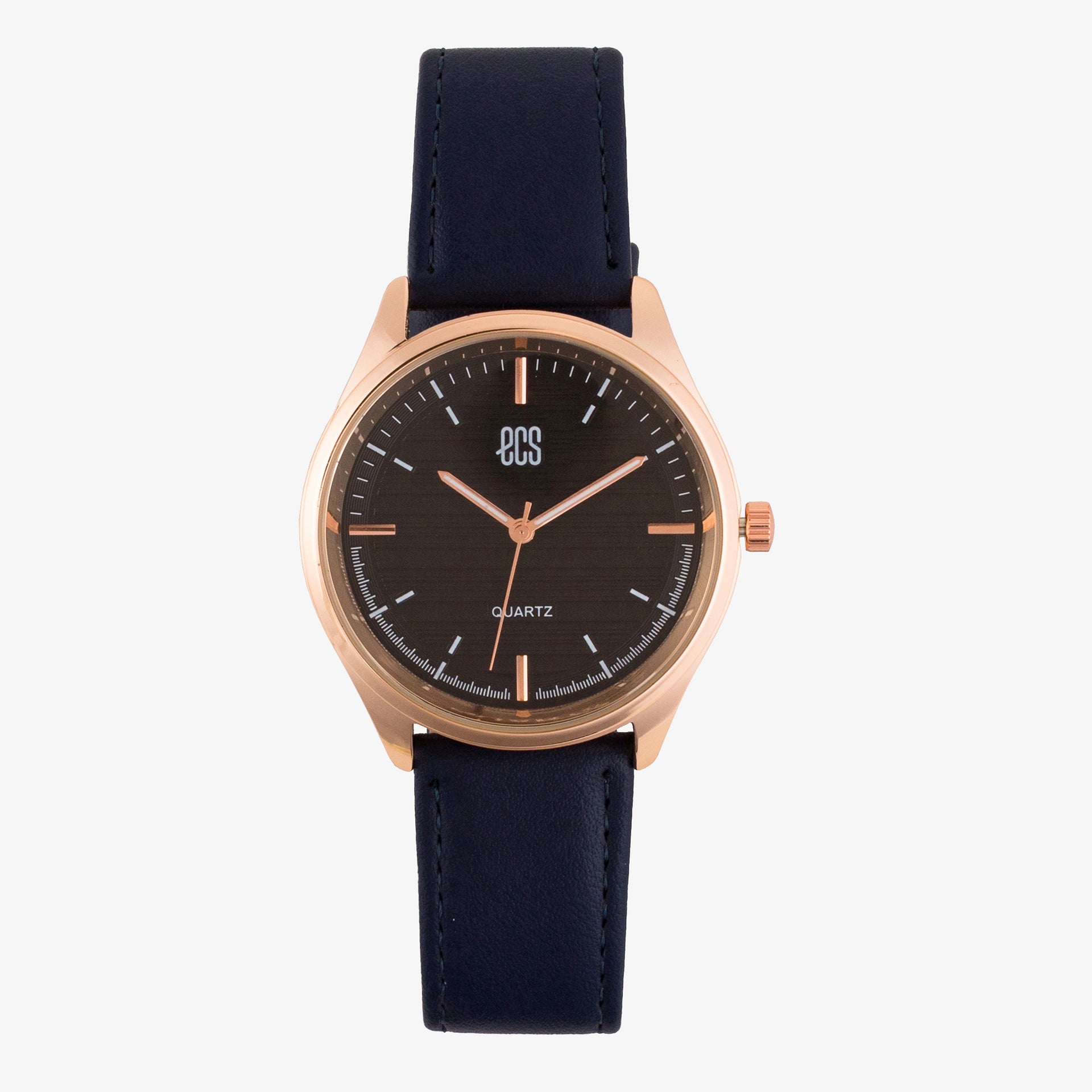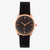 A sleek analogue watch with a rose-gold frame and linear dial texture, designed for understated elegance. It blends modern simplicity with a classic silhouette.