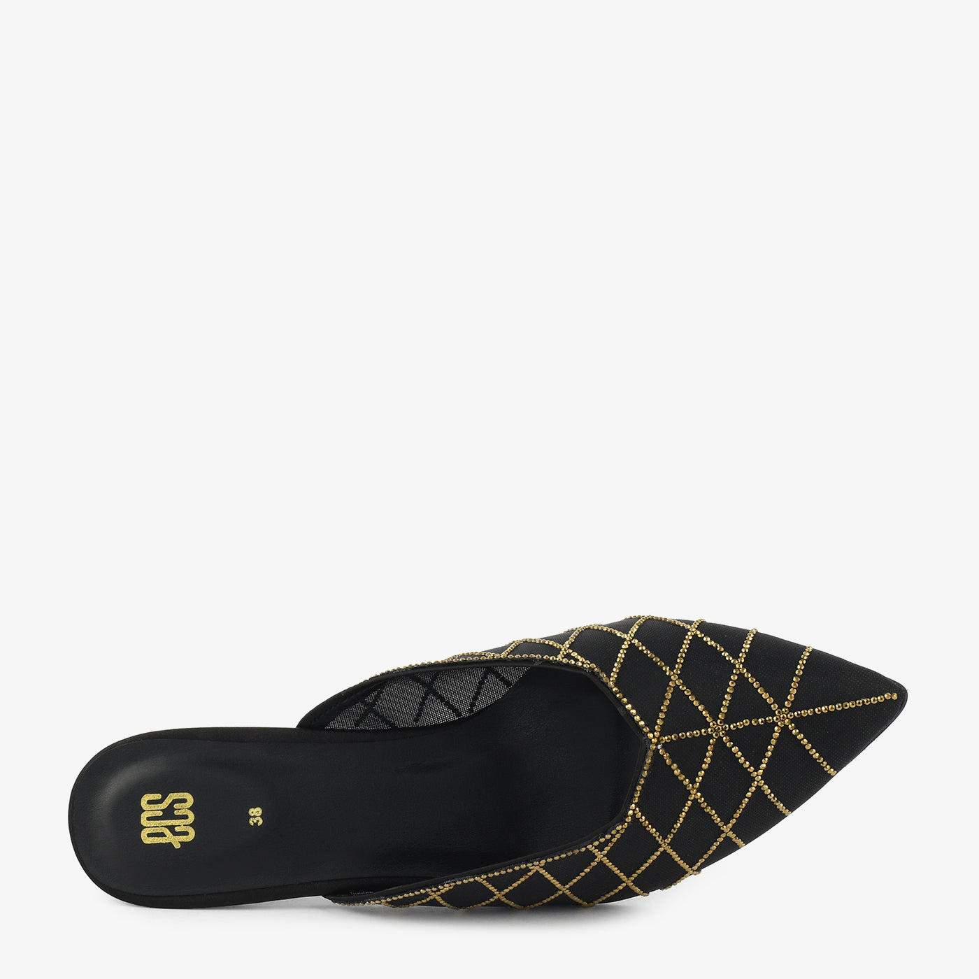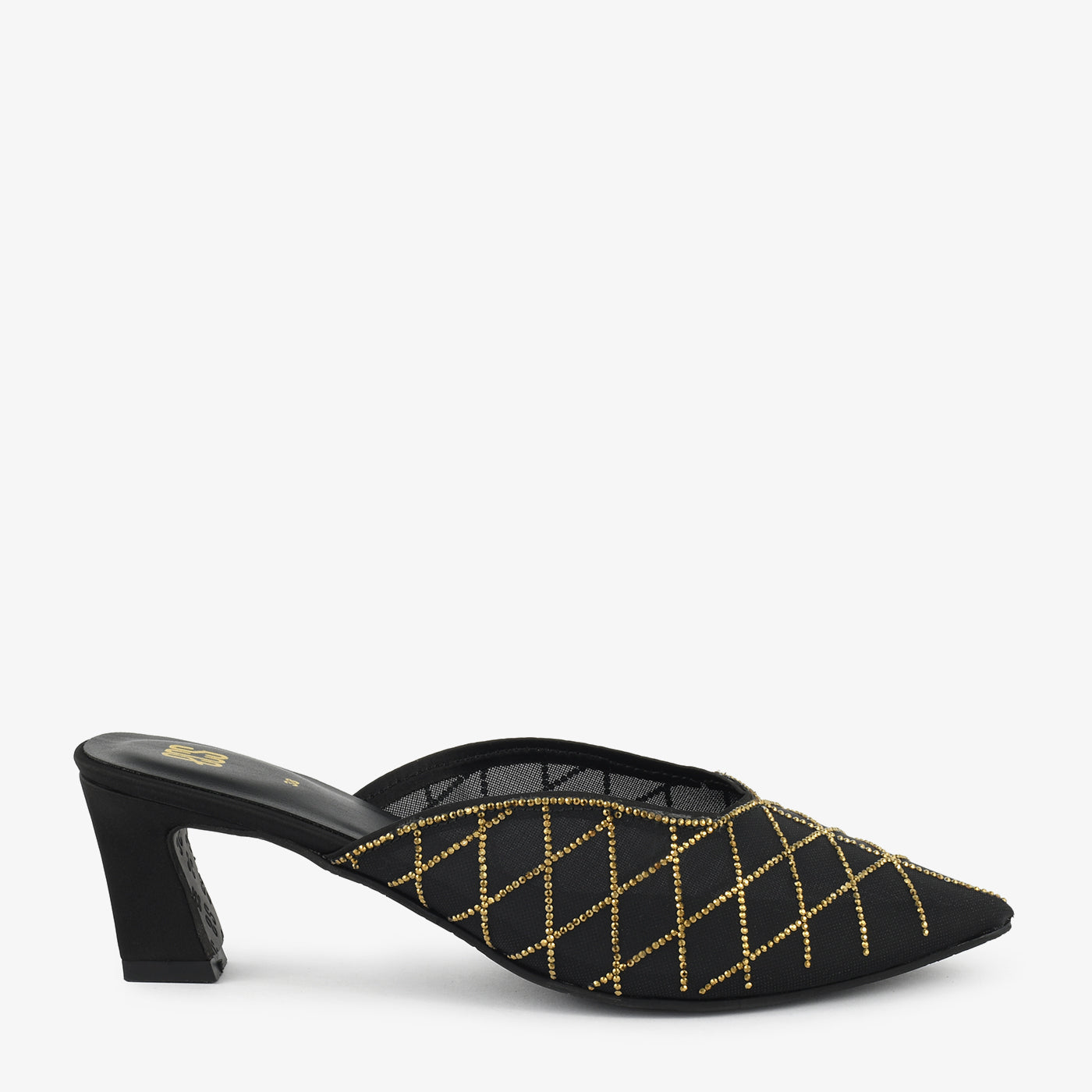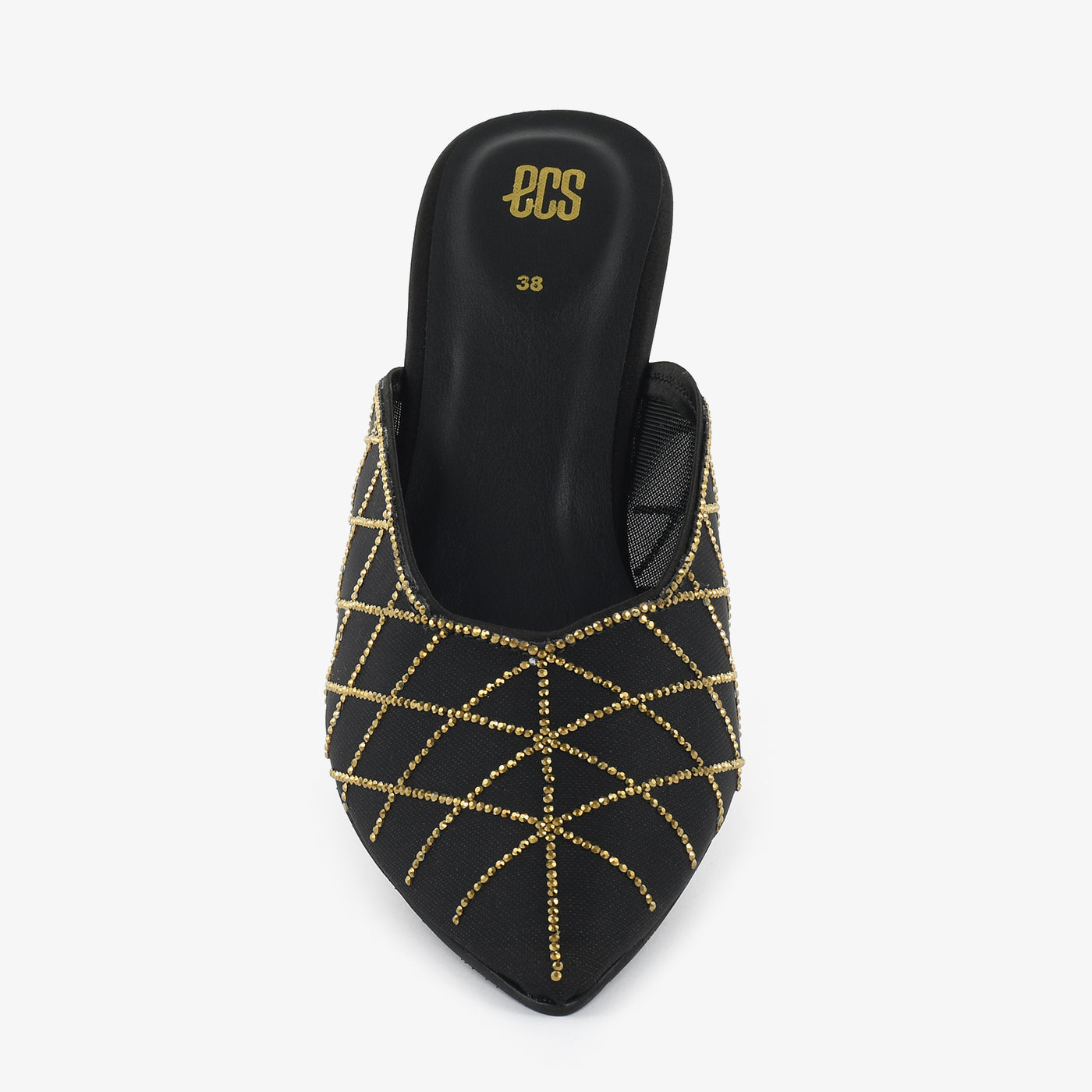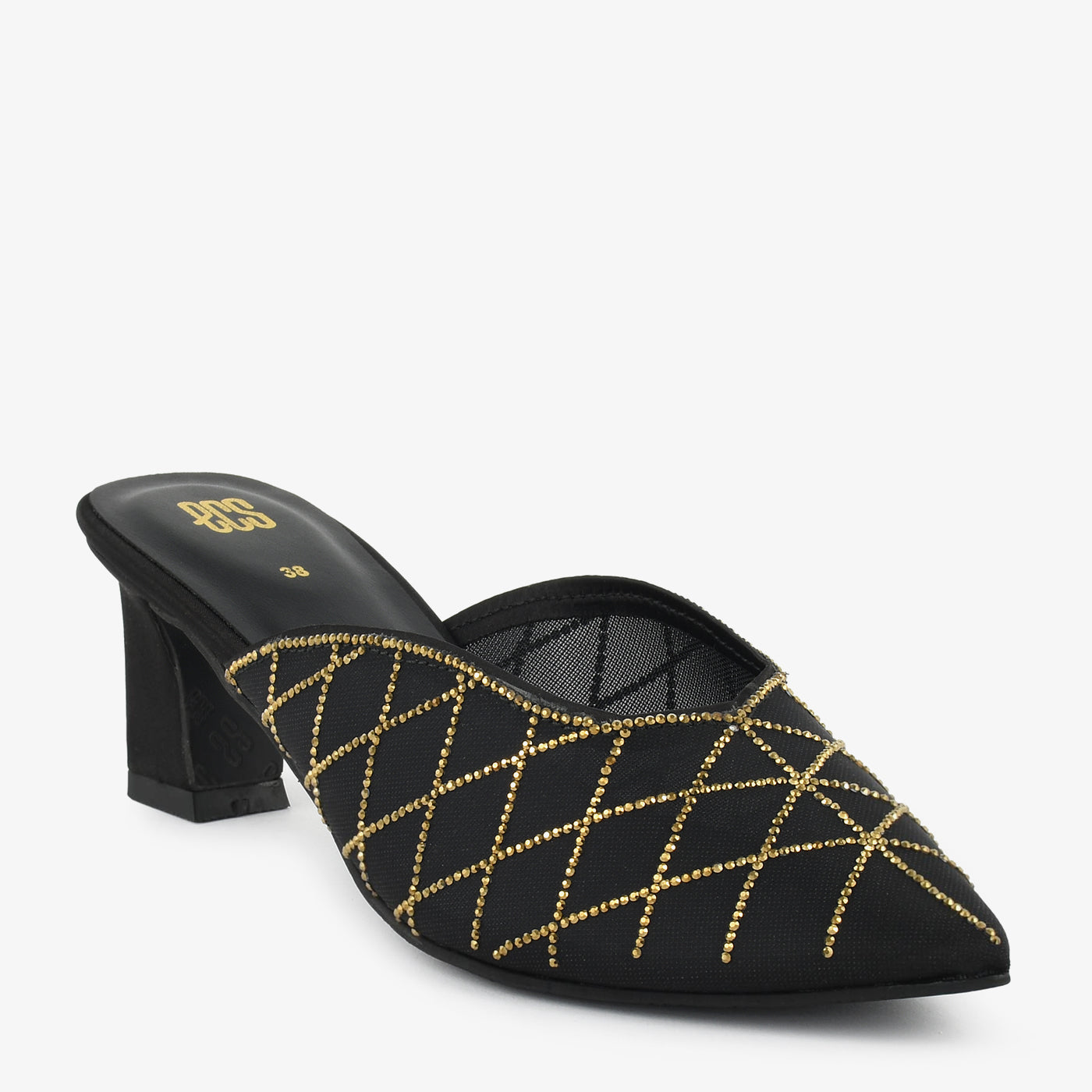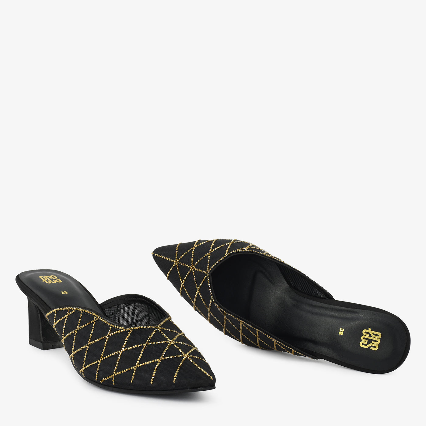 A stylish slip-on mule crafted with a delicate geometric woven pattern enhanced with fine embellishments. The pointed silhouette adds sophistication while offering easy wear. The mid-height heel makes it suitable for festive gatherings, cultural celebrations, and evening events. Lightweight construction ensures extended comfort. A beautiful blend of tradition-inspired detailing and modern mule design.