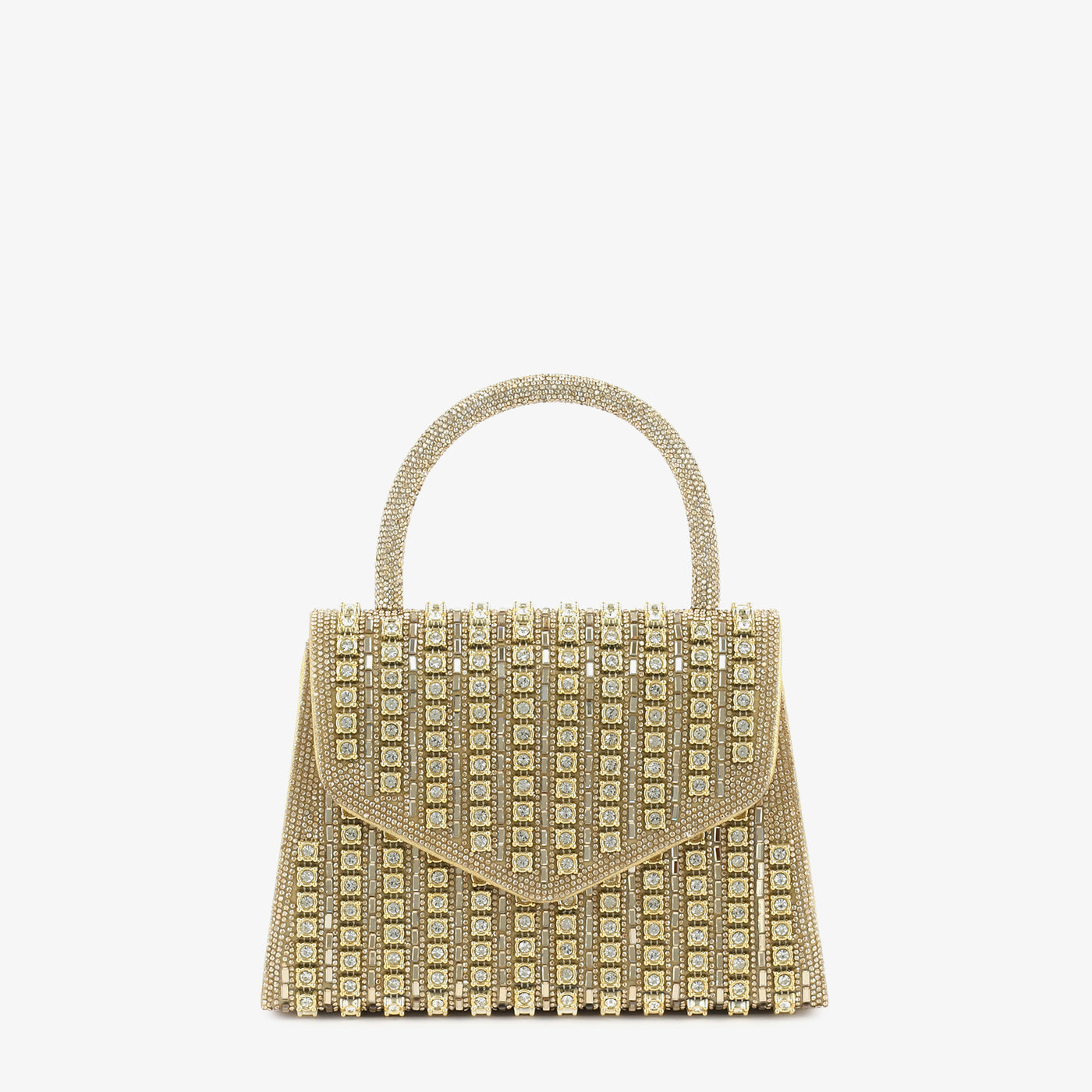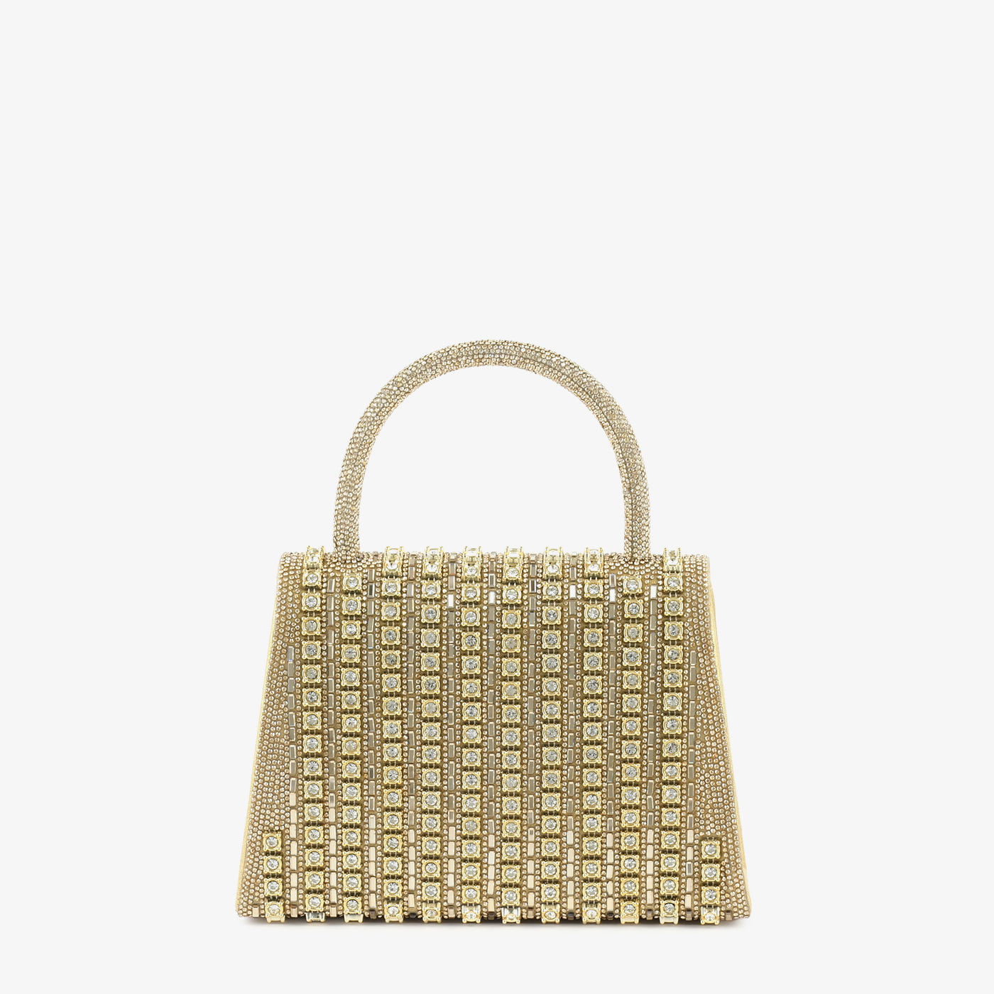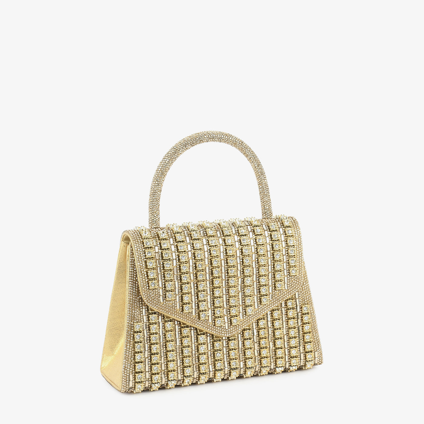 This structured gold handbag is adorned with square crystal embellishments, giving it a radiant sparkle perfect for evening events. Its top handle and geometric flap closure add elegance while ensuring practicality. The shimmering grid design creates a statement accessory that catches light beautifully.