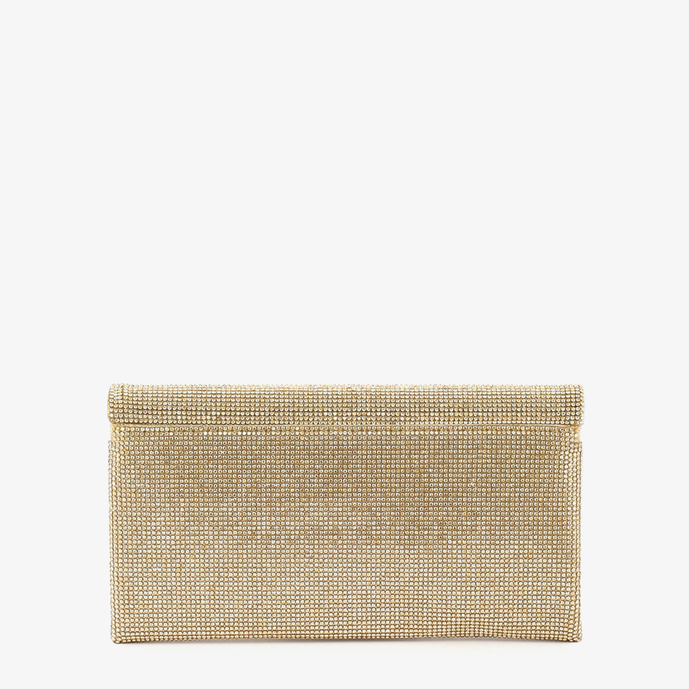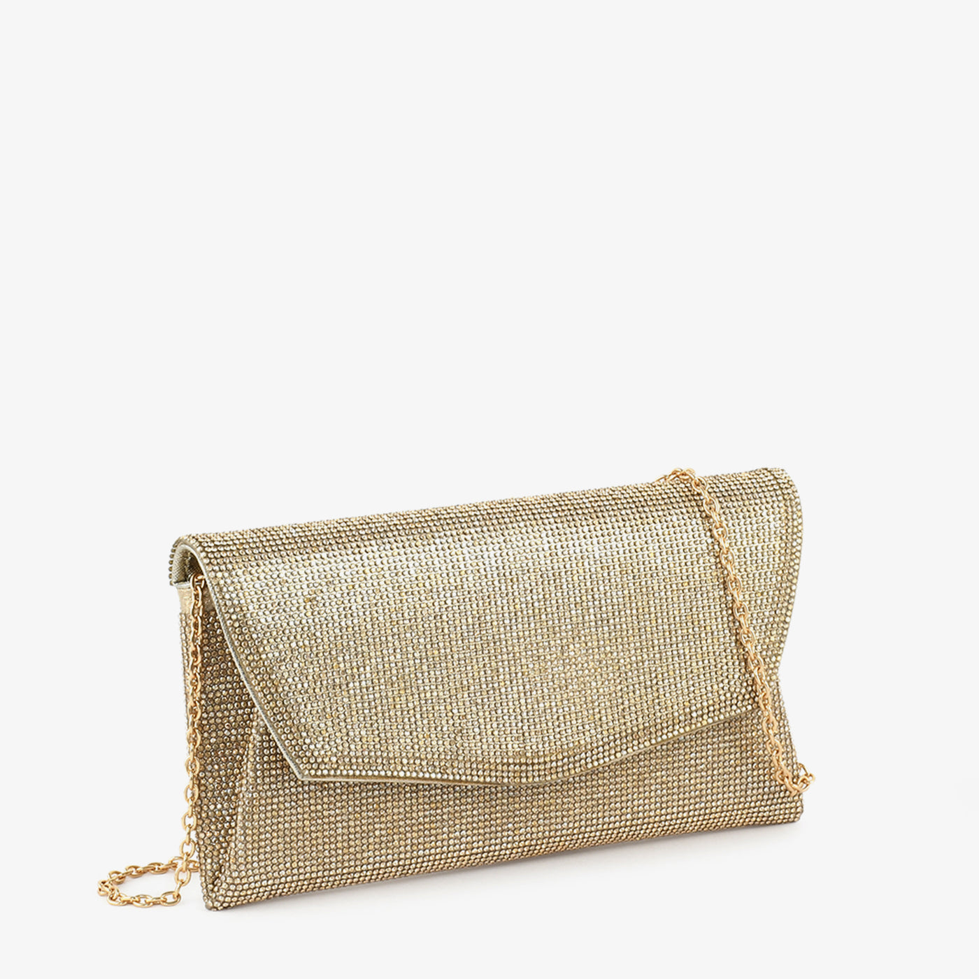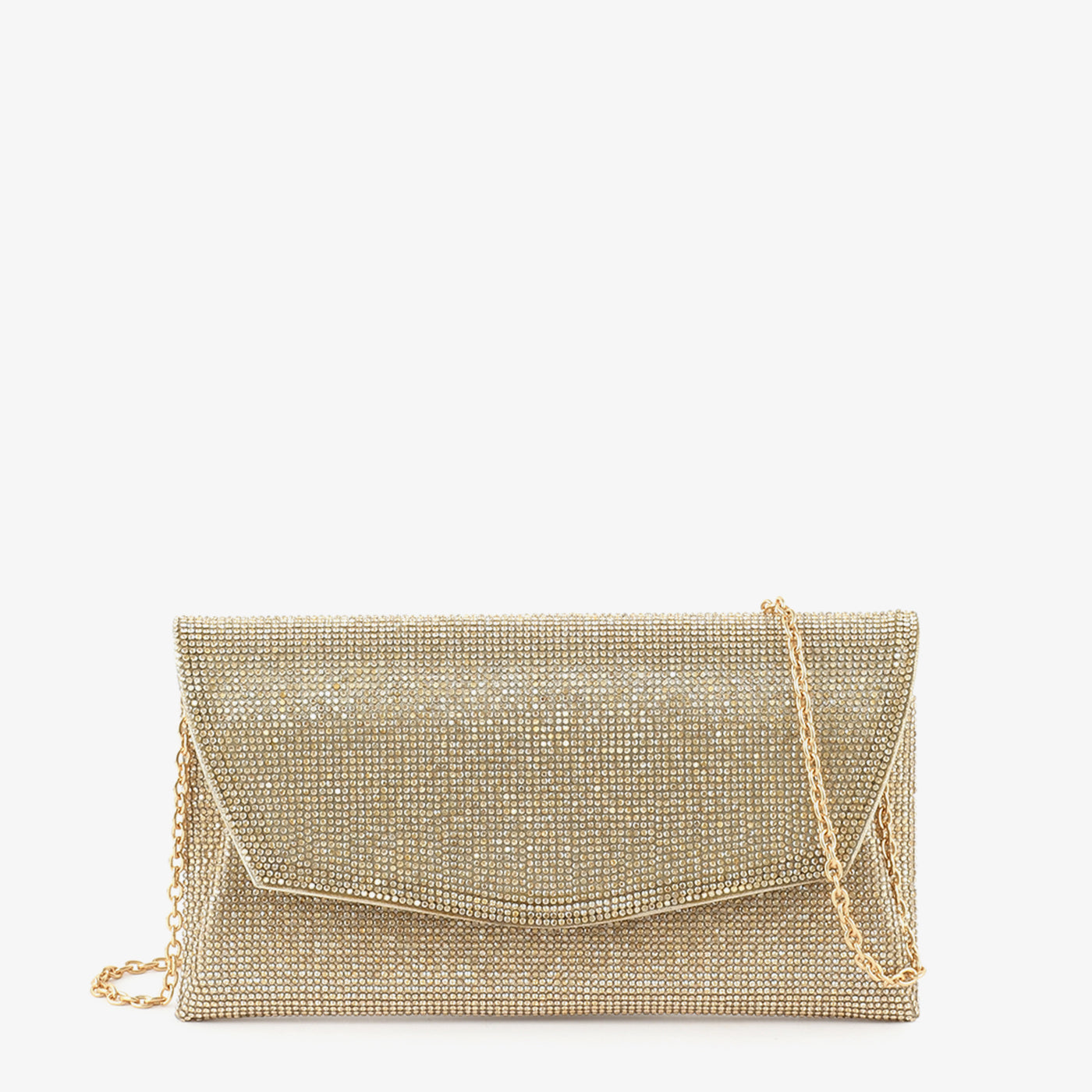 Defined by its sleek silhouette and dazzling finish, this clutch brings modern elegance to the forefront. Its envelope flap design is elevated by full-surface crystal embellishments and a slim chain for versatile styling.