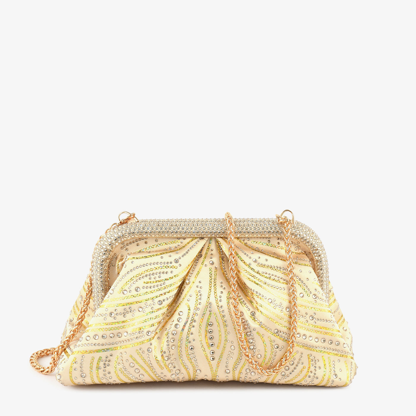 This vintage-style purse is reimagined with dramatic pleats and a wave of sparkling embellishments across a satin-like base. The curved metal frame and twisted chain enhance its old-world...
