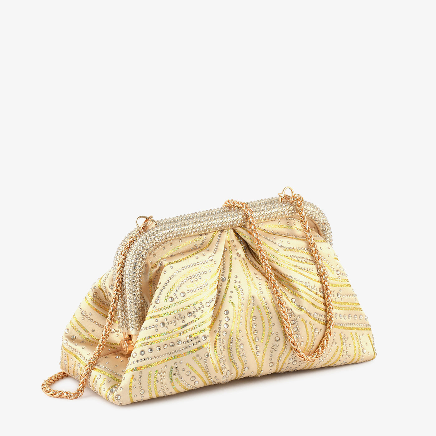 This vintage-style purse is reimagined with dramatic pleats and a wave of sparkling embellishments across a satin-like base. The curved metal frame and twisted chain enhance its old-world charm.