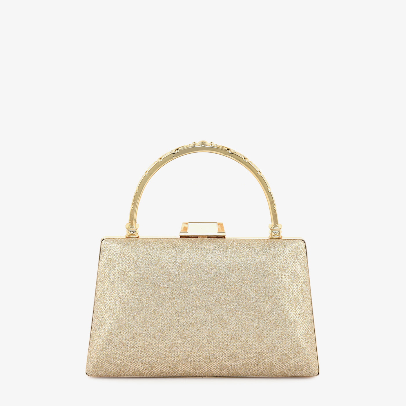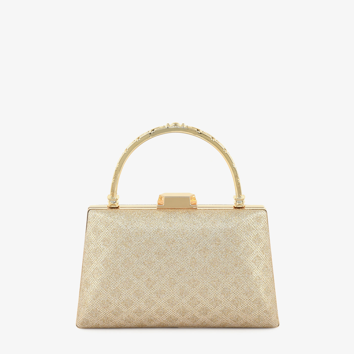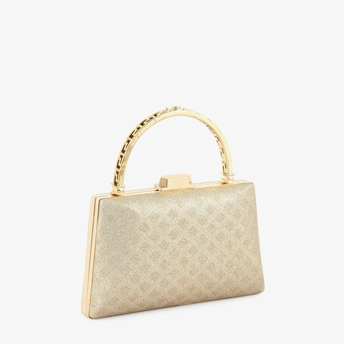 ...Step into refined elegance with the "Grace Bag." Its textured gold finish and structured silhouette, paired with a statement handle, make it the perfect companion for upscale occasions.
