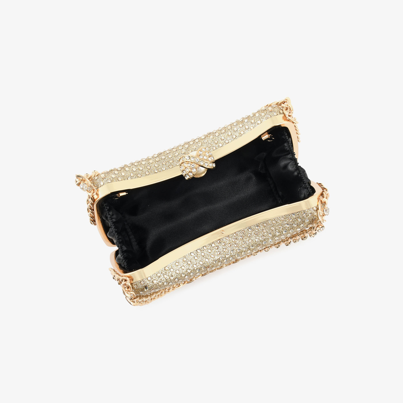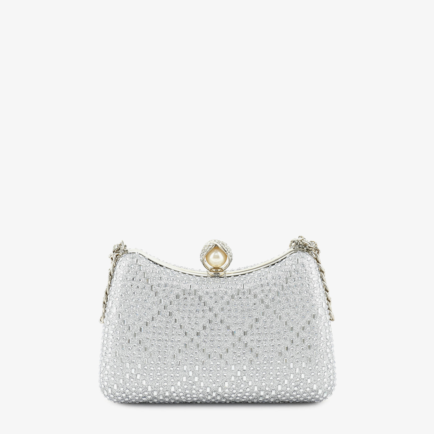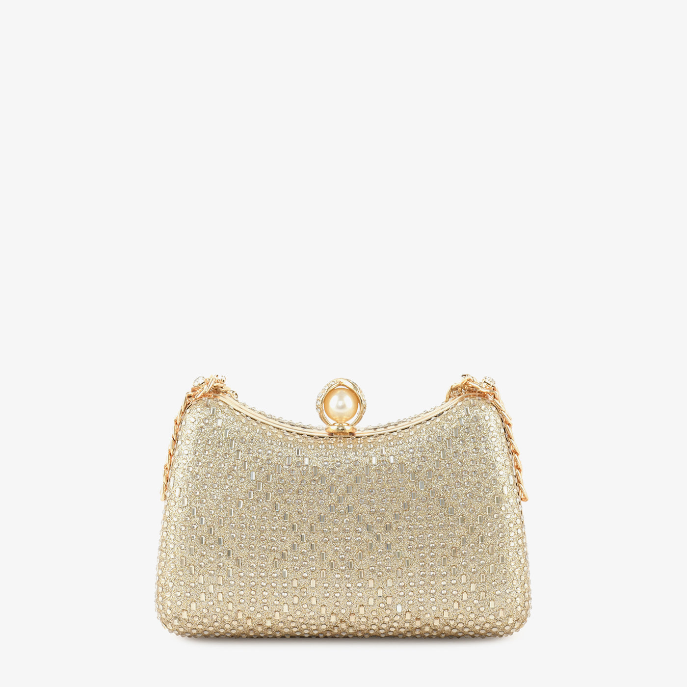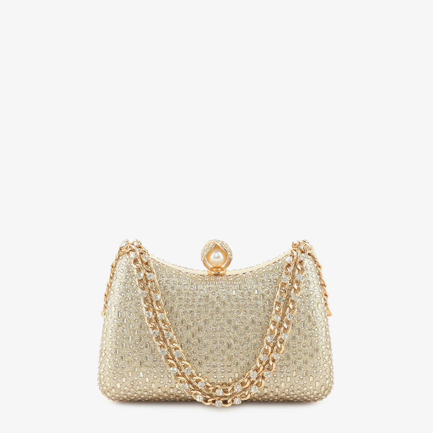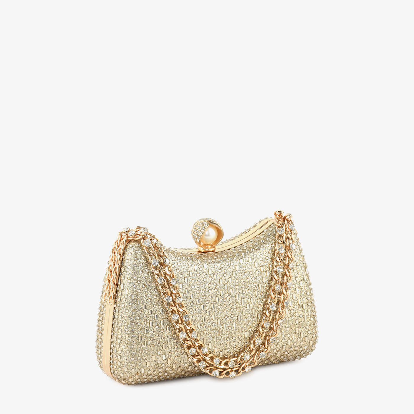 Elevate your accessory game with the "Pearl Charm Clutch." Covered in dazzling crystals, it’s adorned with a pearl-accent clasp and dual gold chains for added glamour.