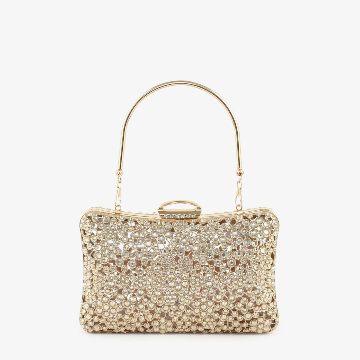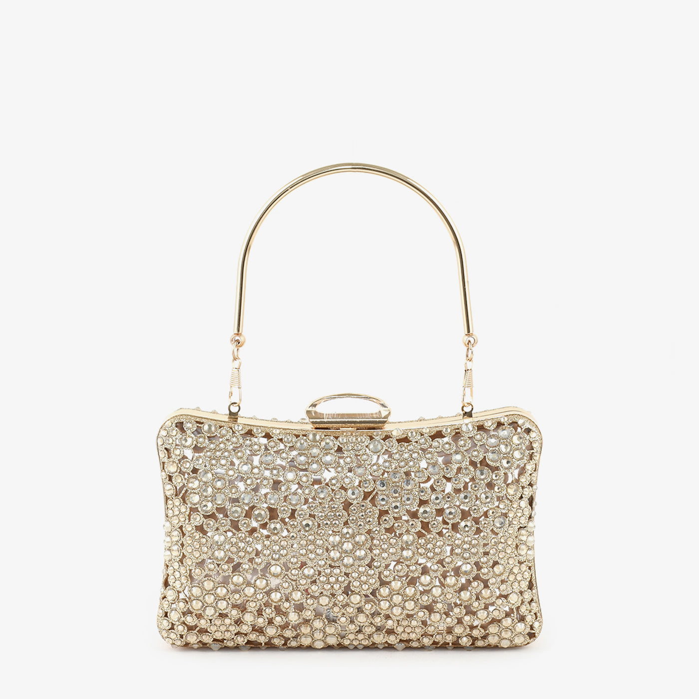 An ultra-glamorous clutch covered in multi-sized sparkling stones. It adds drama and draws attention instantly.