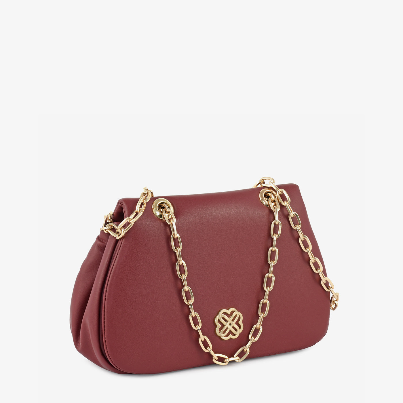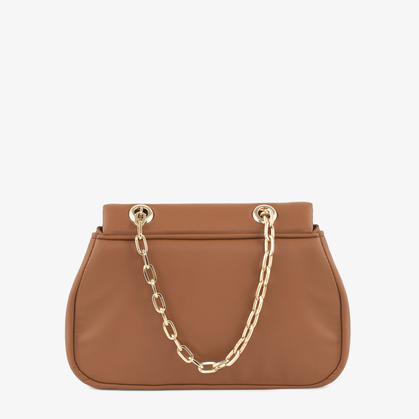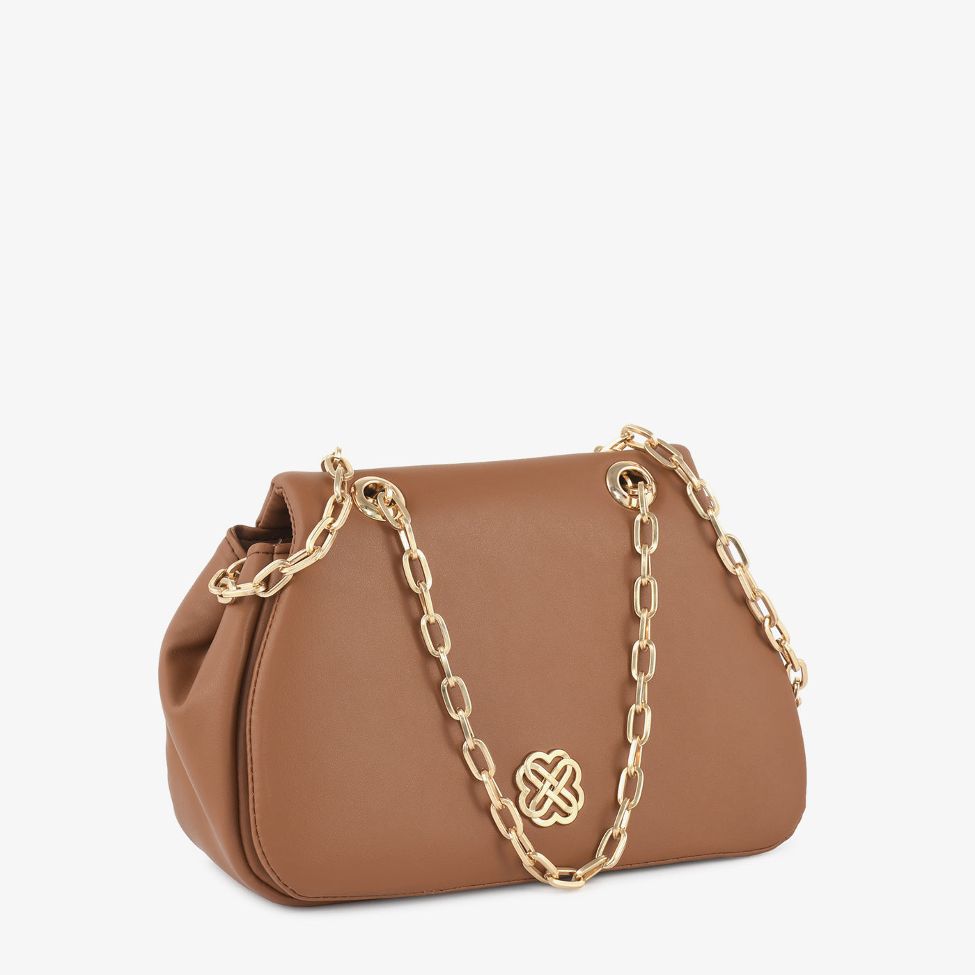 This shoulder bag features a graceful rounded design with gold chain straps. The metallic emblem detail enhances its elegant look, making it a sophisticated choice for outings.