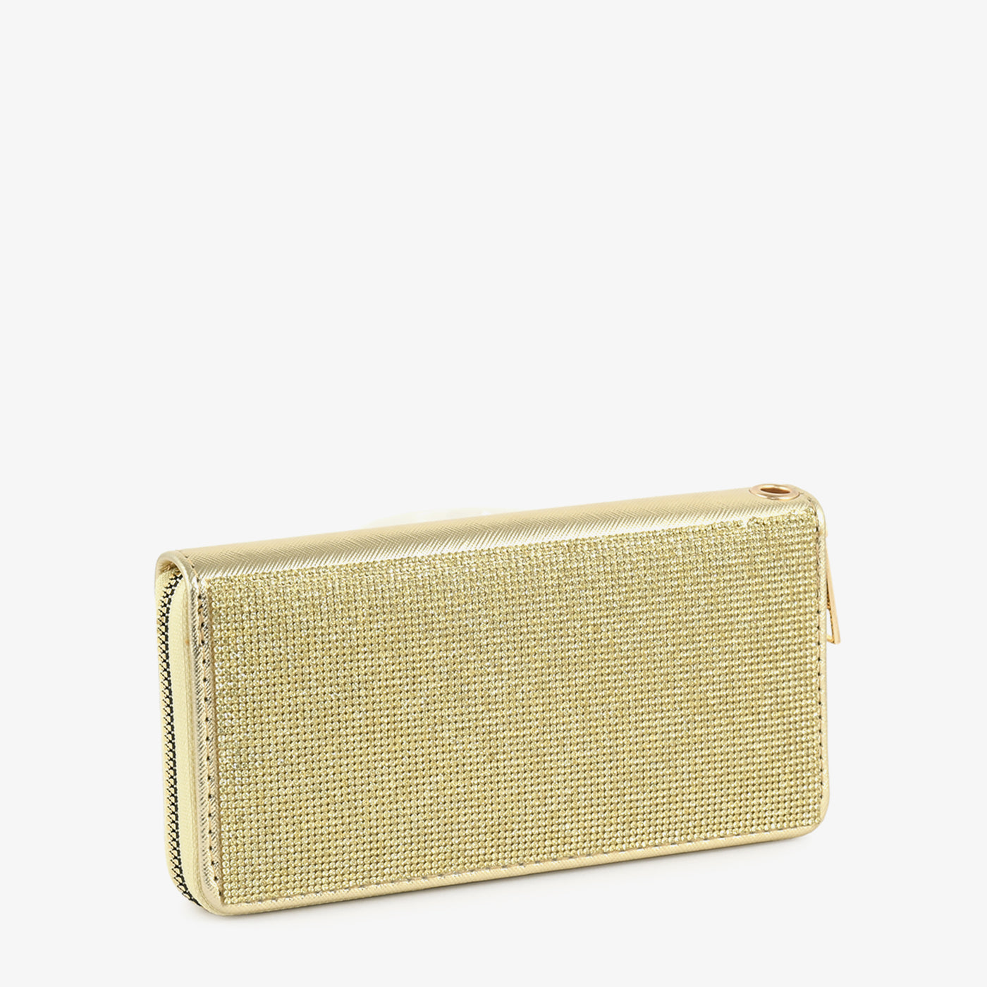 A radiant wristlet wallet adorned with a sparkling surface, blending glamour with functionality. Ideal for evenings where minimal yet chic accessories shine.