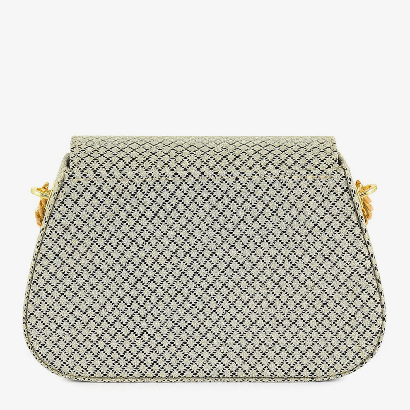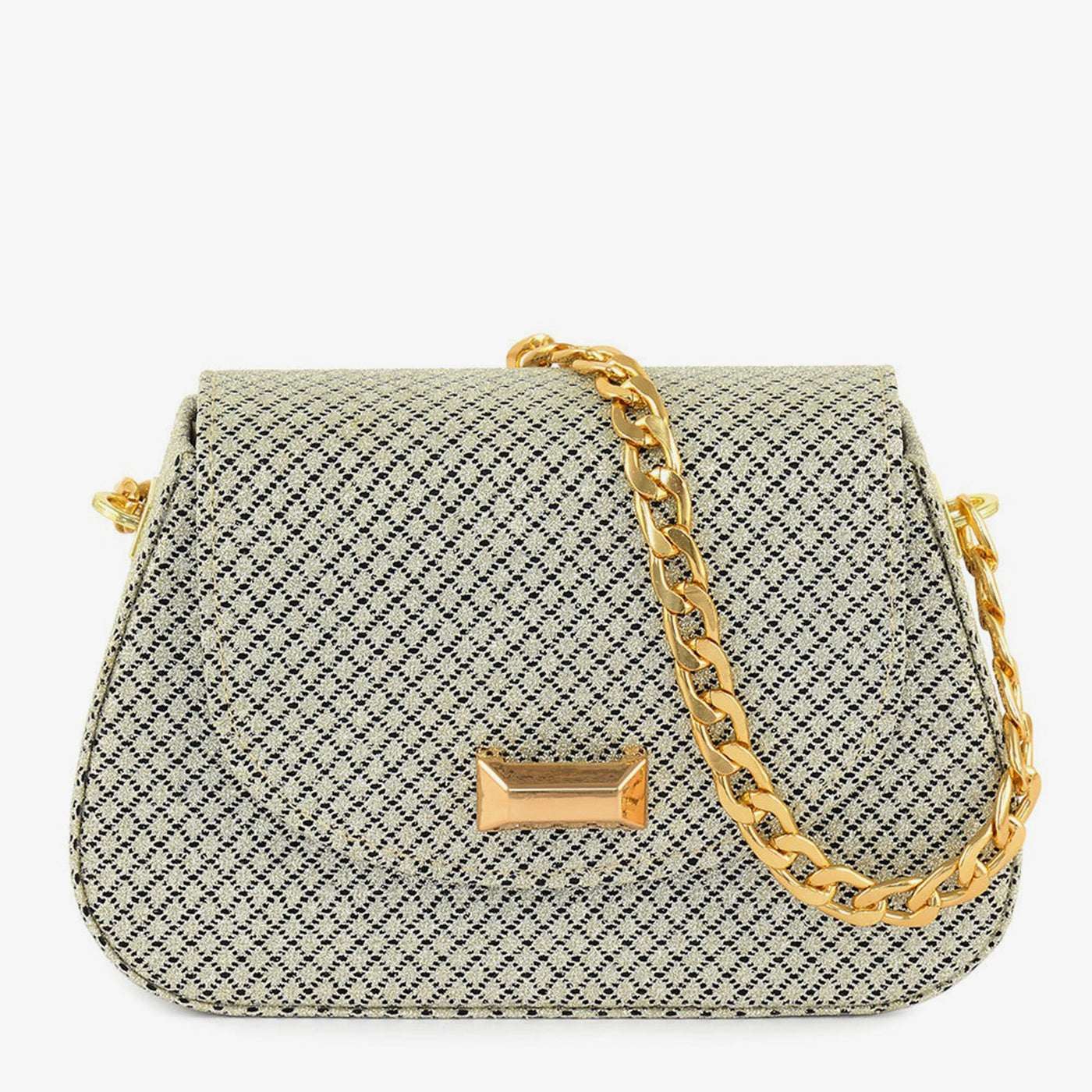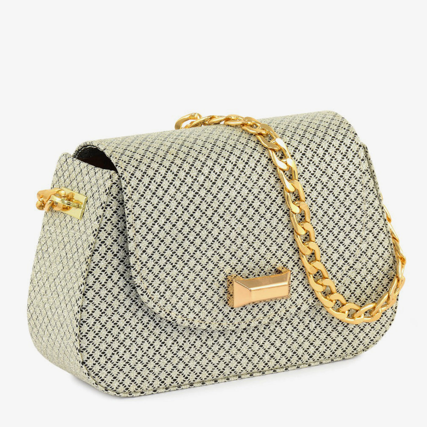 Carry your essentials with sophisticated flair in this exquisite small bag. Featuring a unique, slightly rounded rectangular silhouette and a secure flap closure, it boasts a prominent metallic clasp. Crafted from a textured material, this versatile accessory is designed to be worn with its elegant chain strap, perfect for adding a polished finish to any evening or formal ensemble.