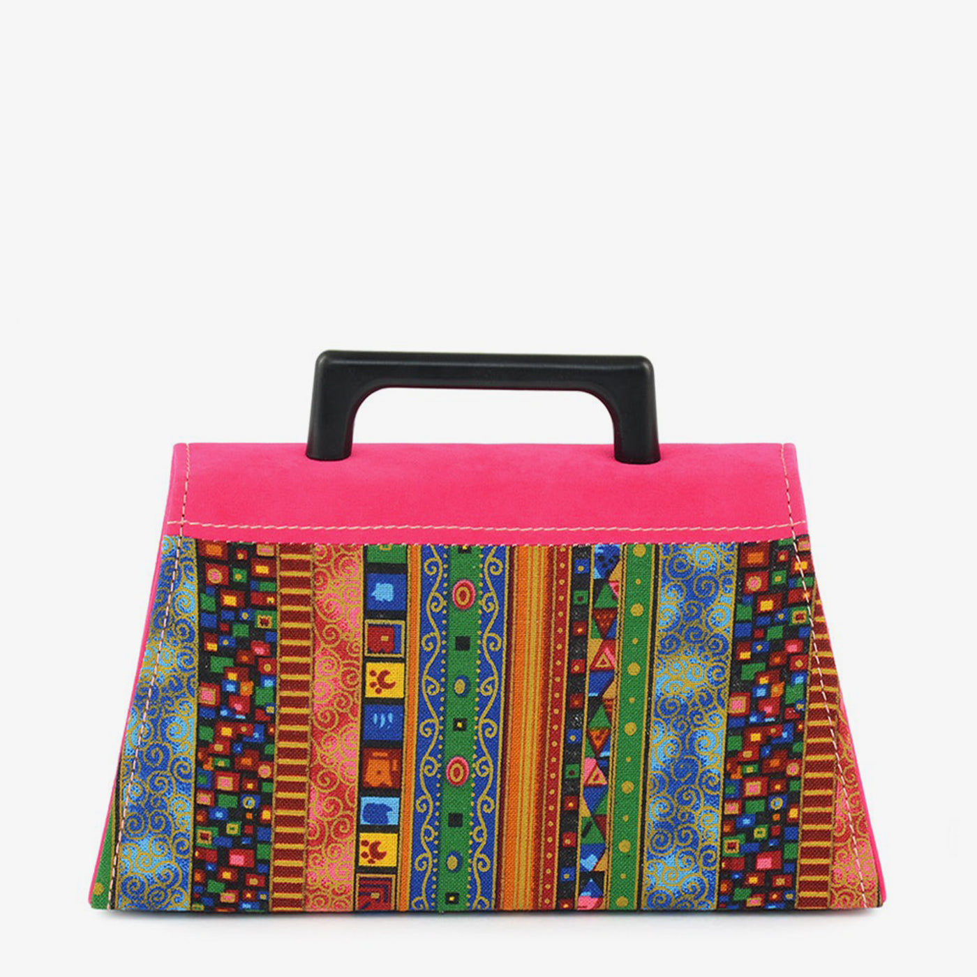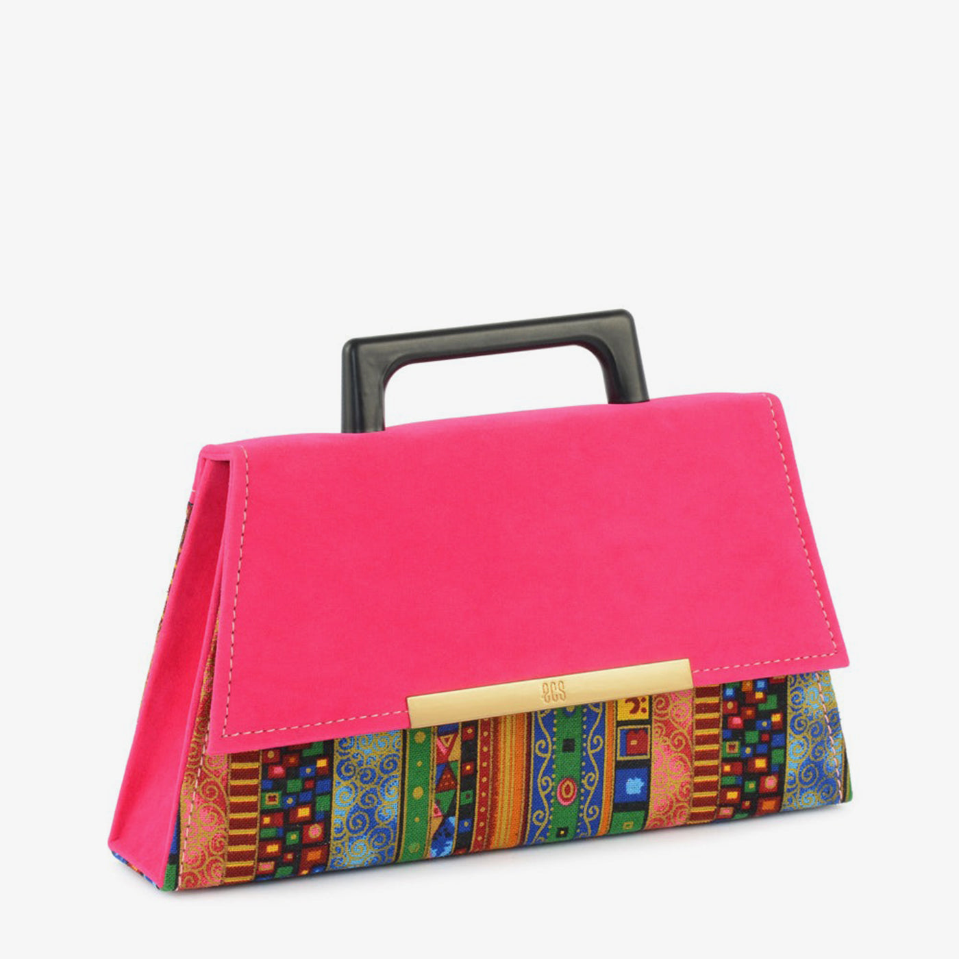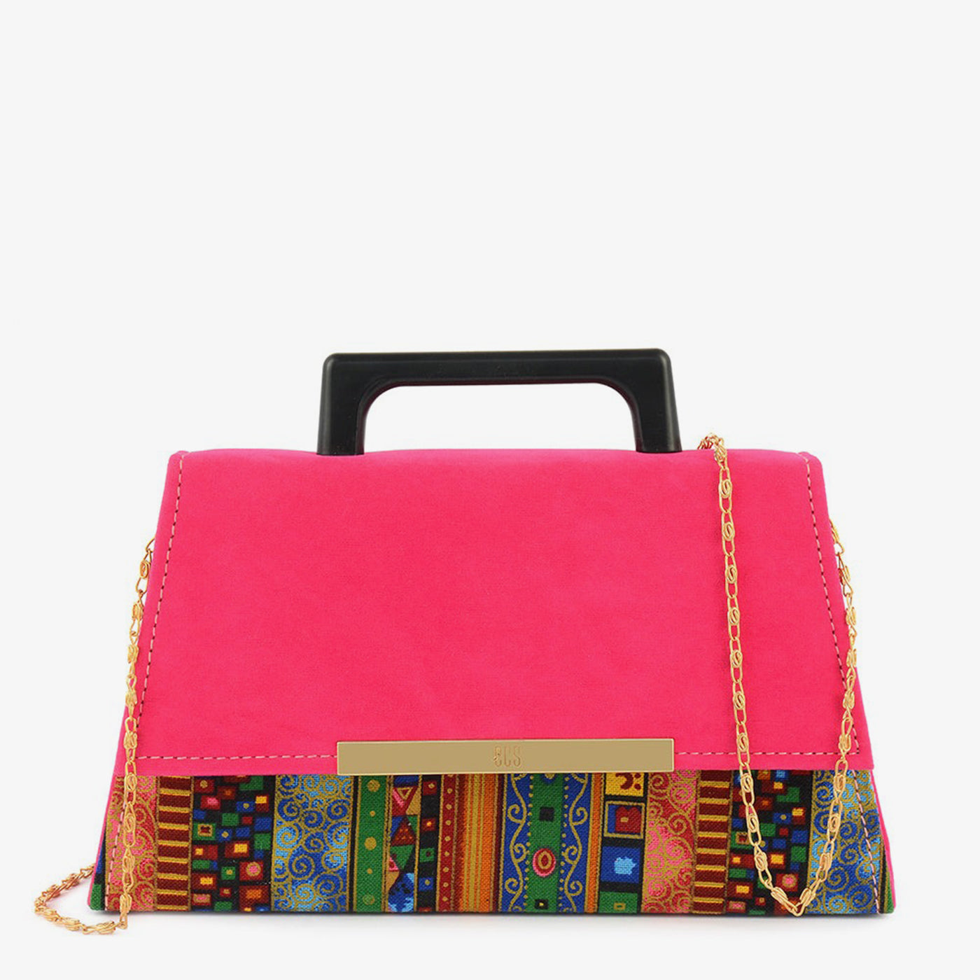 This vibrant clutch combines a bold pink suede flap with intricate multicolor ethnic patterns. A gold chain and handle give it a luxe finish.
