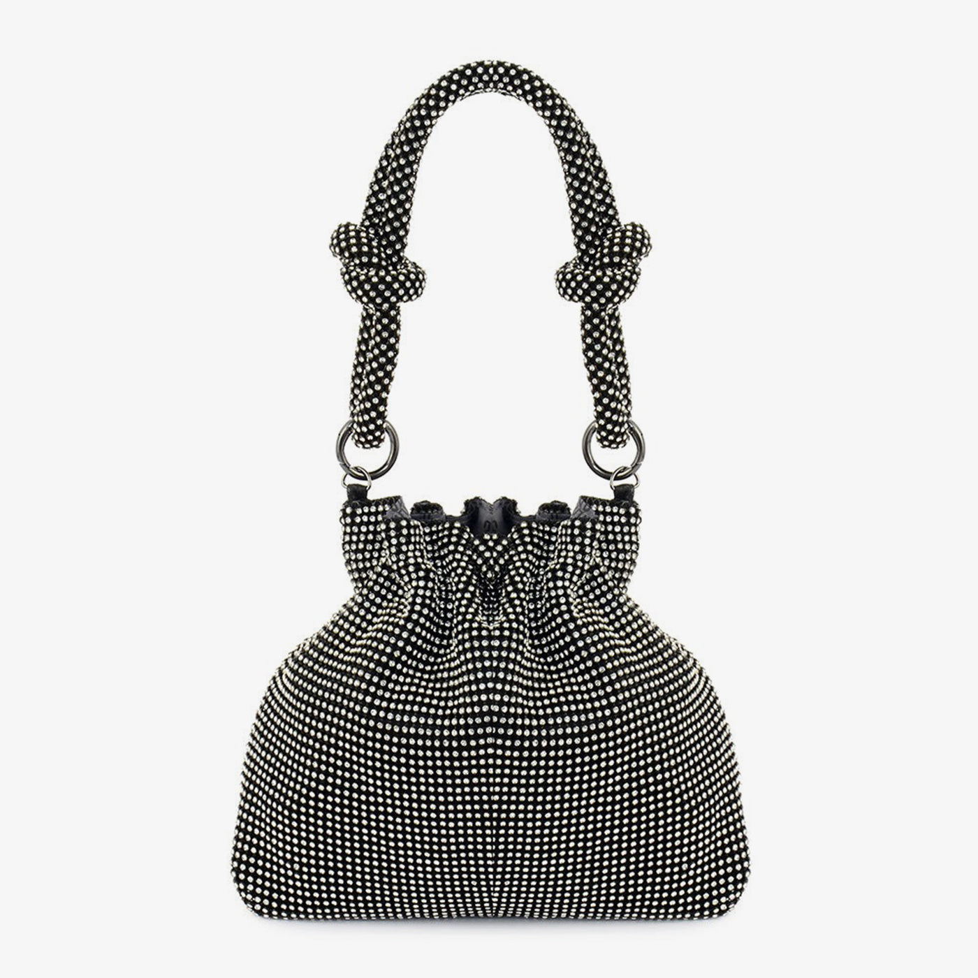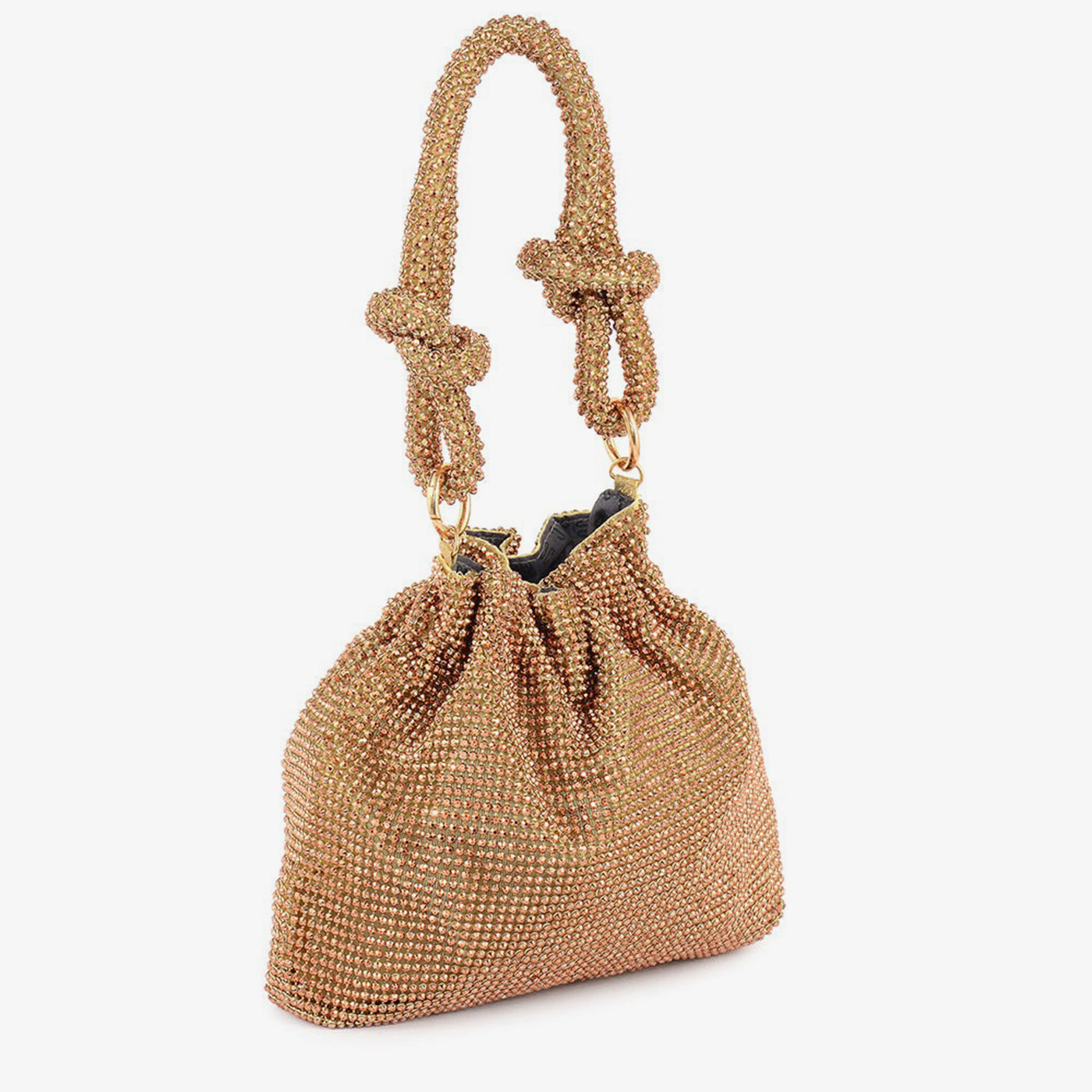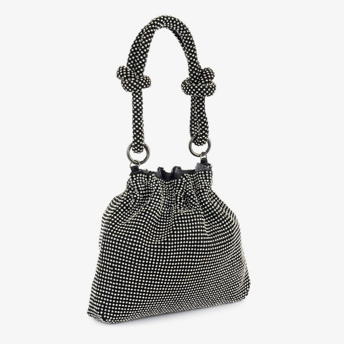 A dazzling pouch covered entirely in small, shimmering embellishments. It features a drawstring closure with unique knotted handles attached by metal rings.
