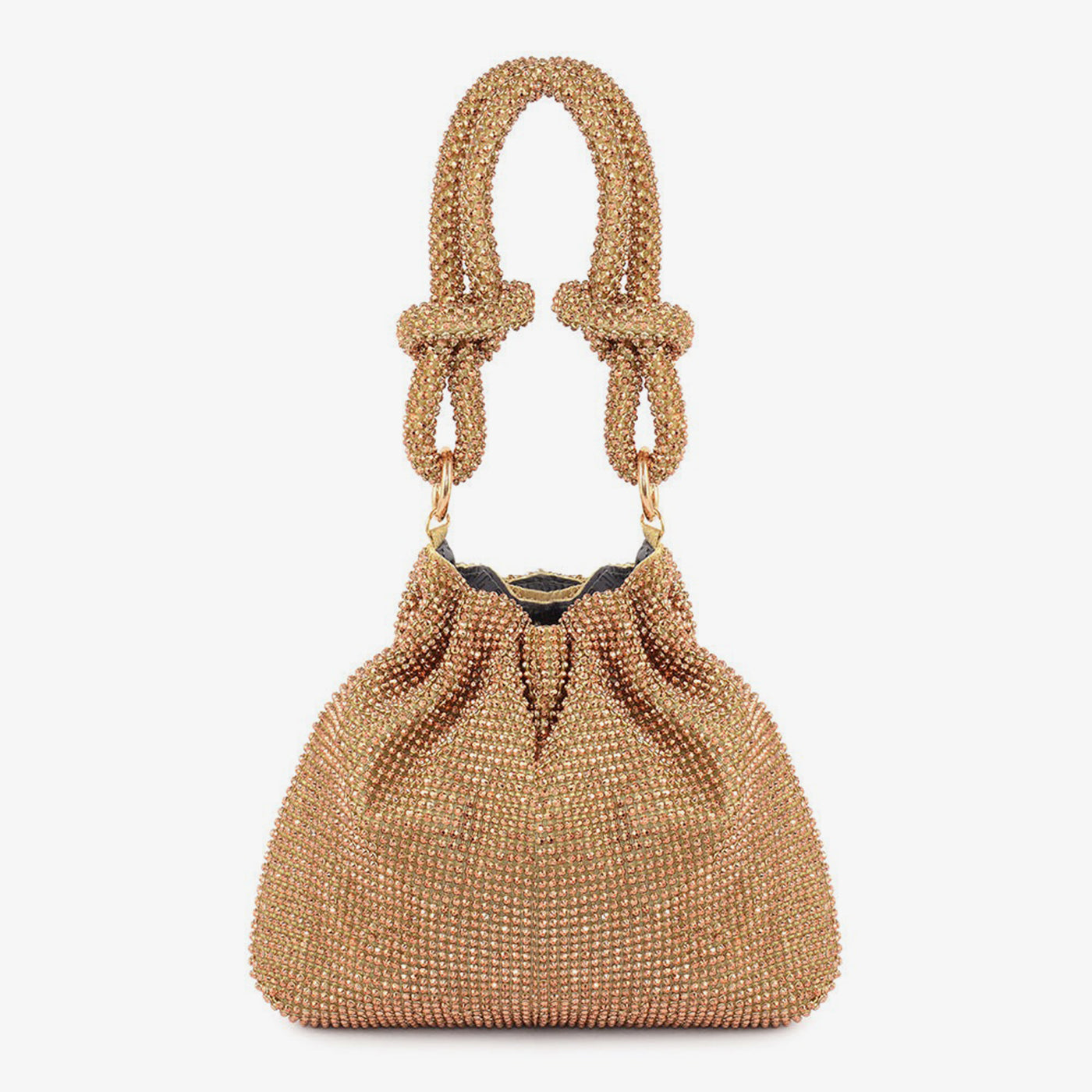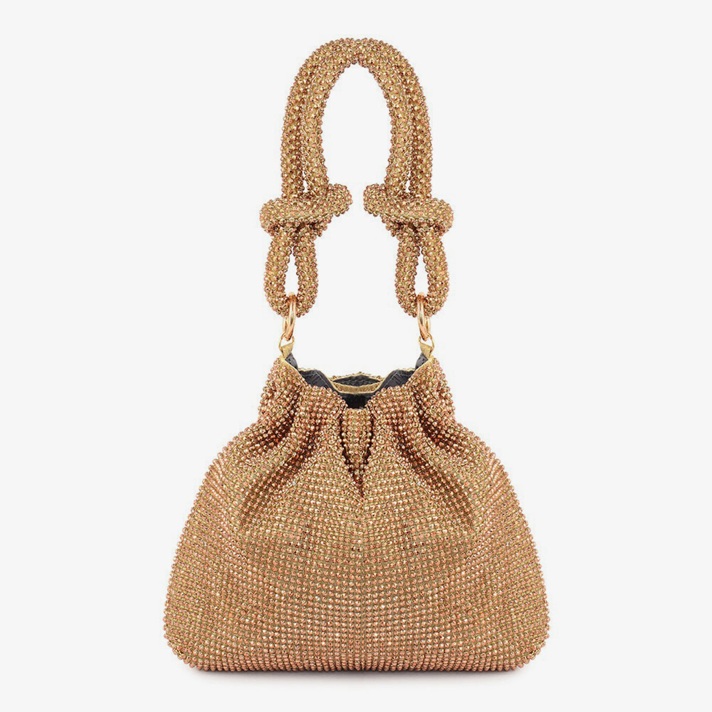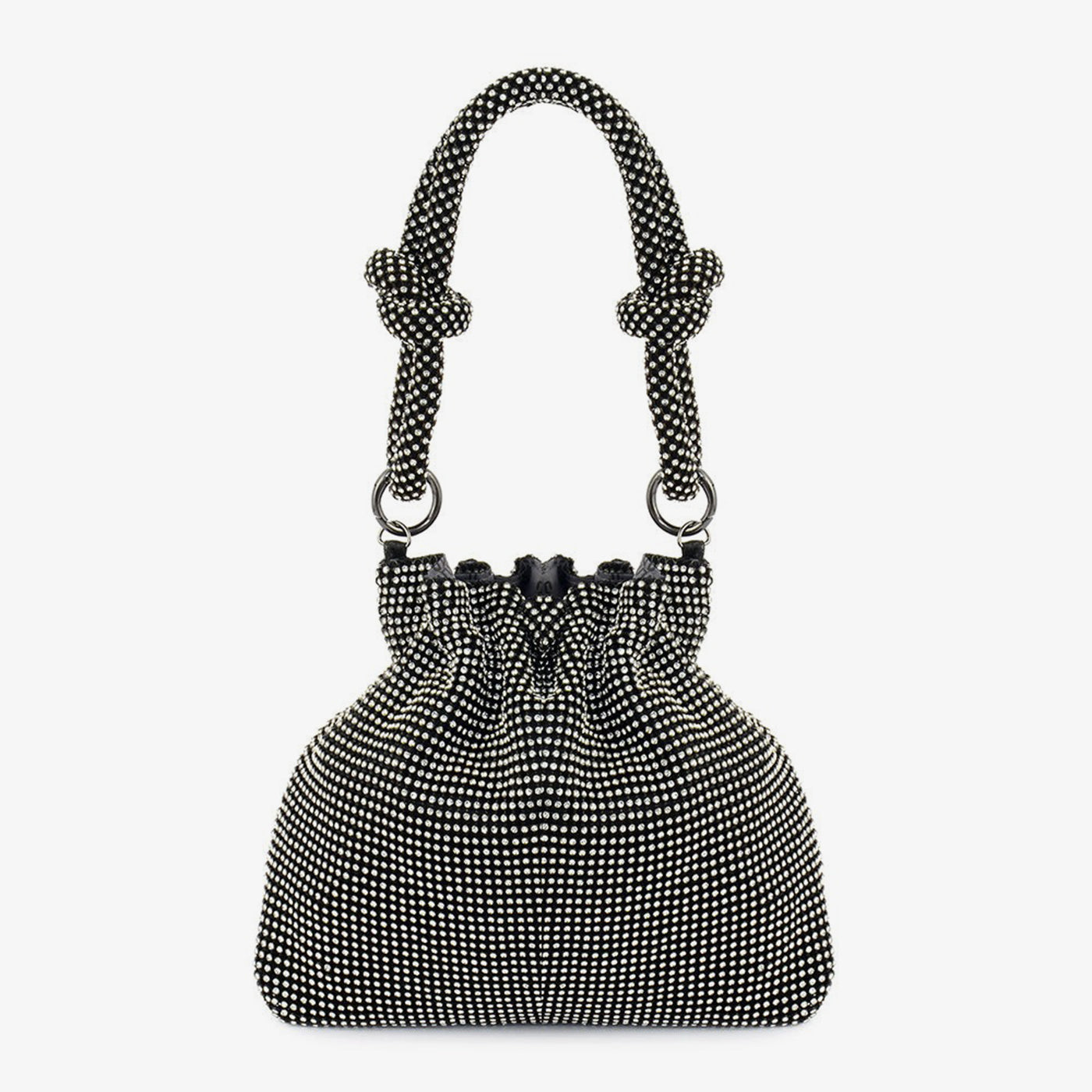 A dazzling pouch covered entirely in small, shimmering embellishments. It features a drawstring closure with unique knotted handles attached by metal rings.
