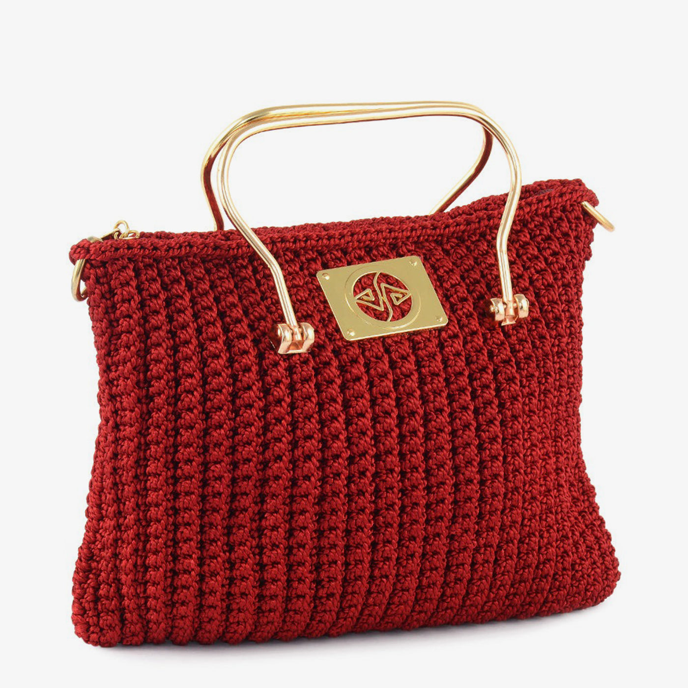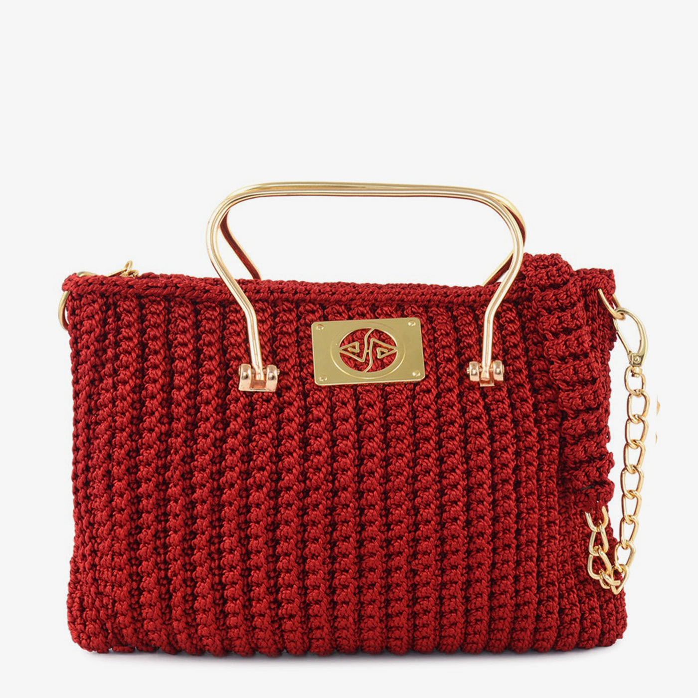 A modern structured bag with a distinct knitted texture. It features a metallic U-shaped top handle and a flap closure with a prominent metallic circular emblem. A chain strap offers an alternative carrying option.