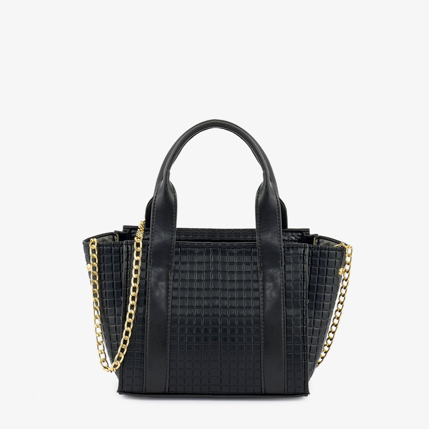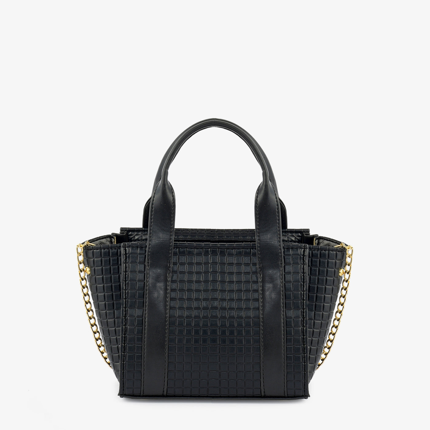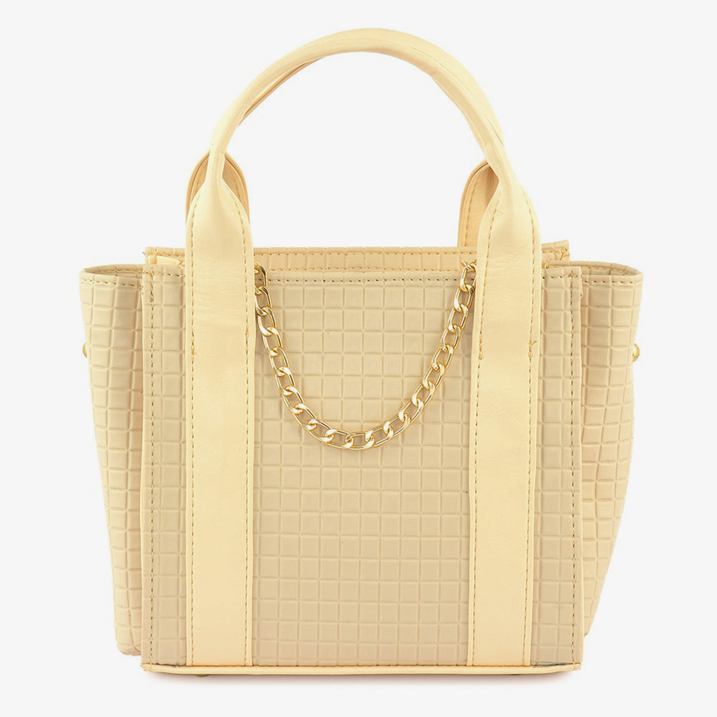 Add a touch of modern sophistication to your look with the Grid Glam Mini Tote. This chic mini tote features a unique textured grid design and a delicate gold chain accent. Its compact size makes it perfect for carrying your essentials in style, while the structured silhouette adds a polished touch.