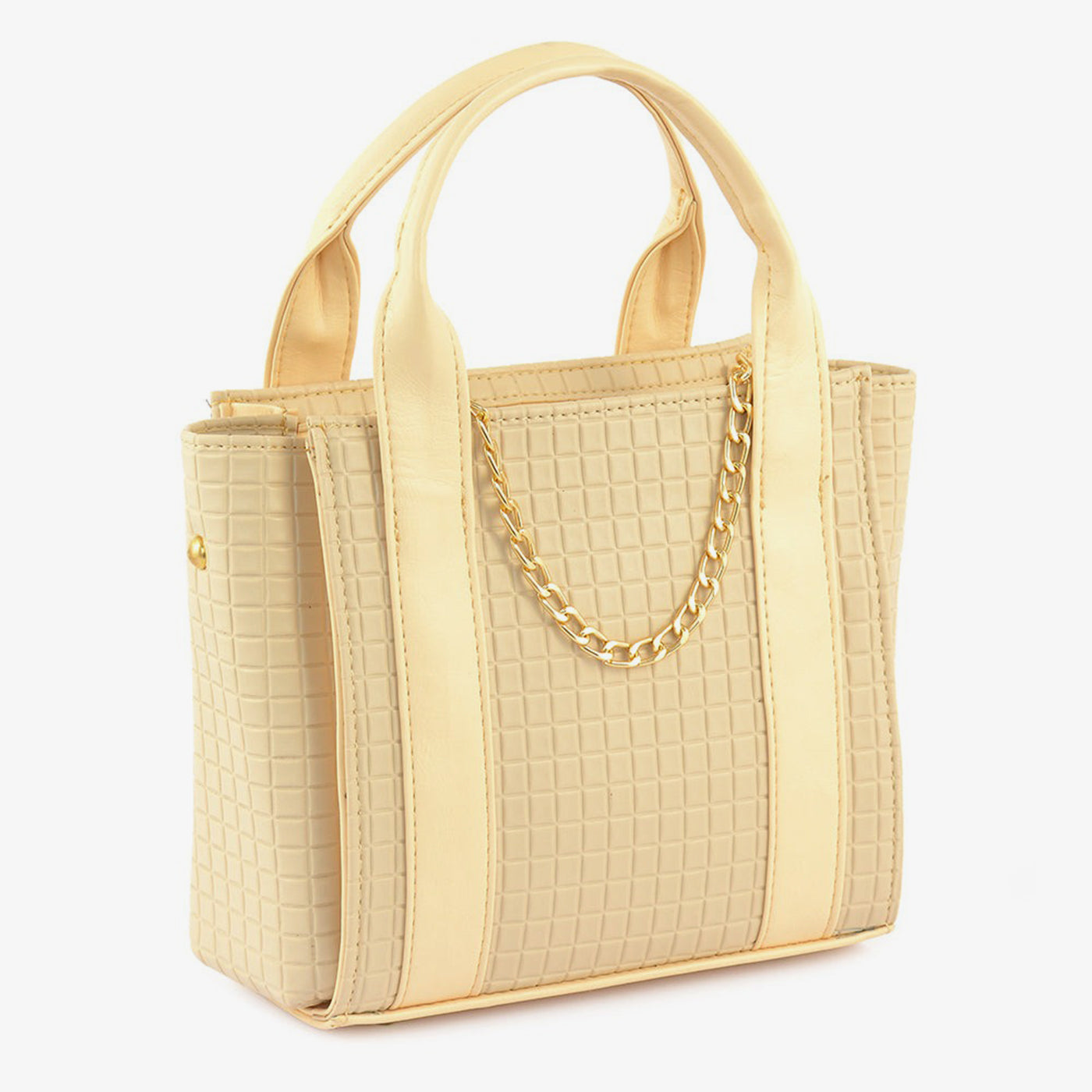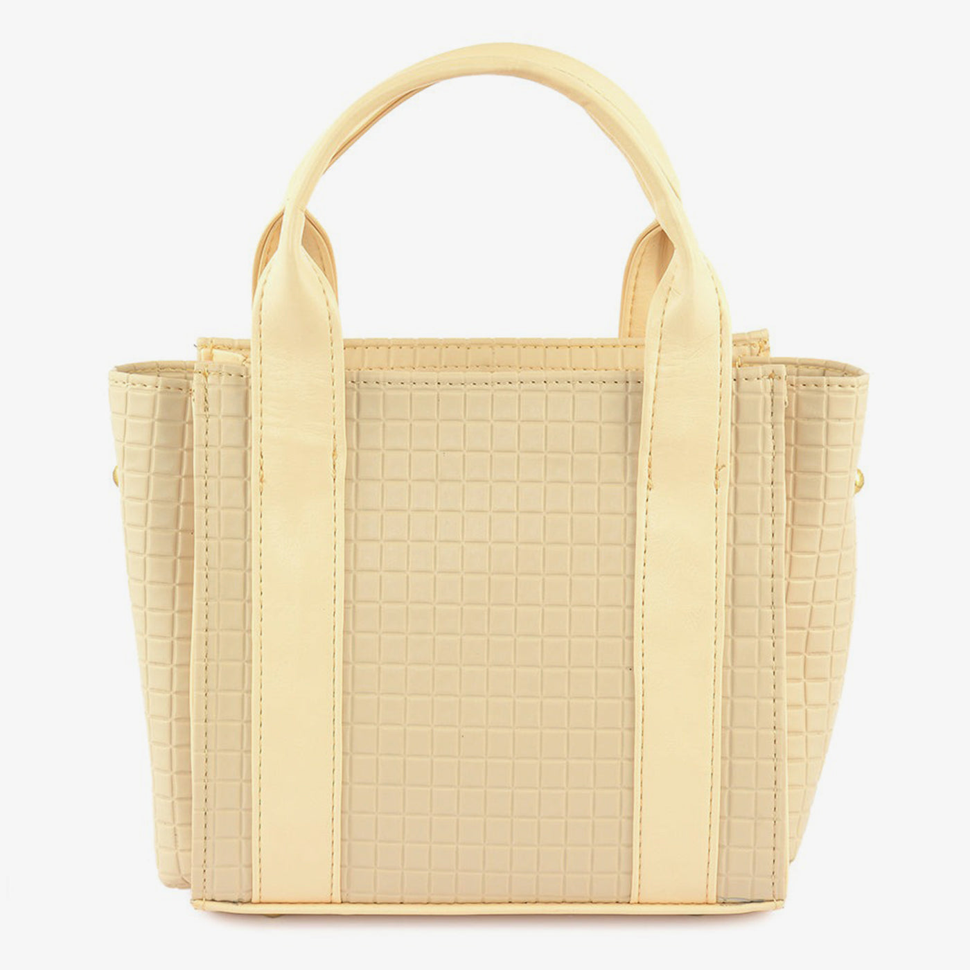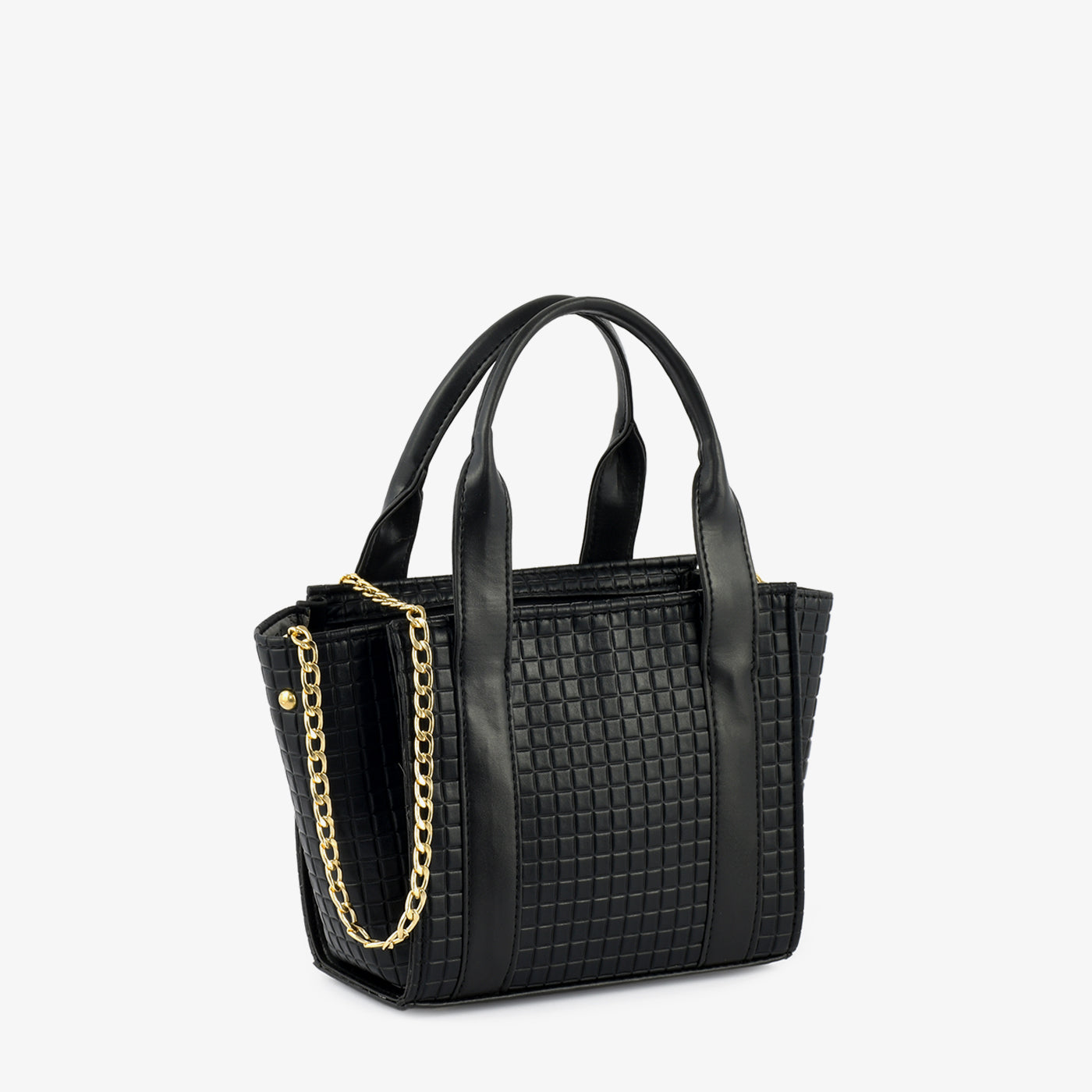 Add a touch of modern sophistication to your look with the Grid Glam Mini Tote. This chic mini tote features a unique textured grid design and a delicate gold chain accent. Its compact size makes it perfect for carrying your essentials in style, while the structured silhouette adds a polished touch.