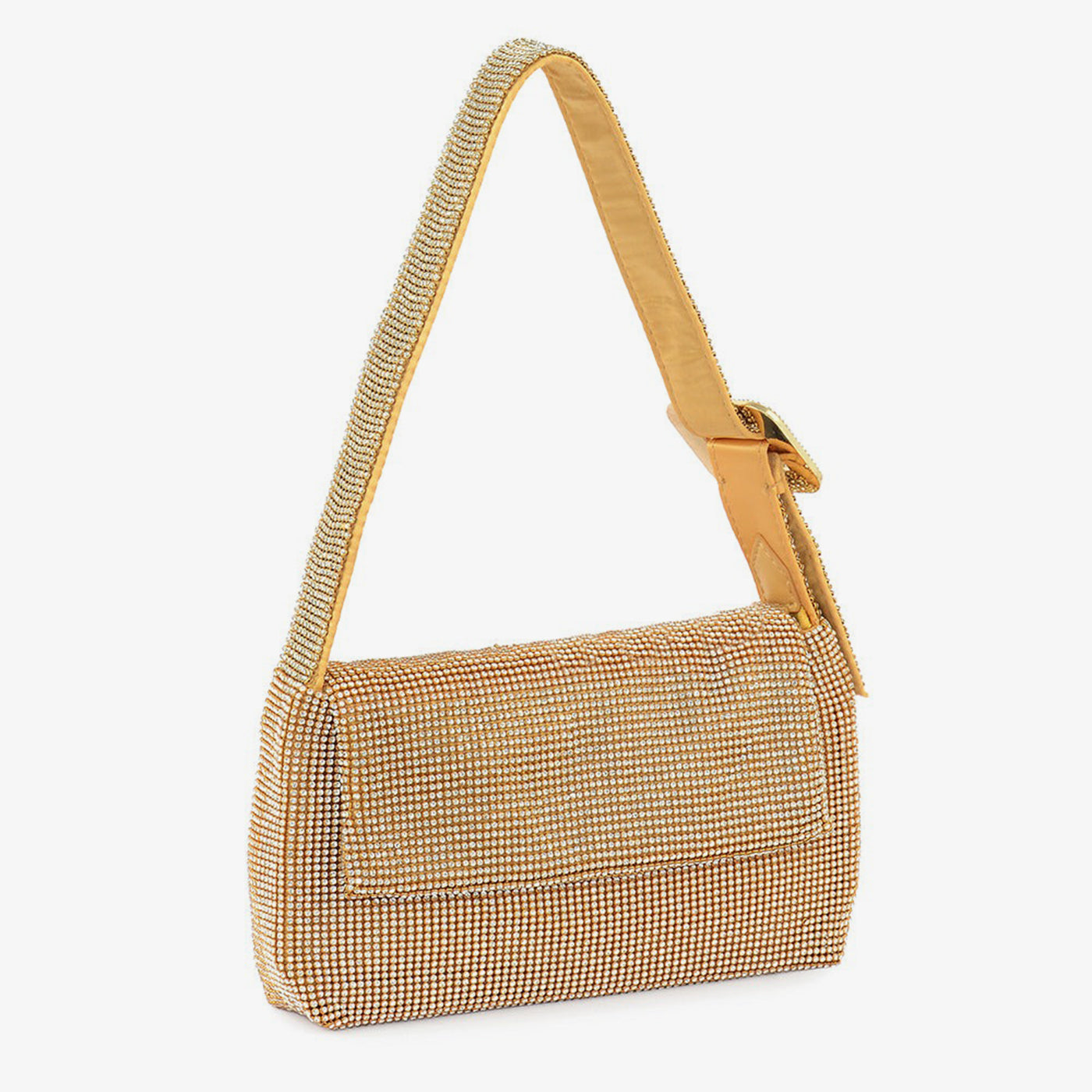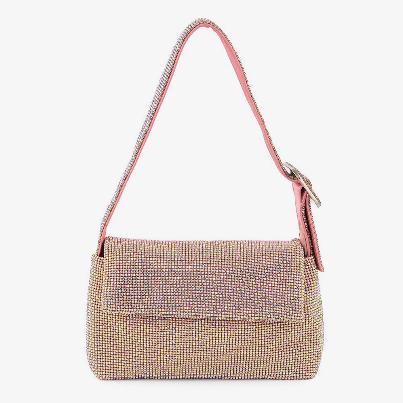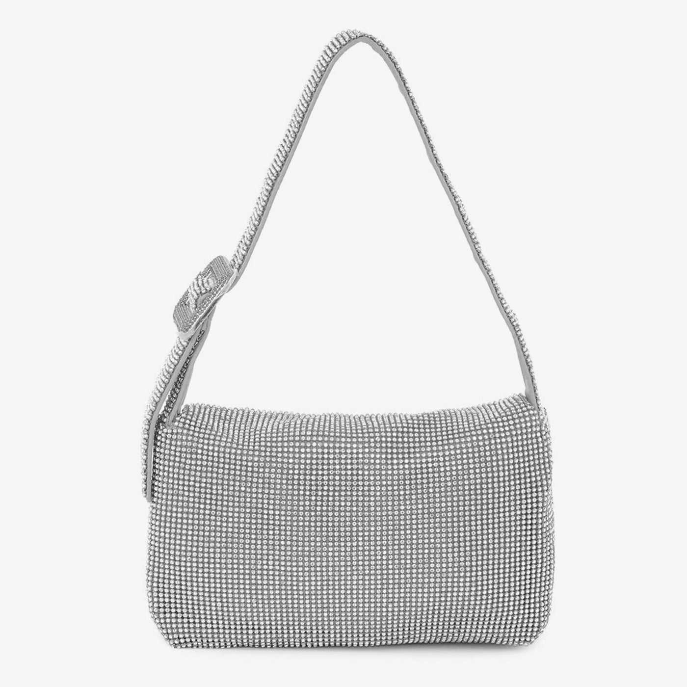 Dazzle and delight with the Starlight Shimmer Shoulder Bag. This captivating bag is covered in shimmering crystals, catching the light from every angle. The classic baguette shape gets a glamorous update, making it the perfect accessory for your most special occasions.