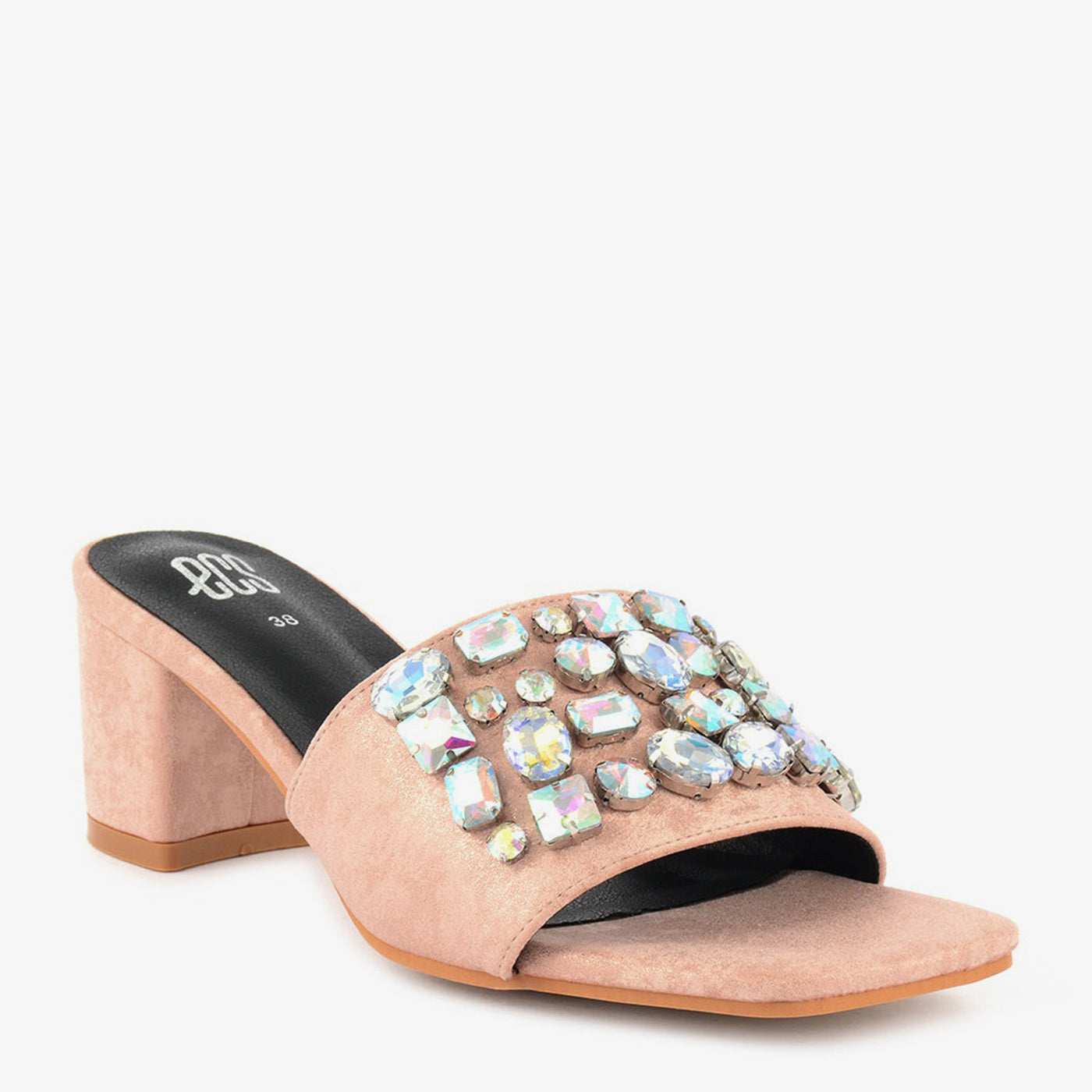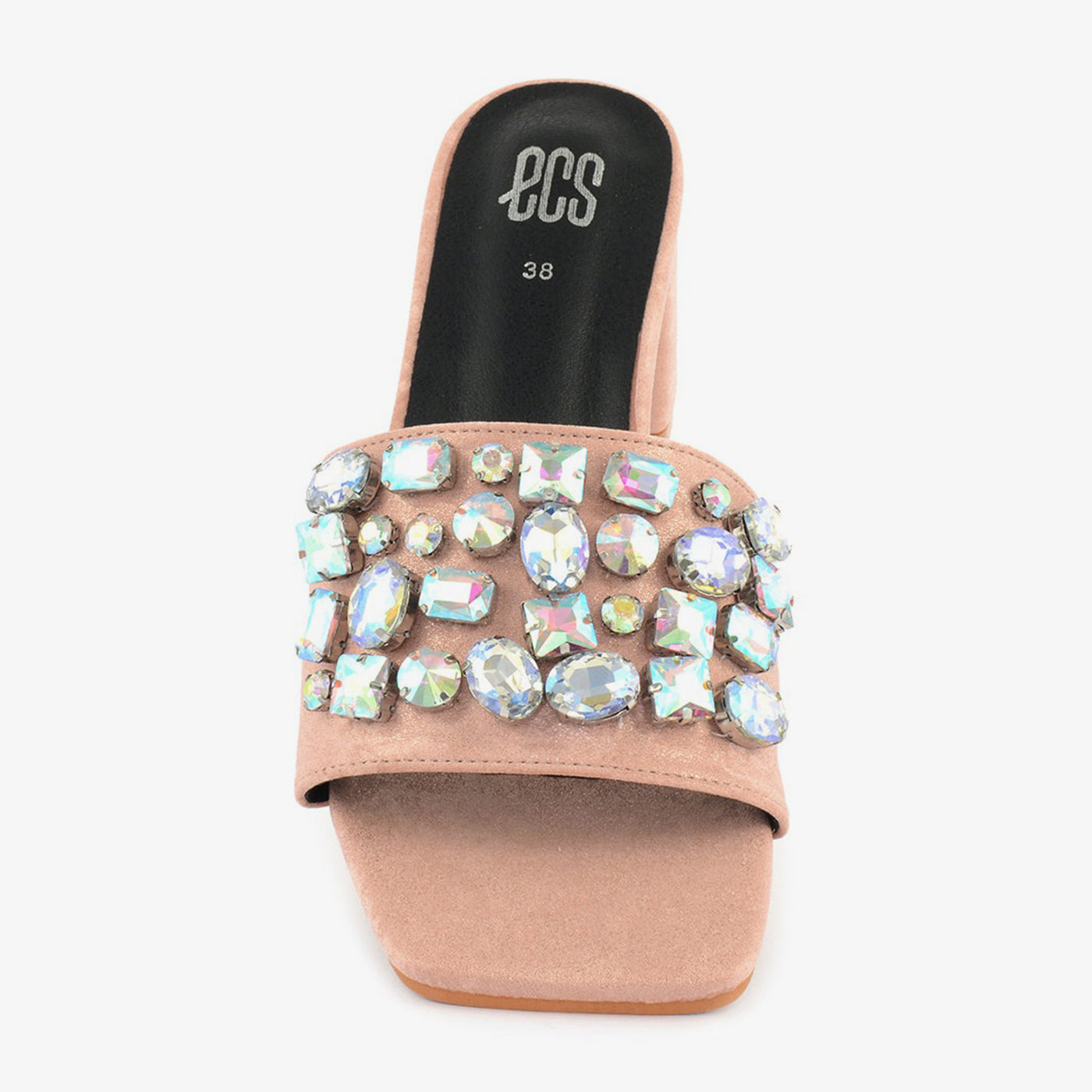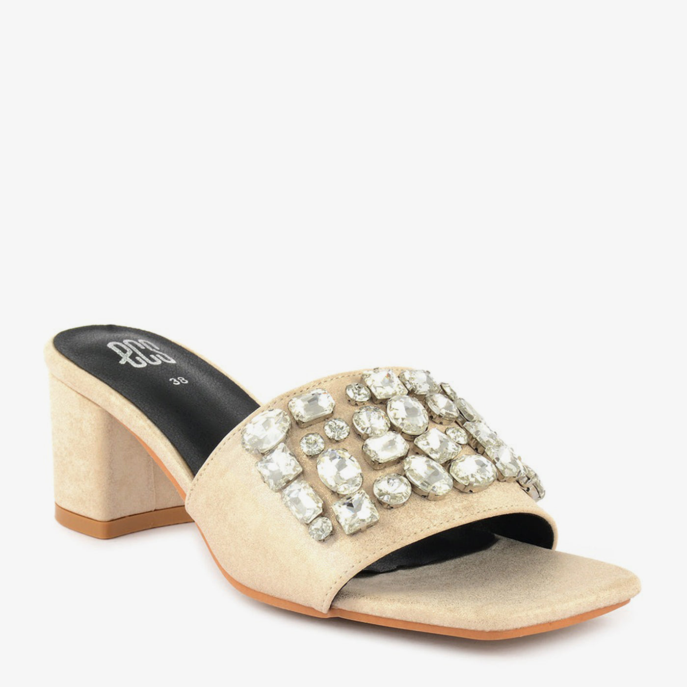 Introducing the "Stones Bliss" slippers, perfect for those who love a bit of sparkle. The shiny synthetic PU upper with a brooch detail and square toe shape create an elegant look. The 3-inch block heel adds sophistication, while the slip-on fastening ensures a comfortable fit. These slippers are a stylish addition to your party wardrobe.