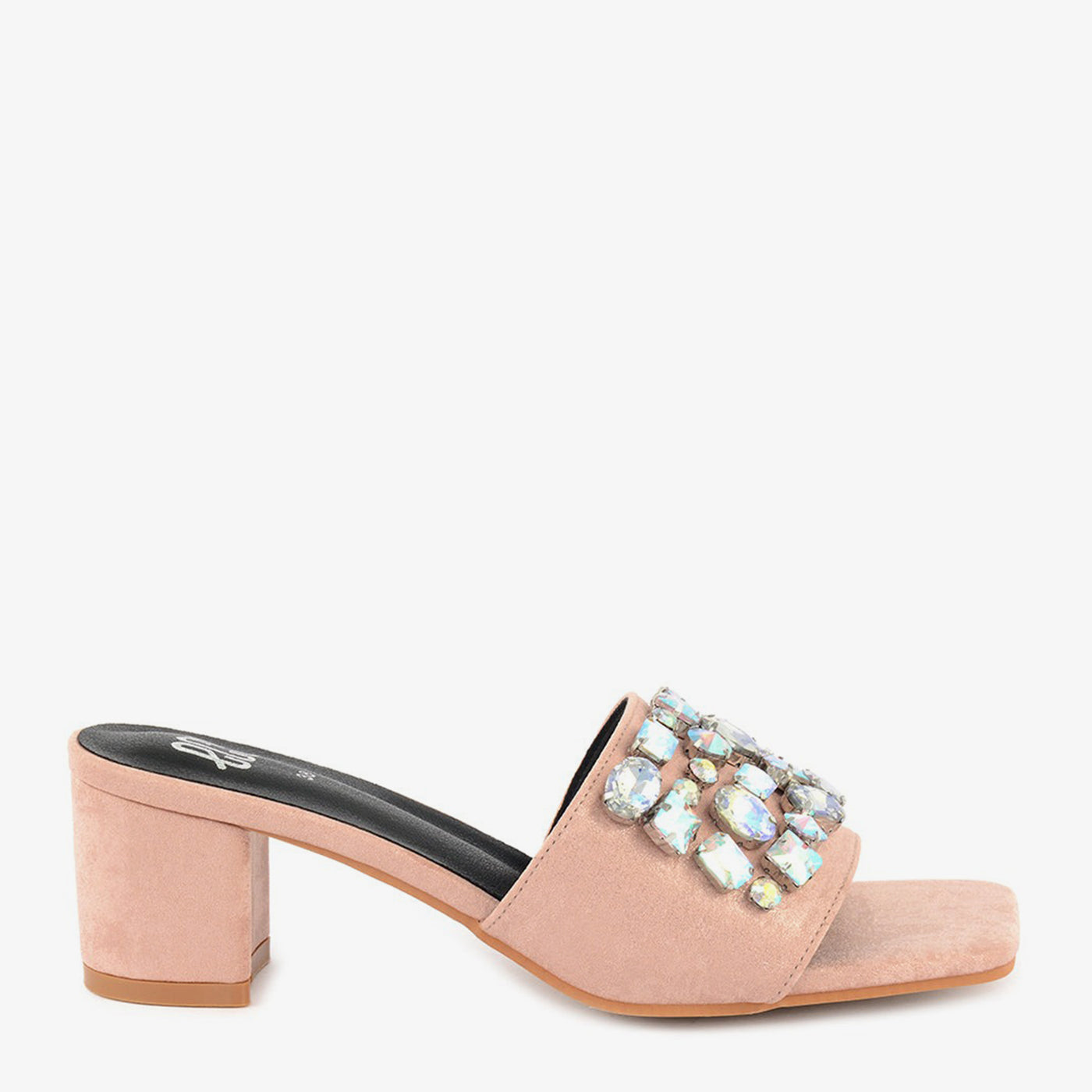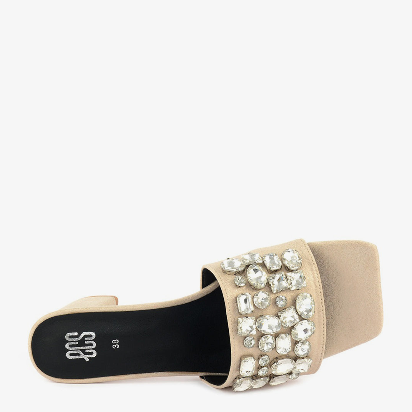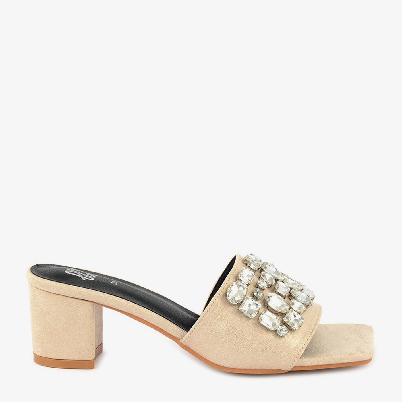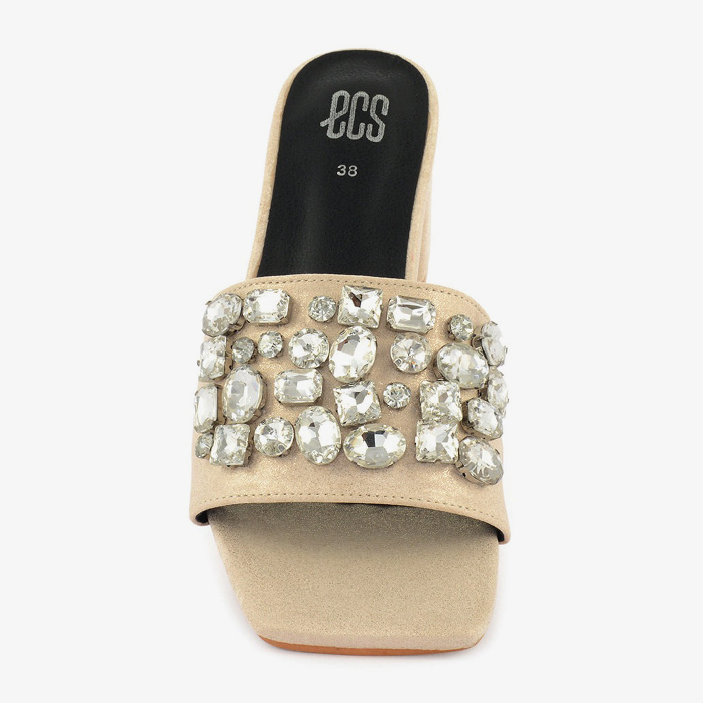 Introducing the "Stones Bliss" slippers, perfect for those who love a bit of sparkle. The shiny synthetic PU upper with a brooch detail and square toe shape create an elegant look. The 3-inch block heel adds sophistication, while the slip-on fastening ensures a comfortable fit. These slippers are a stylish addition to your party wardrobe.