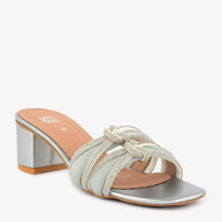 A glamorous slipper with a square toe and a block heel. Multiple straps covered in small, sparkling embellishments are knotted together at the center. Ideal for adding some shimmer to a night.