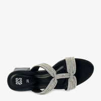 A glamorous mule slipper with a square toe and a block heel. It features multiple straps densely covered in small, sparkling embellishments that are knotted together at the center. Ideal for a special occasion.