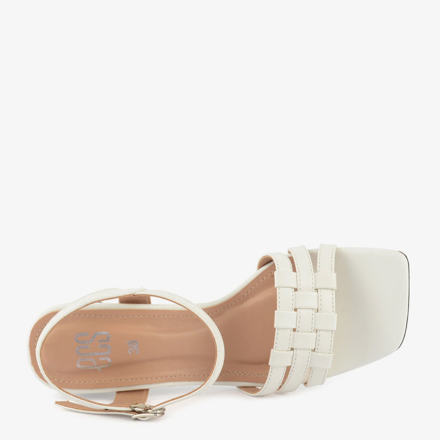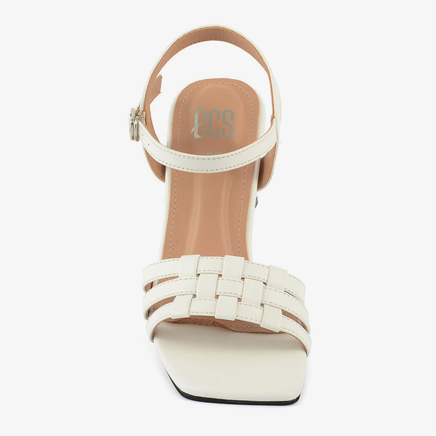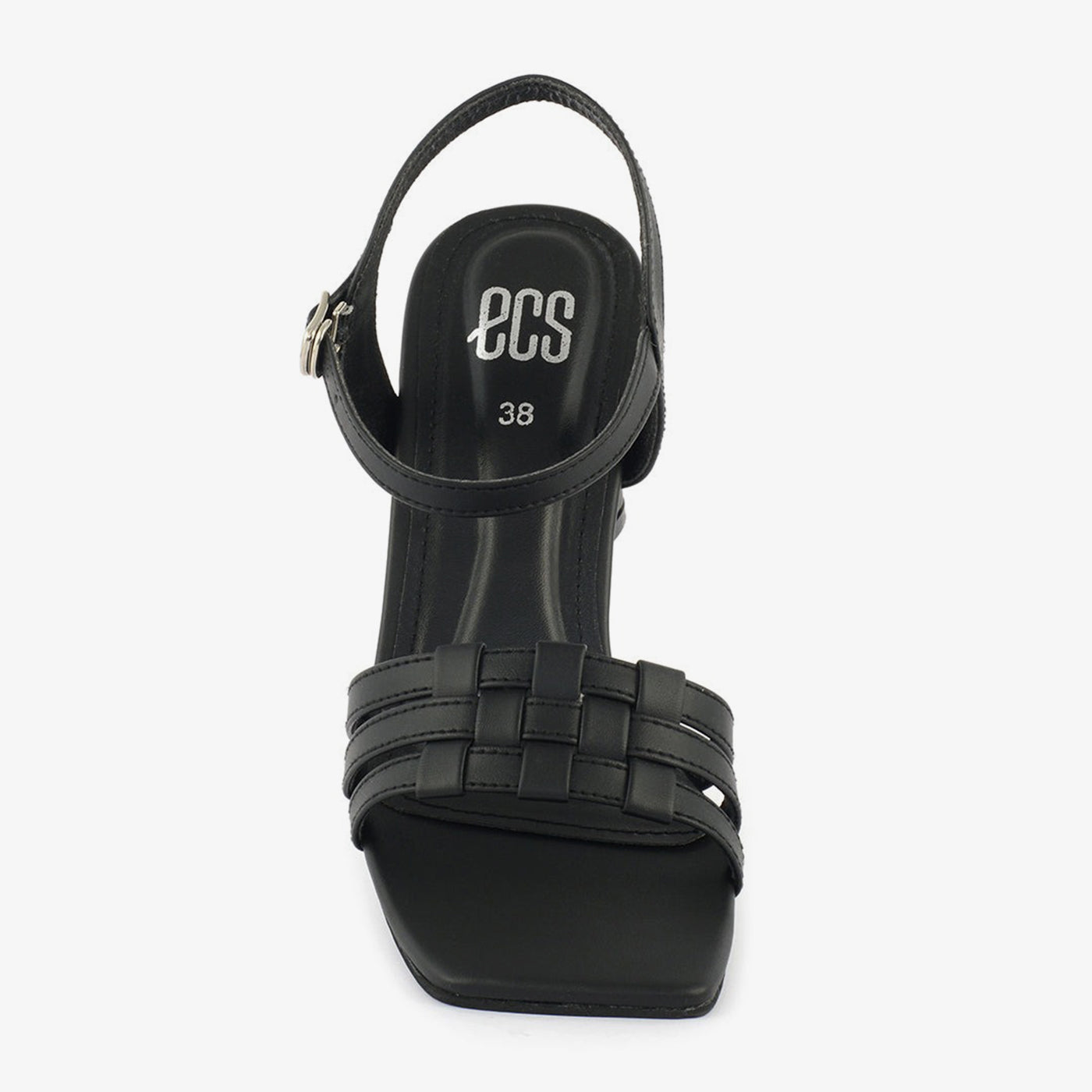 Heeled sandals featuring a woven strap design and an adjustable ankle strap for a secure fit. The block heel offers stability while adding a touch of sophistication. Suitable for both casual and formal occasions.
