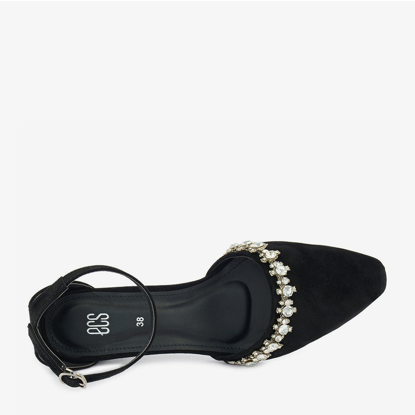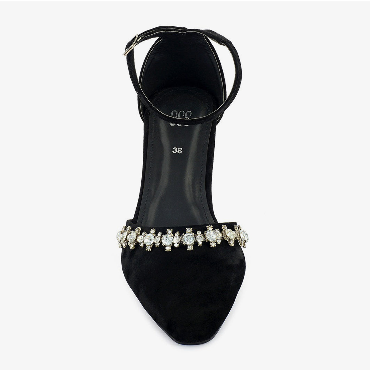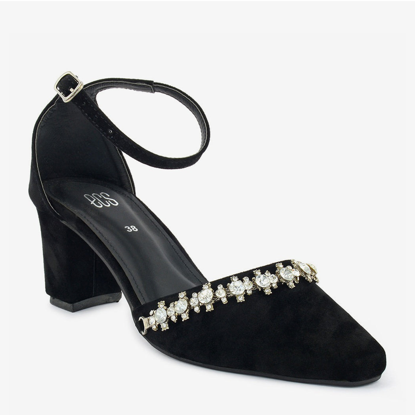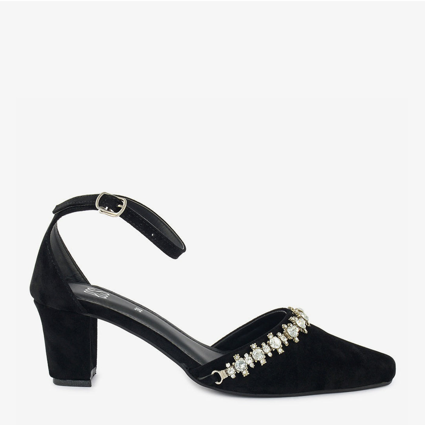 A chic black pump crafted from a soft material and adorned with a delicate crystal-embellished strap around the ankle. It features a pointed toe and a comfortable block heel.