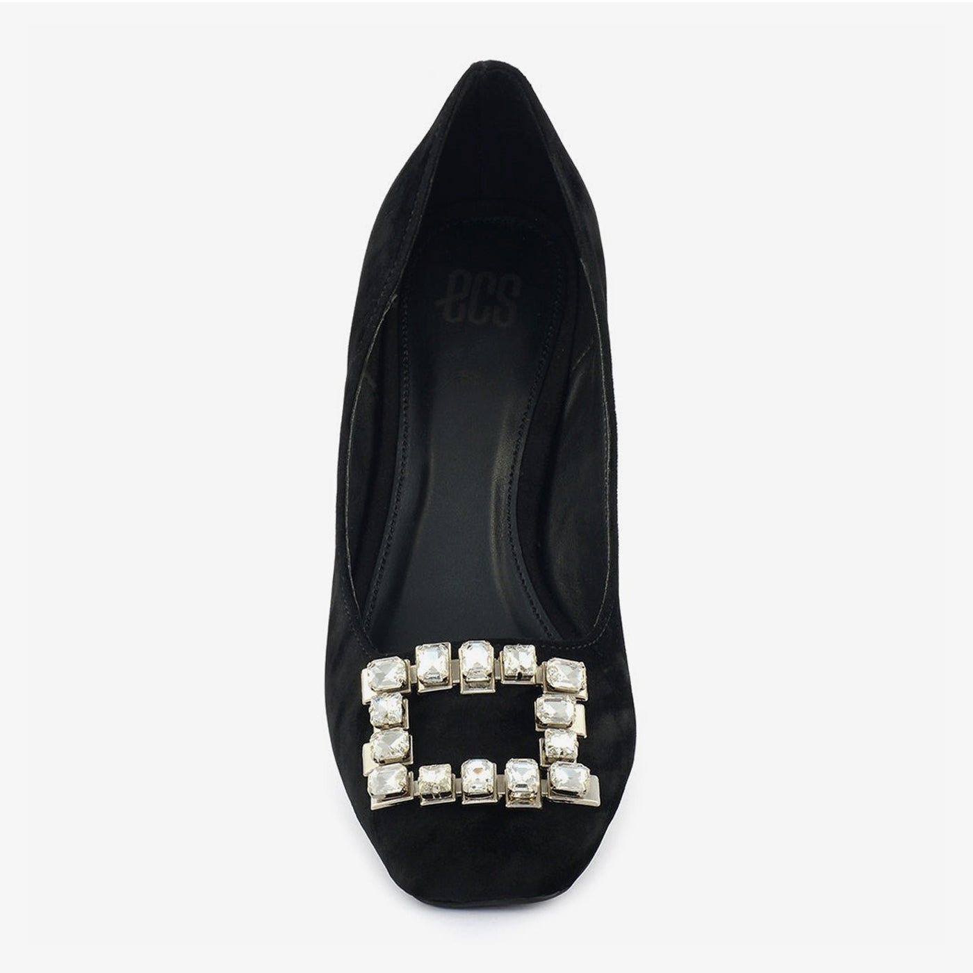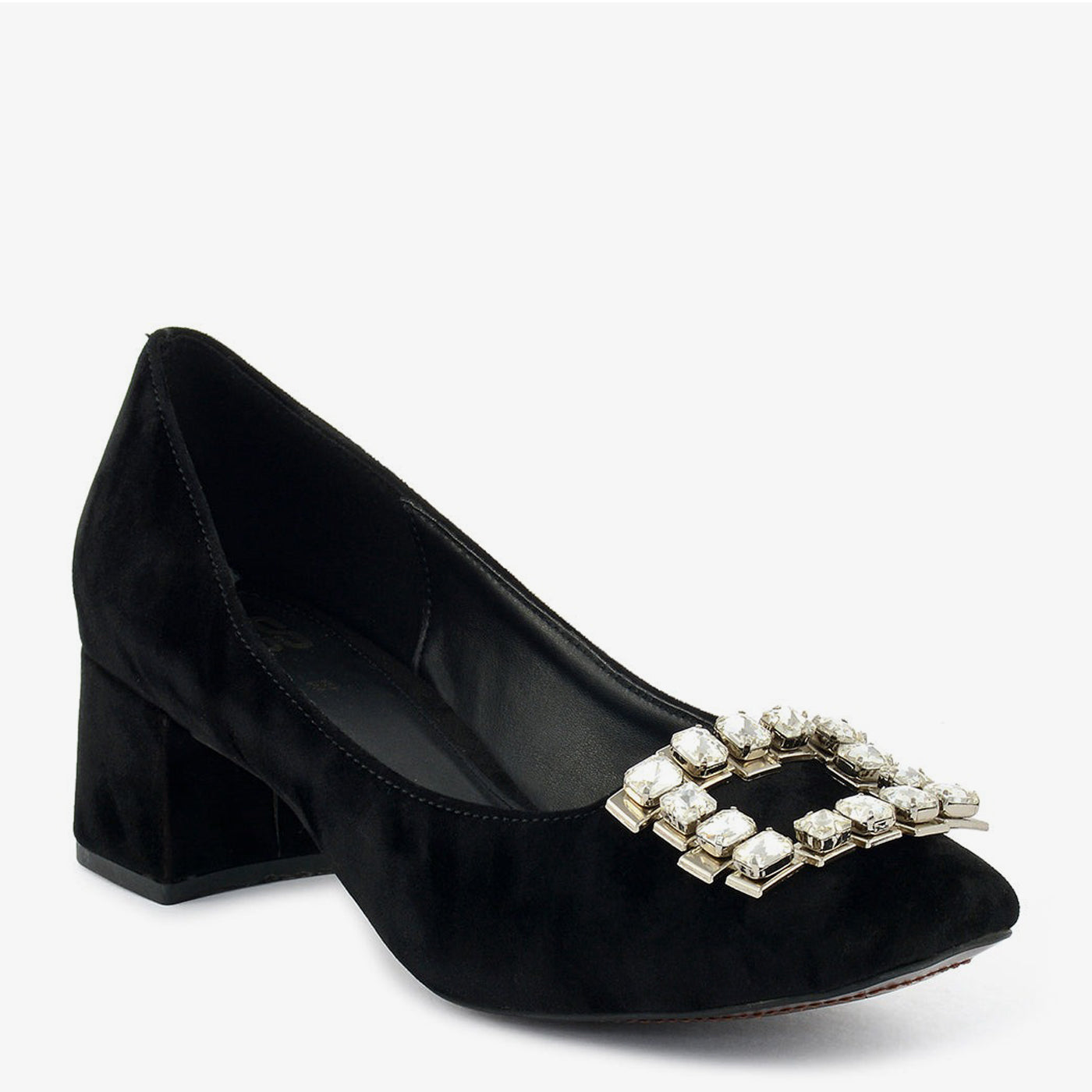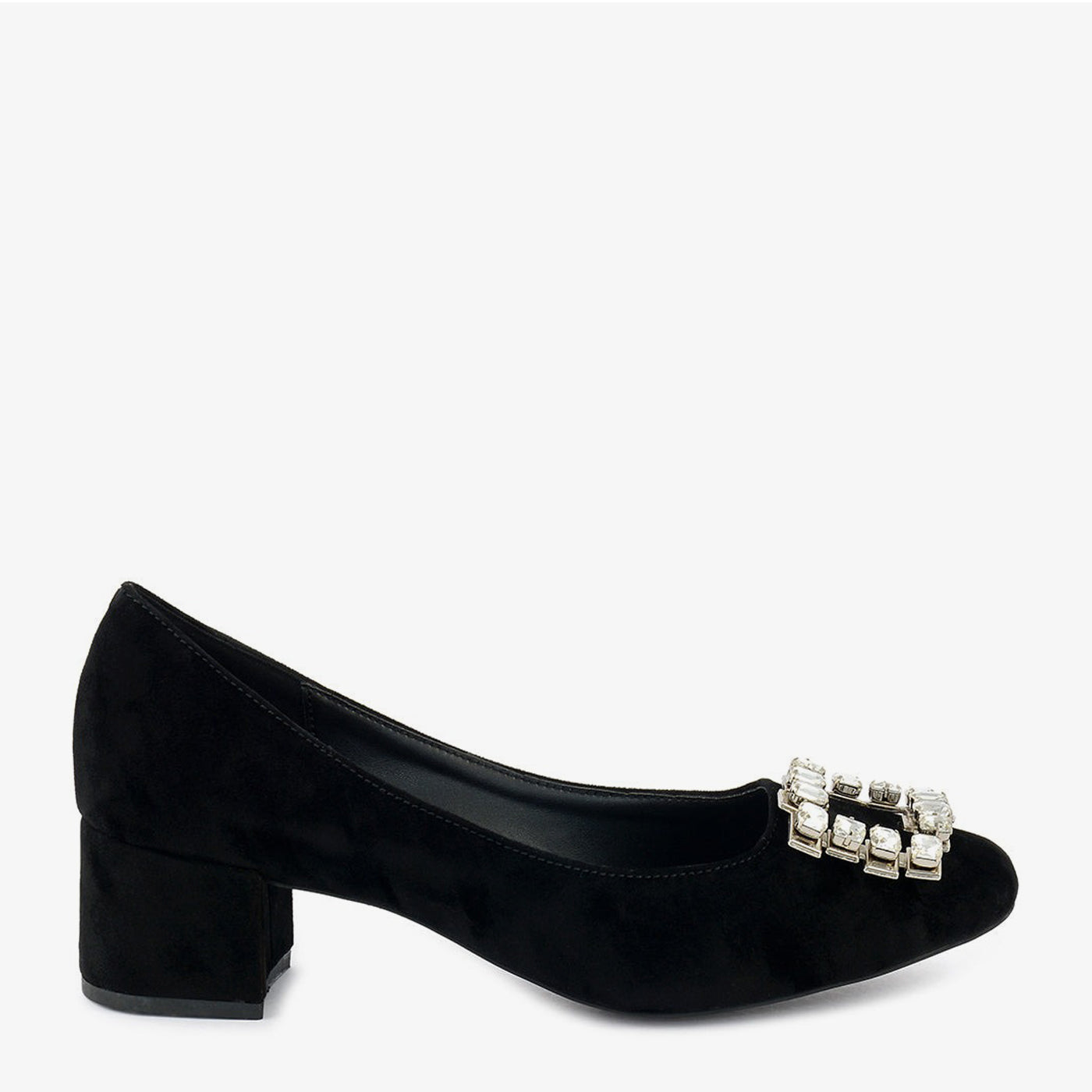 A sophisticated black suede pump featuring a pointed toe and a bold, square buckle embellished with crystals. The sturdy block heel provides both style and comfort.