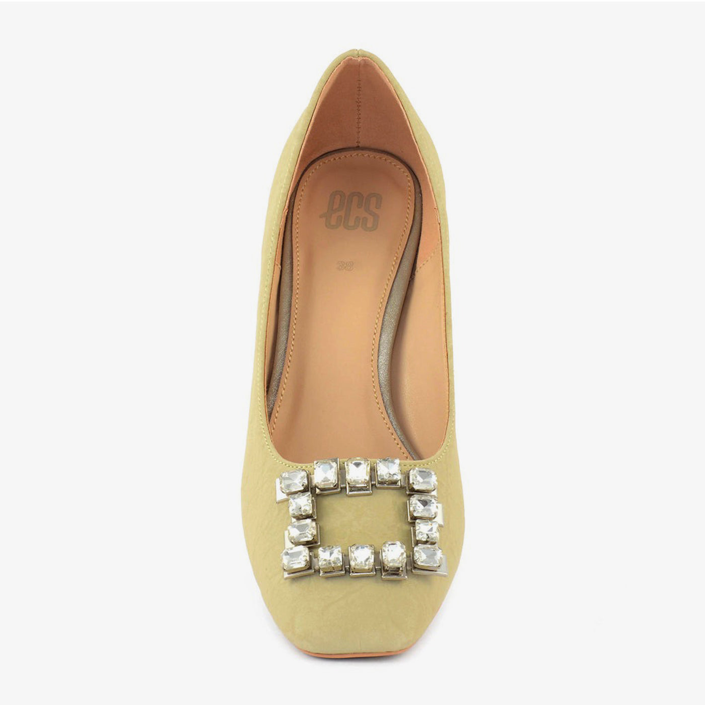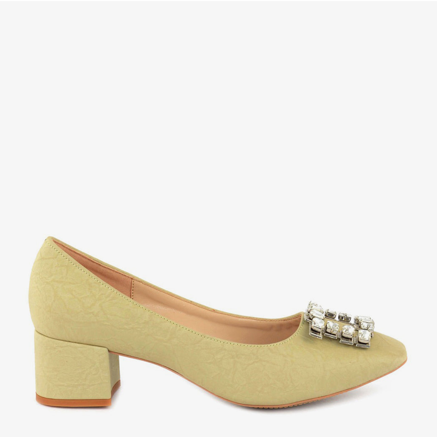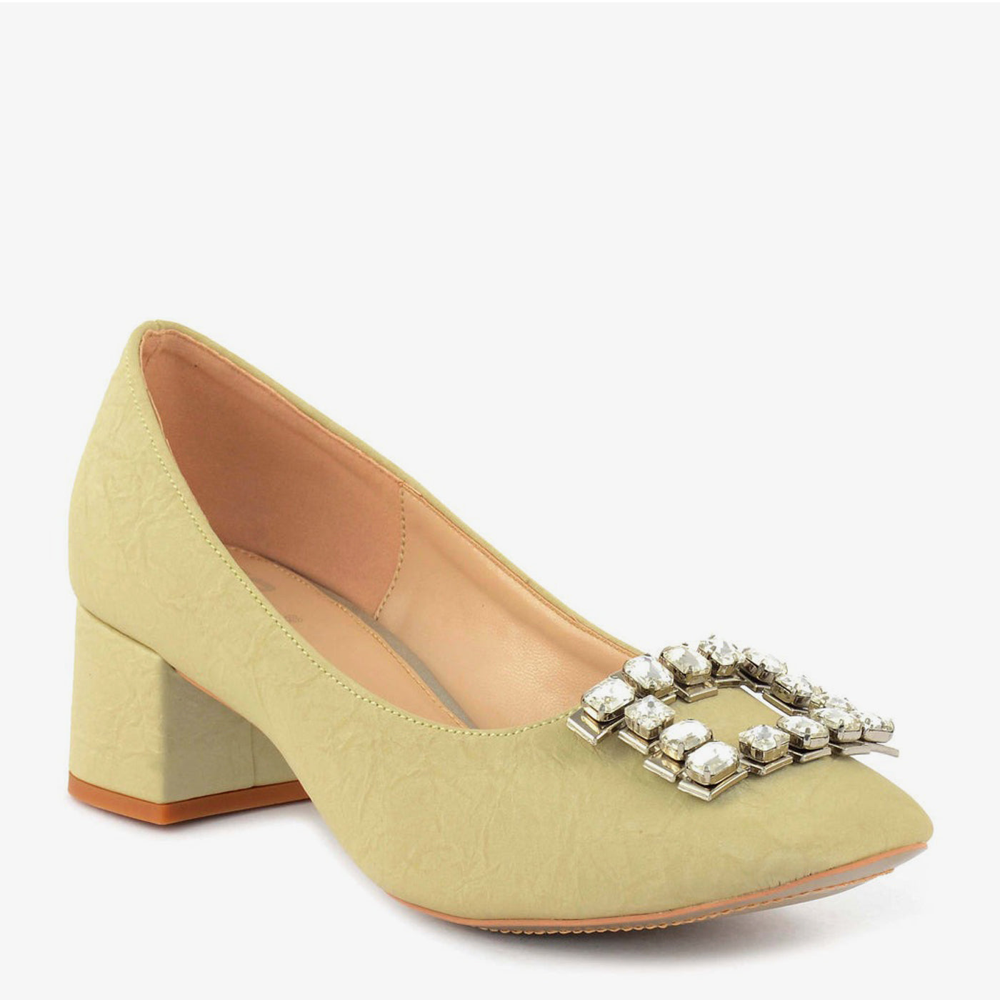 - Design: Pointed-toe pump with a block heel and crystal buckle