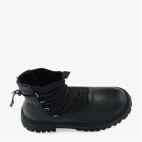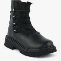 Indulge in edgy style with Sole Serenity's "Edgy Embrace" boots. Crafted with a sleek black finish and featuring a chunky sole and lace-up detail, these boots exude a rebellious spirit. The knit cuff adds a touch of comfort and style.