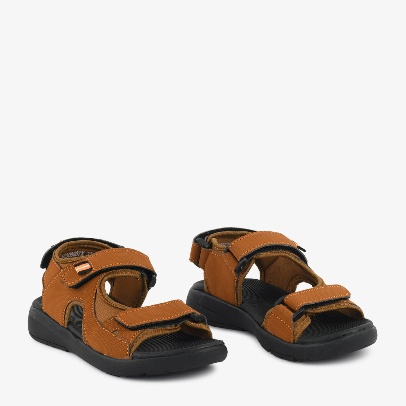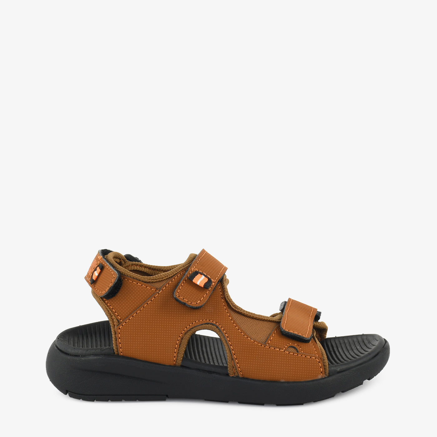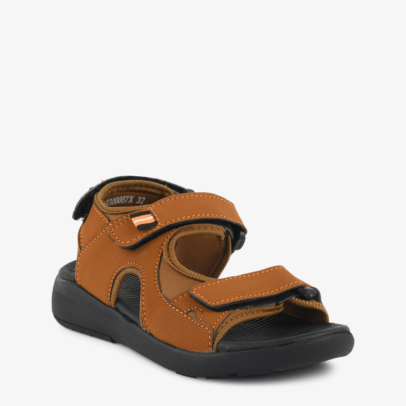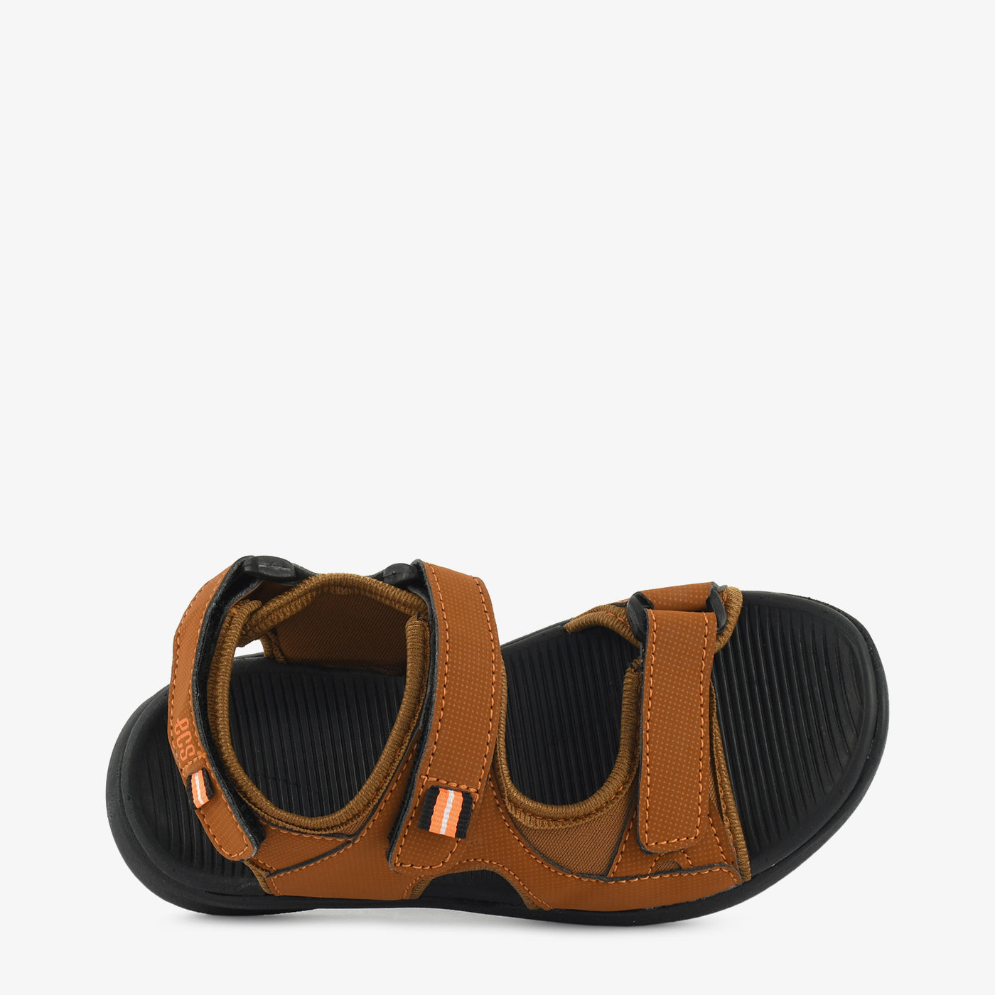 Built for active kids, this sandal features a generously cushioned footbed with a sturdy rubber sole that provides grip and support throughout the day. The dual velcro strap construction in tan nubuck-finish material with contrast orange stitching ensures a secure and adjustable fit for growing feet. The open-toe design keeps feet comfortable and ventilated, making it ideal for outdoor play, school outings, and casual everyday use.