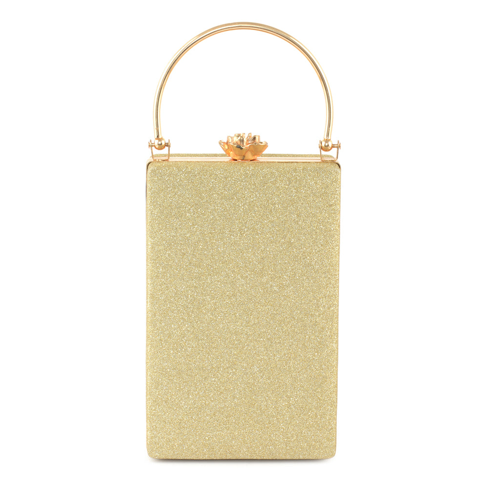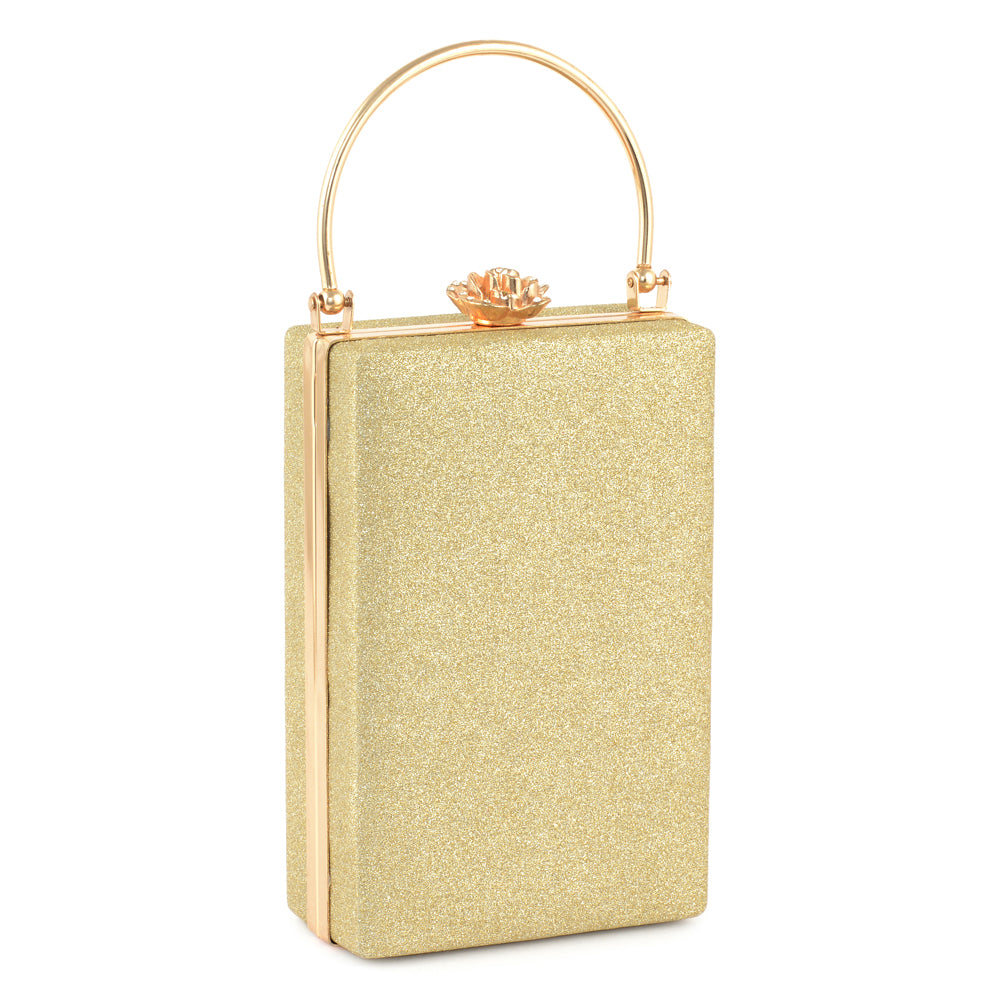 Sleek and graceful, this hard-case box clutch features a metallic handle and floral clasp for a timeless bridal touch. Its compact silhouette adds a refined sparkle to your outfit.
