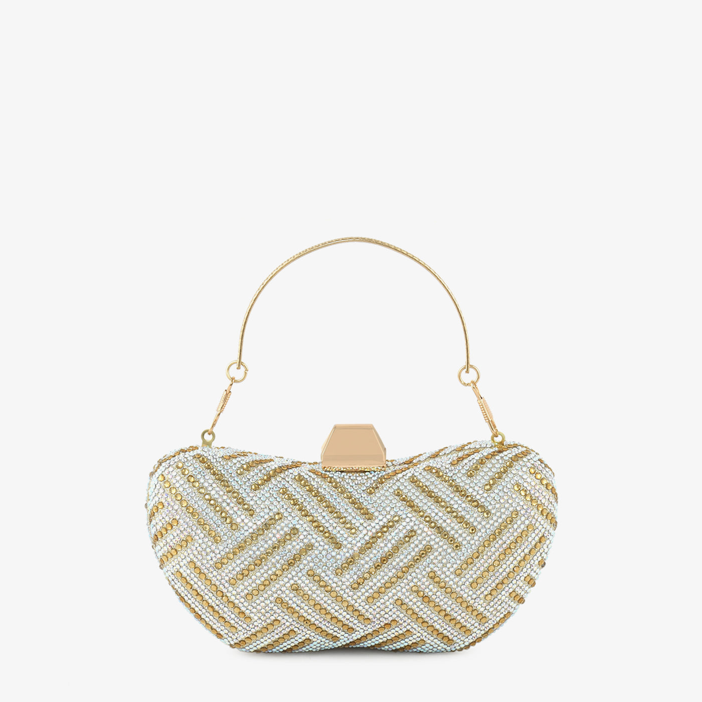 Luxe Weave is an artful blend of shimmer and shape—featuring a structured curved silhouette adorned with dazzling crystal beadwork in a crisscross rhythm. Its golden top clasp and metallic handle add to its refined charm, making it your go-to clutch for festive soirées and elegant evenings.