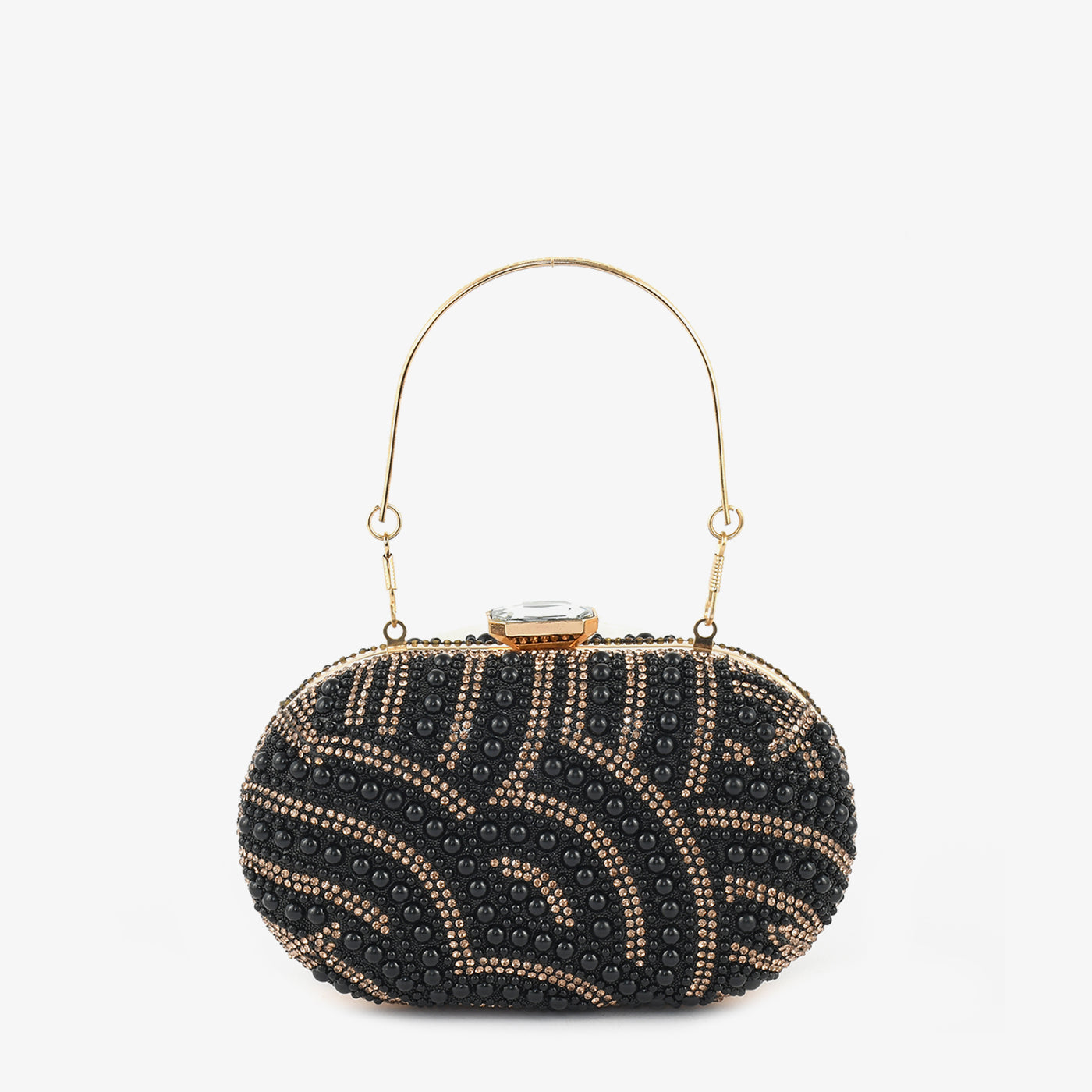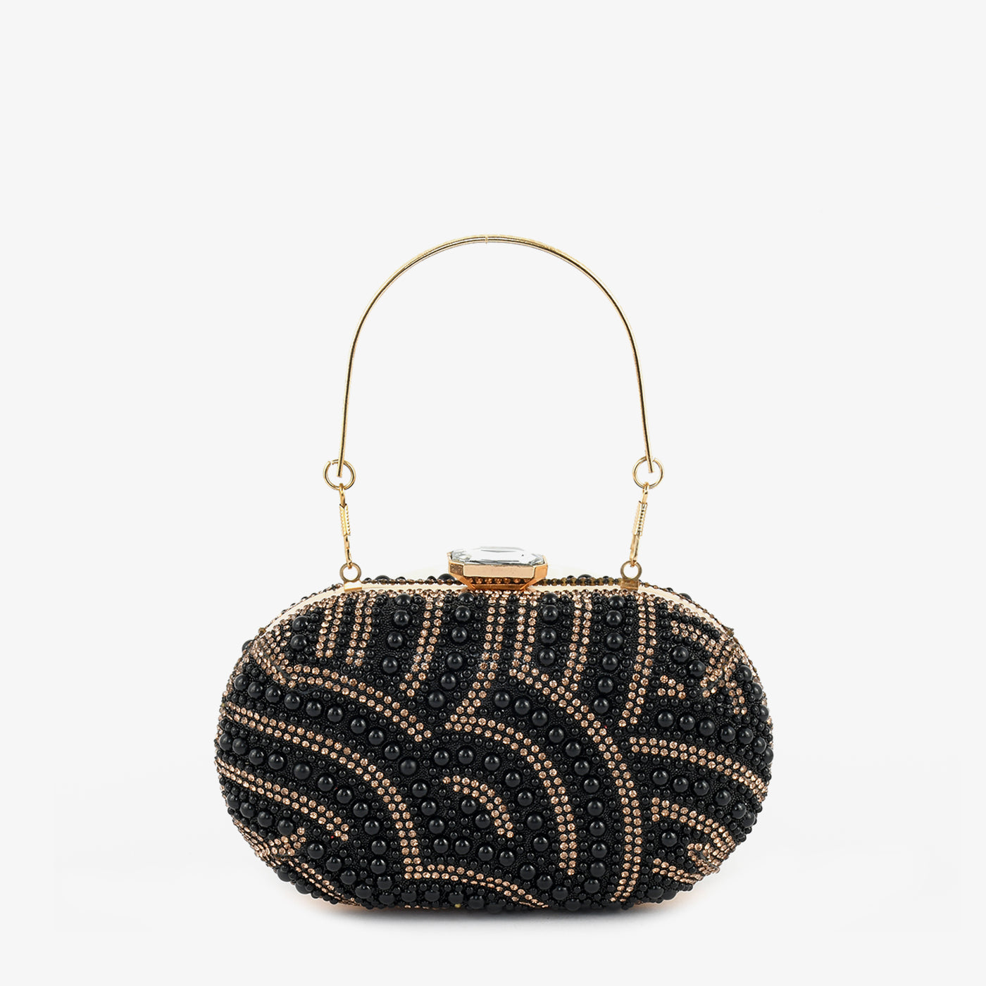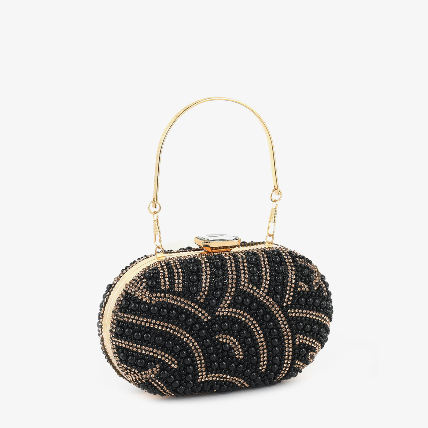 This black and gold oval clutch is adorned with bold beadwork in swirling patterns. Its metallic frame and crystal clasp add an elegant finishing touch for evening glam. The slender top handle ensures both ease and style.
