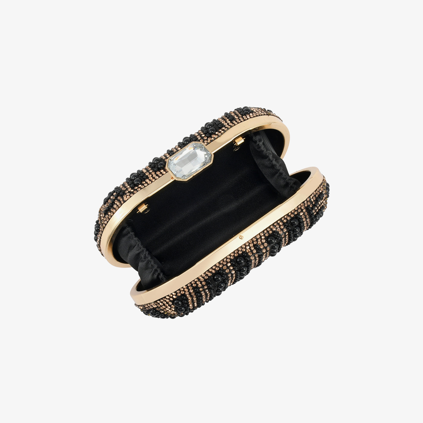 This black and gold oval clutch is adorned with bold beadwork in swirling patterns. Its metallic frame and crystal clasp add an elegant finishing touch for evening glam....