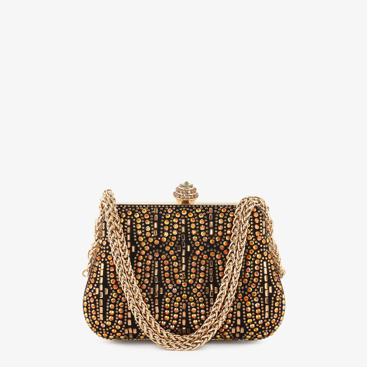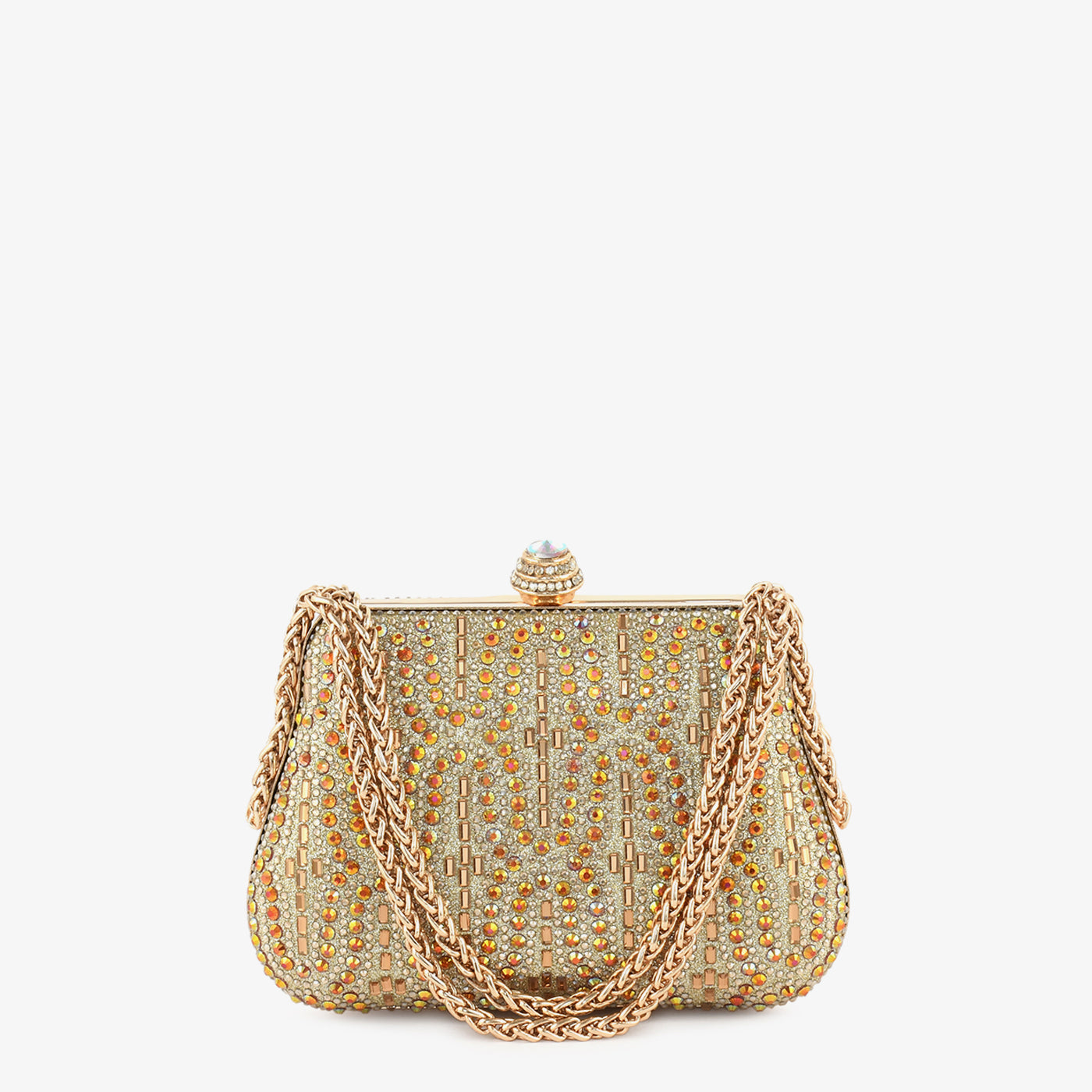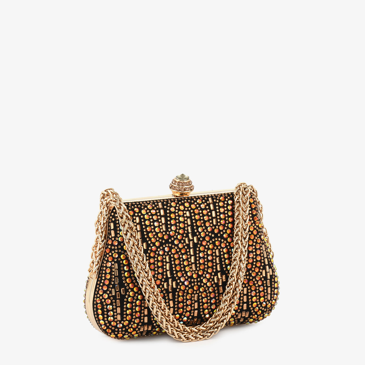 This rounded frame bag sparkles with all-over embellishment and a crown-inspired clasp, making it the ultimate show-stopper. The dual chain handle provides both elegance and versatility, ideal for cocktail nights or celebratory evenings.