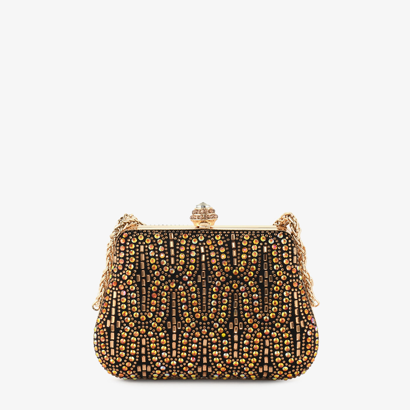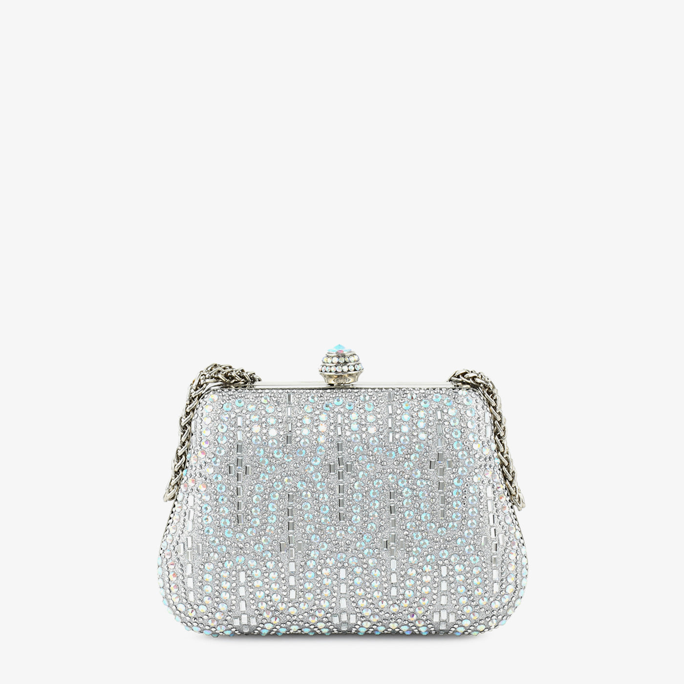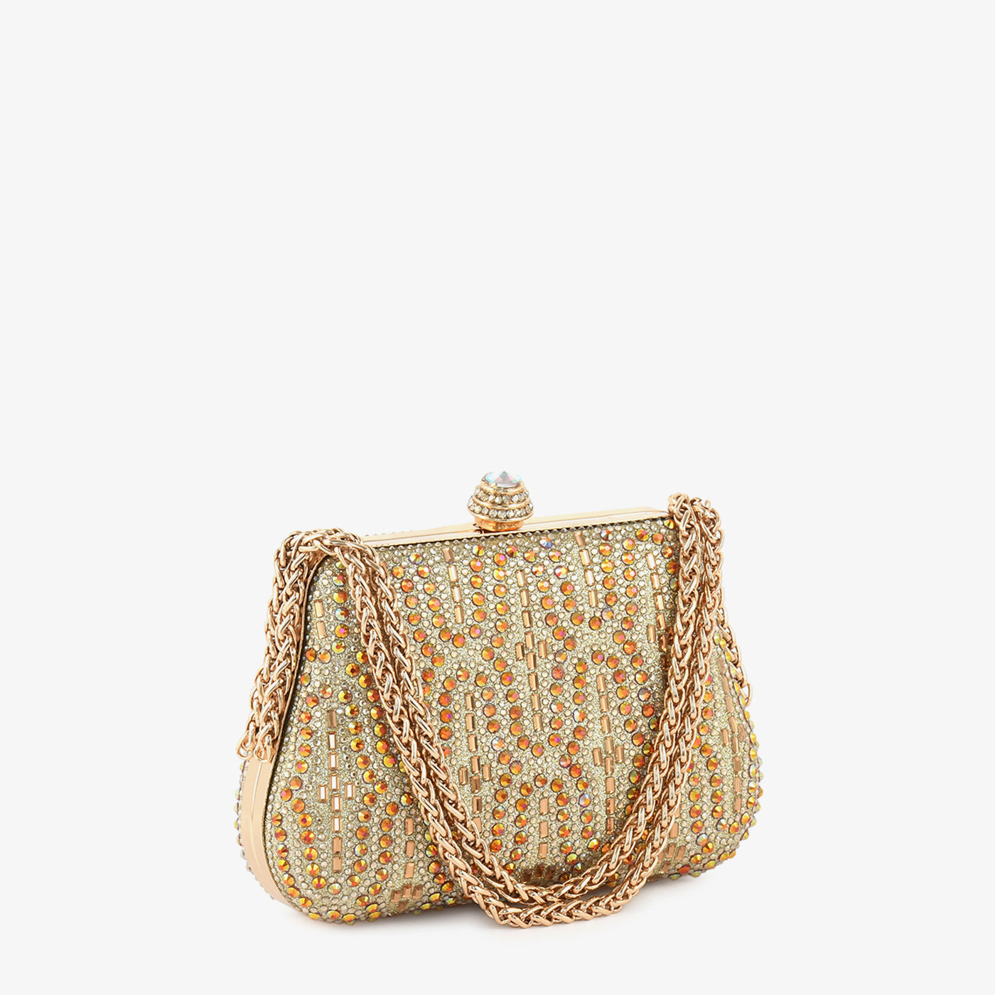 This rounded frame bag sparkles with all-over embellishment and a crown-inspired clasp, making it the ultimate show-stopper. The dual chain handle provides both elegance and versatility, ideal for cocktail nights or celebratory evenings.