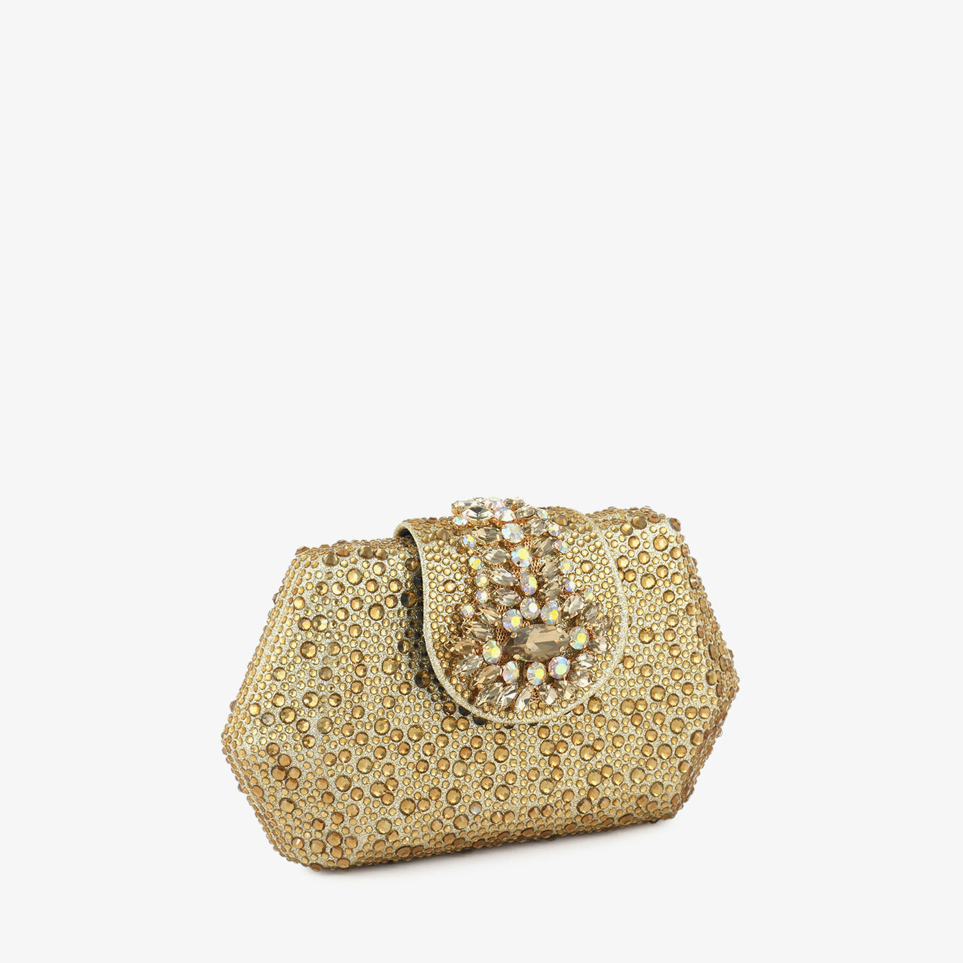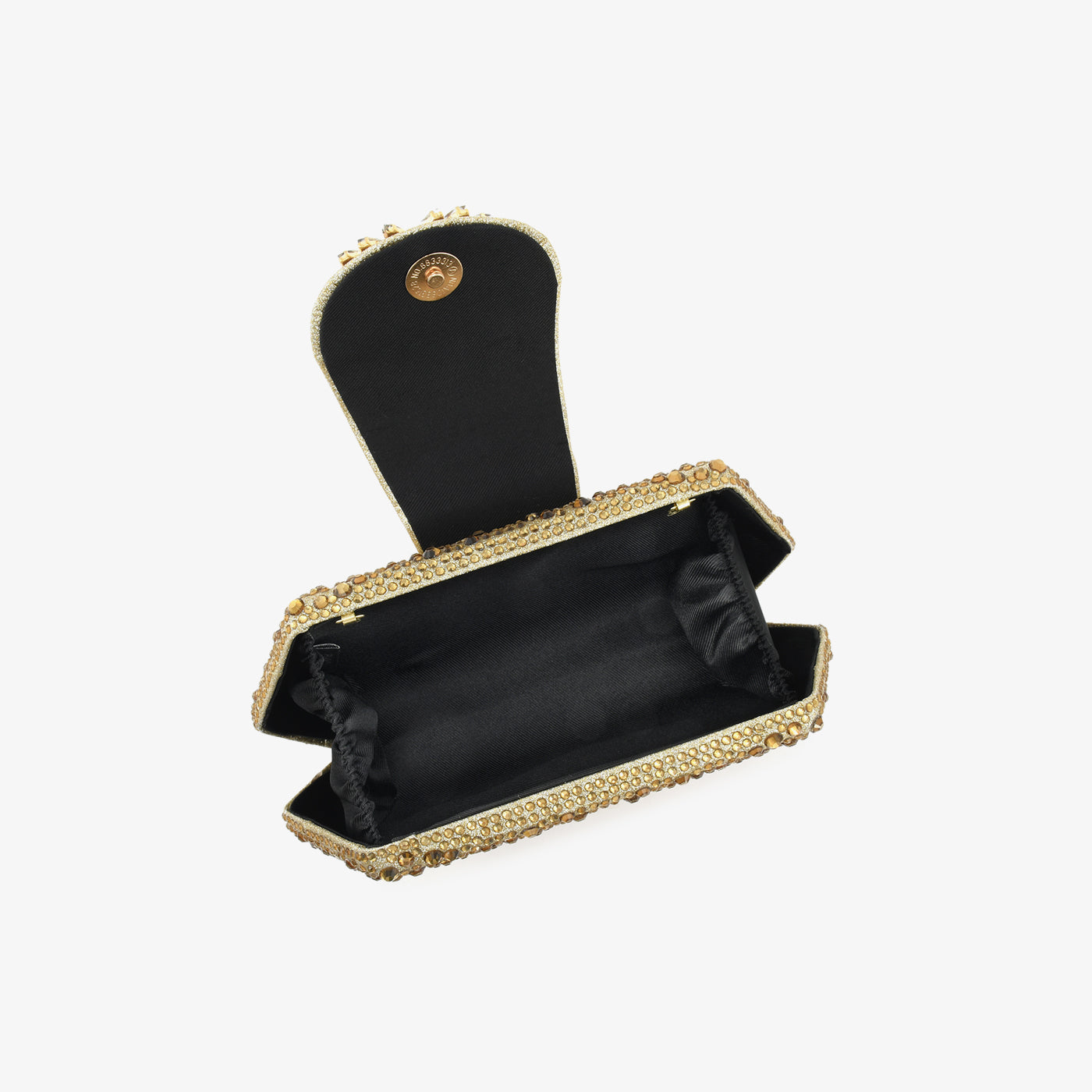 Elevate your accessory game with the "Golden Bloom Clutch." Adorned with multi-shade crystals and intricate beadwork, this clutch features a gold chain strap and a crystal-studded flap for a radiant finish.