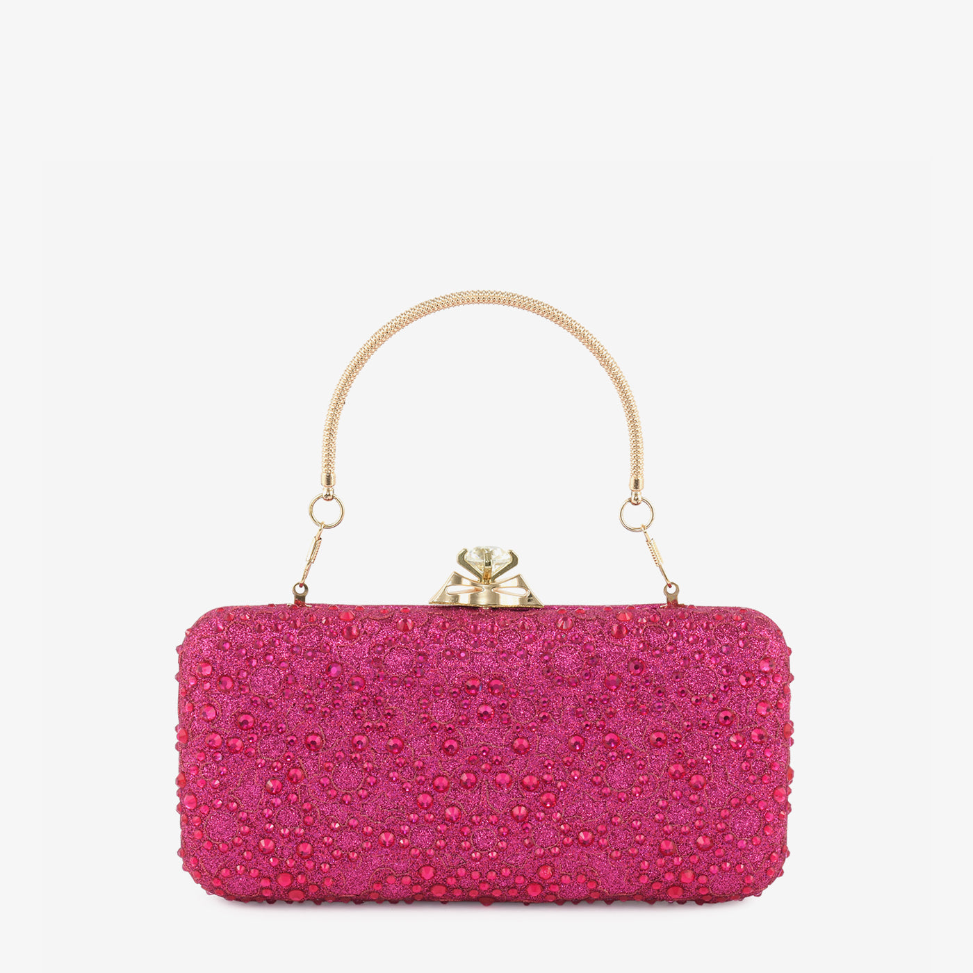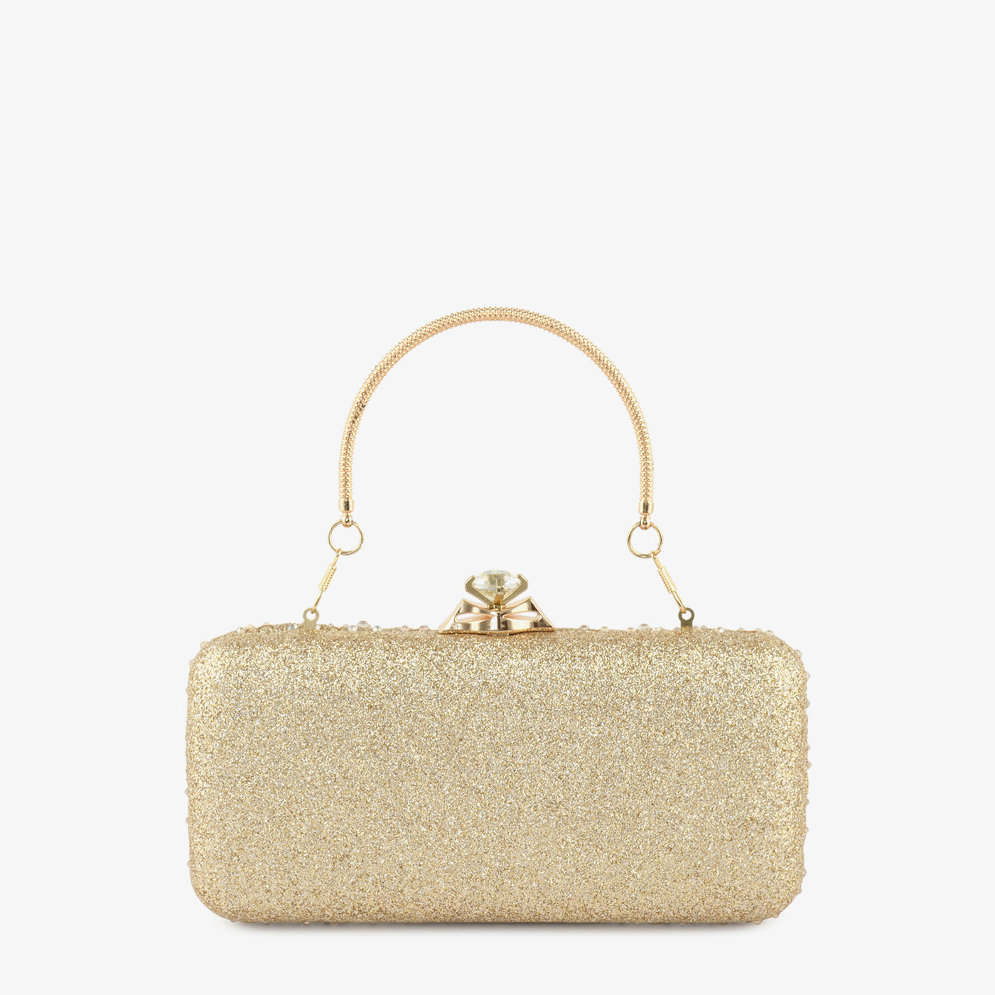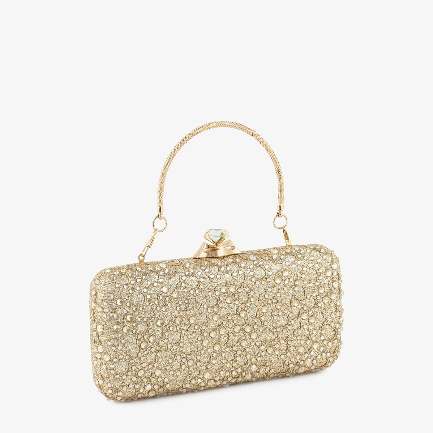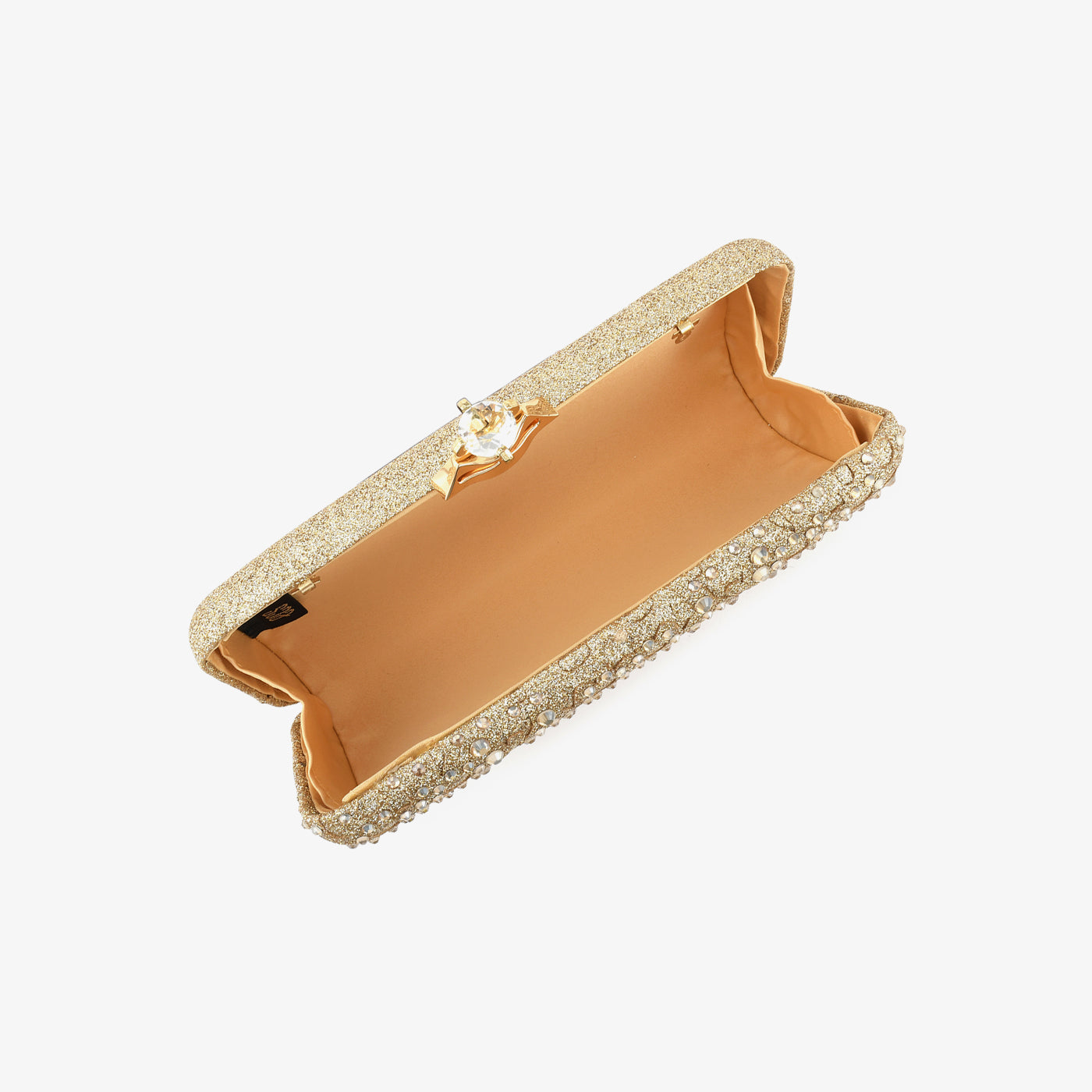 Shine bright with the "Spark Luxe Clutch." Covered in crystal bead clusters, it features a sleek gold handle and a structured frame that exudes elegance.