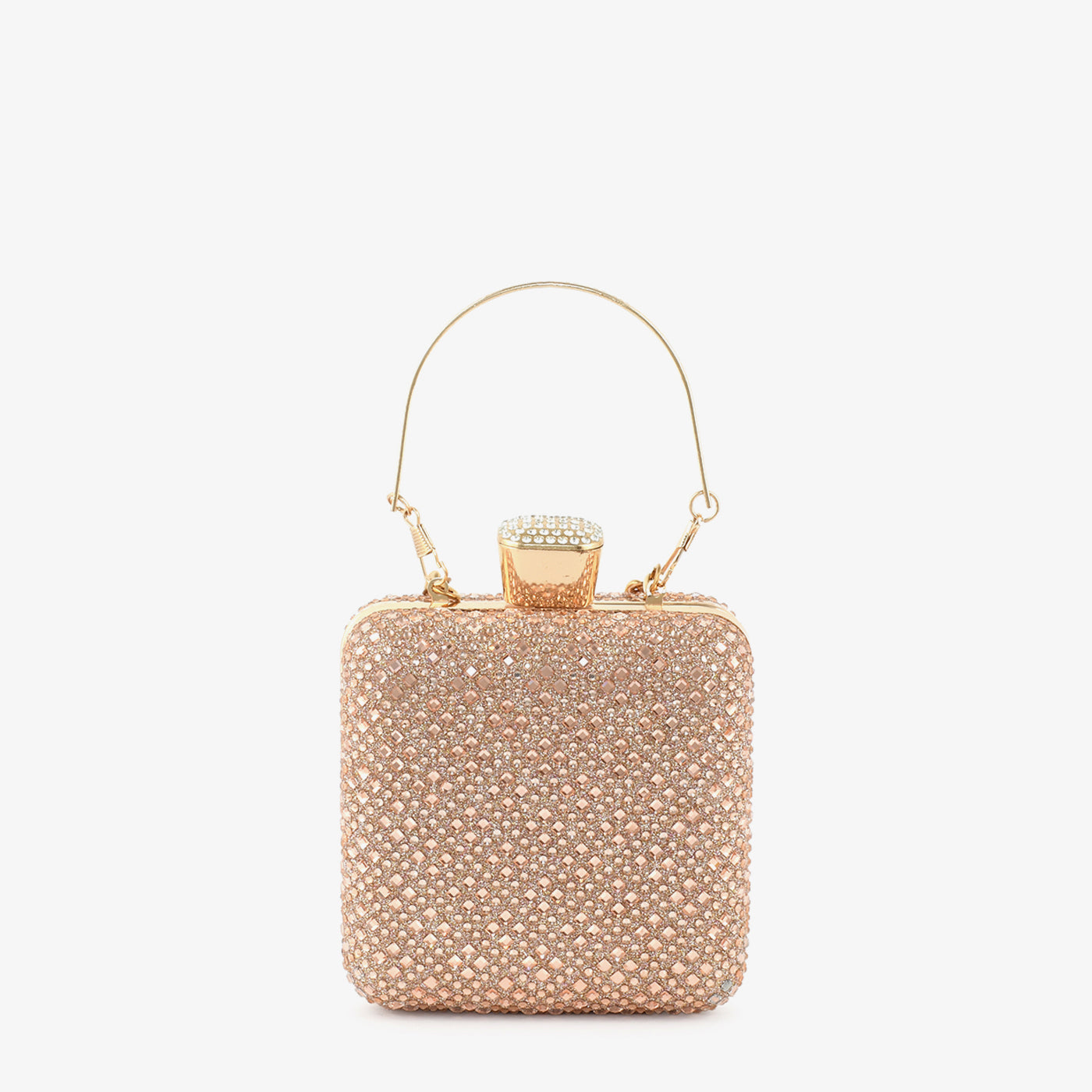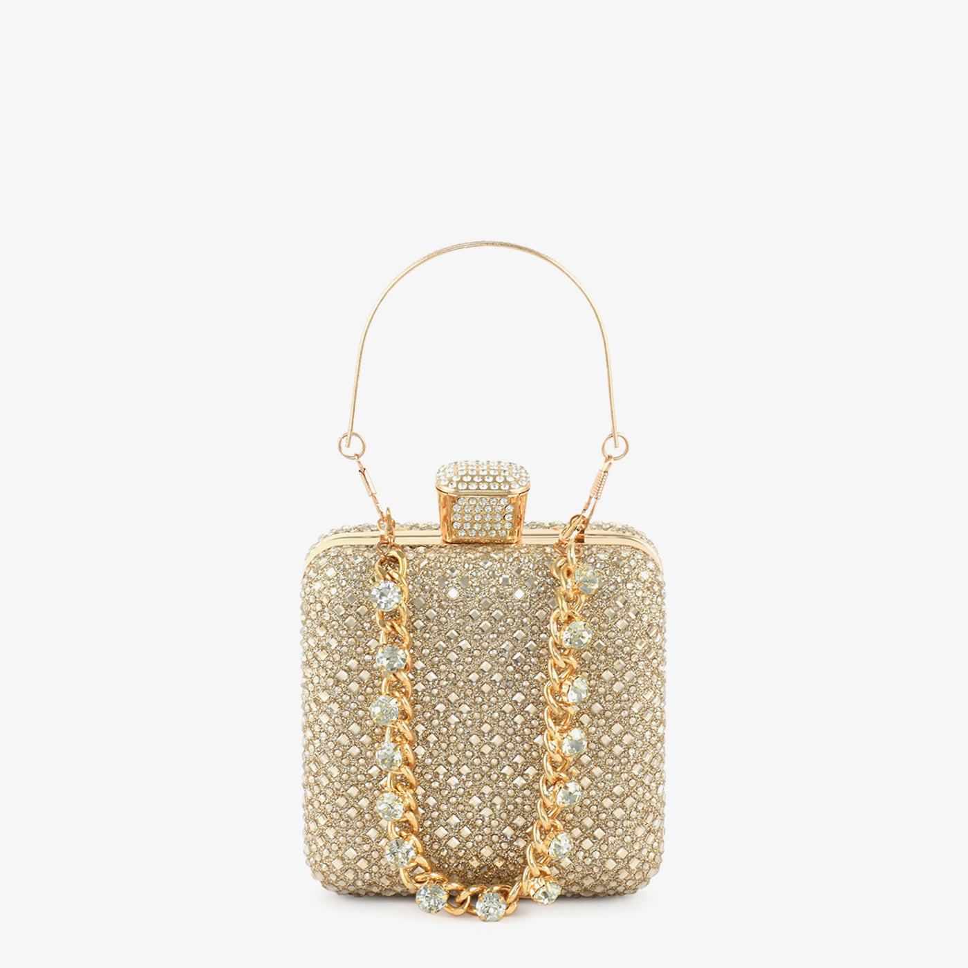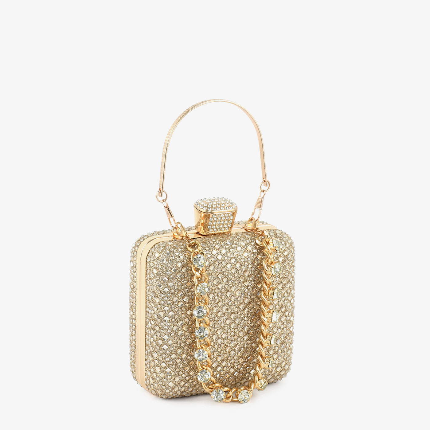 An edgy twist on a timeless shape, this compact square clutch is packed with personality. Featuring a radiant crystal surface and oversized gemstone clasp, it’s the ideal companion for your fashion-forward nights. The metal handle and gemstone chain enhance its glam factor, ensuring you steal every spotlight.
