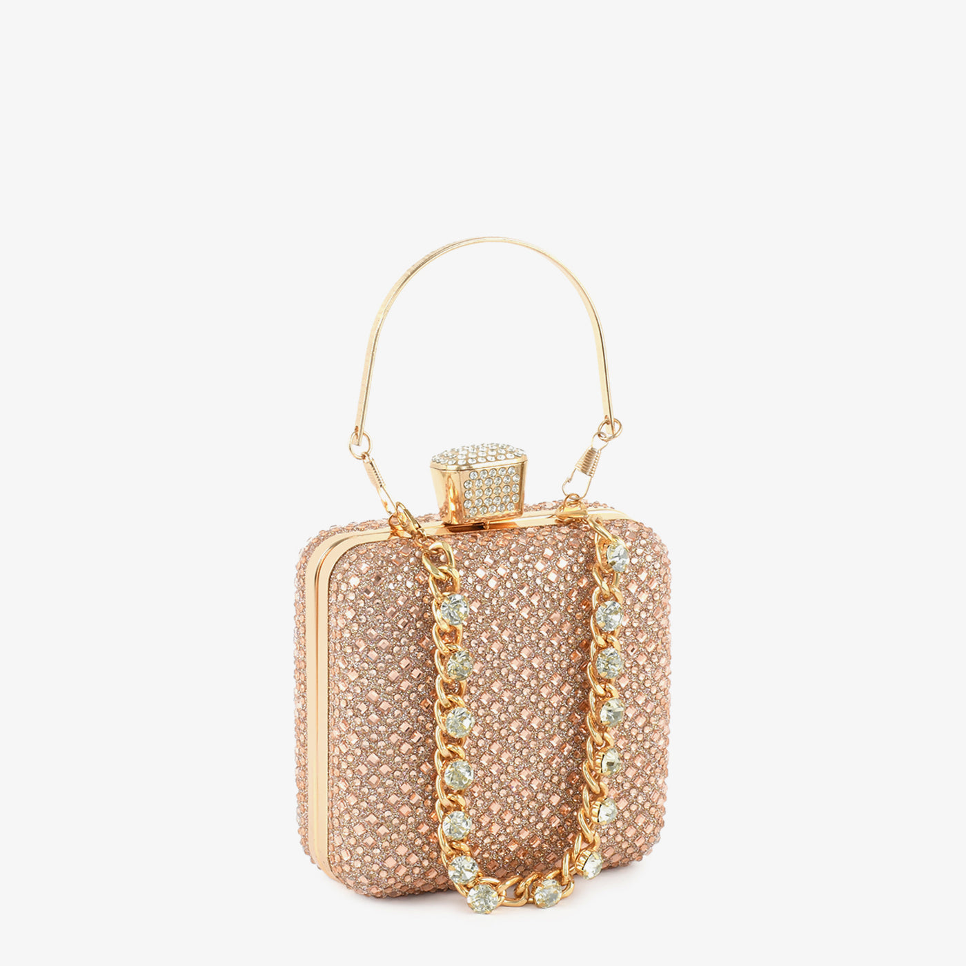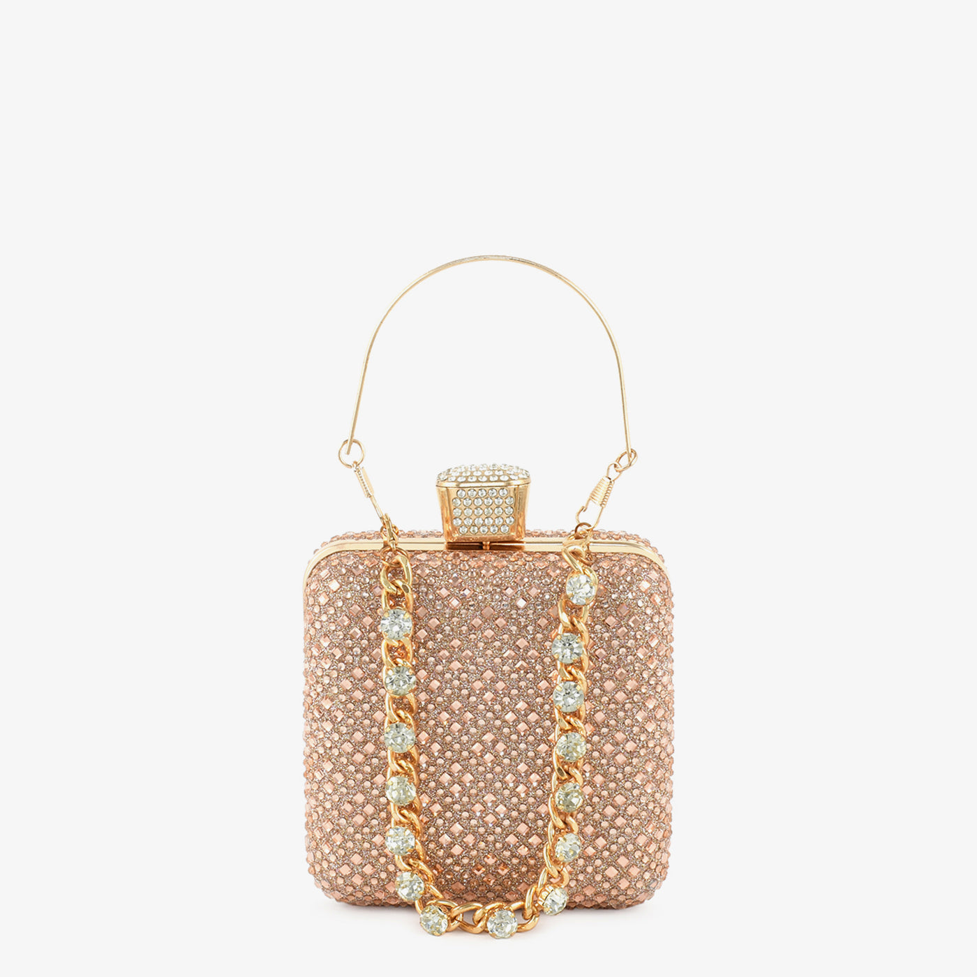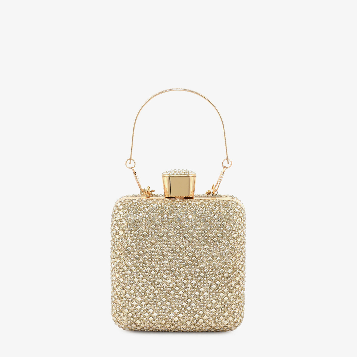 An edgy twist on a timeless shape, this compact square clutch is packed with personality. Featuring a radiant crystal surface and oversized gemstone clasp, it’s the ideal companion for your fashion-forward nights. The metal handle and gemstone chain enhance its glam factor, ensuring you steal every spotlight.