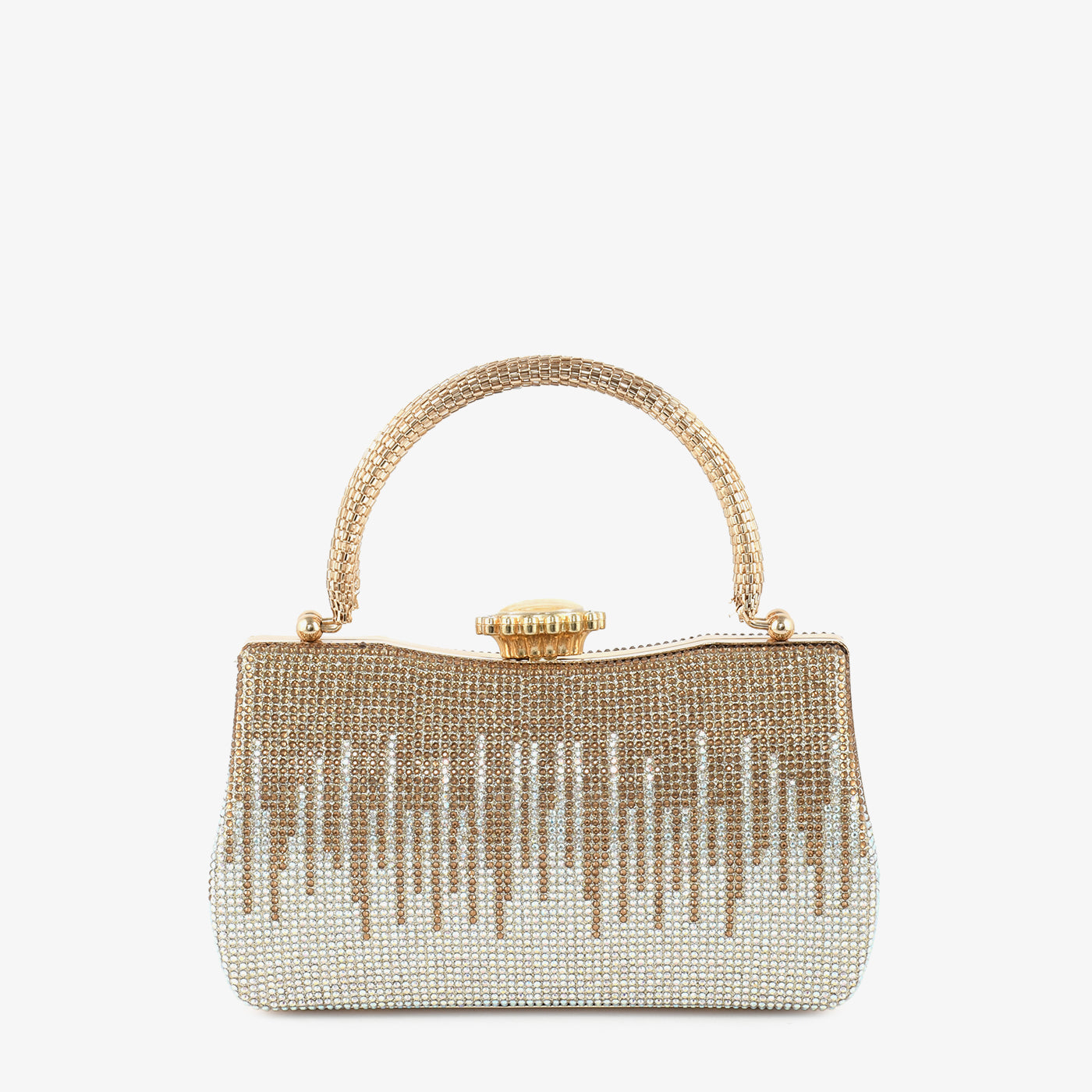 Where elegance meets extravagance—this graceful top-handle bag brings high drama with its ombré crystal fade and golden clasp. The curved frame silhouette adds a vintage nod while the glitzy gradient pattern keeps it contemporary and chic.