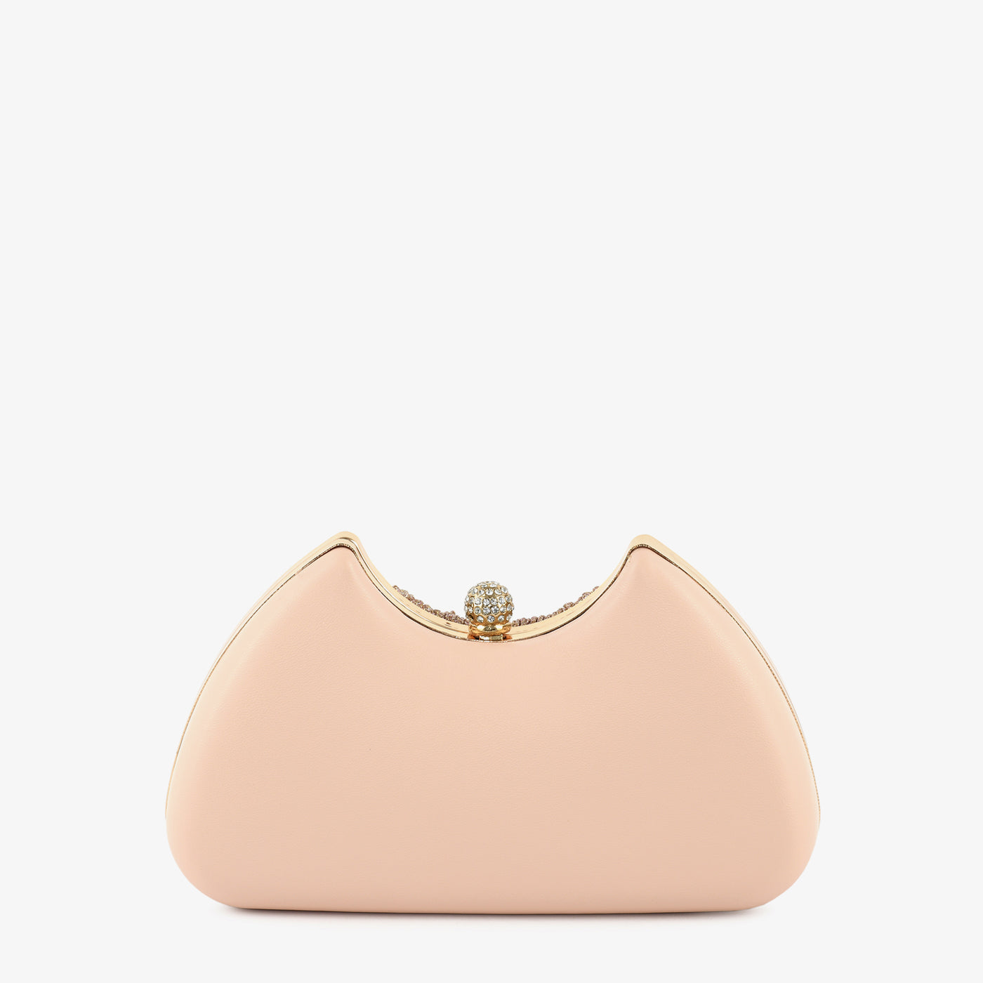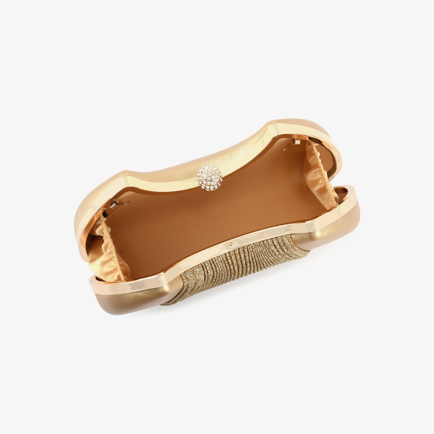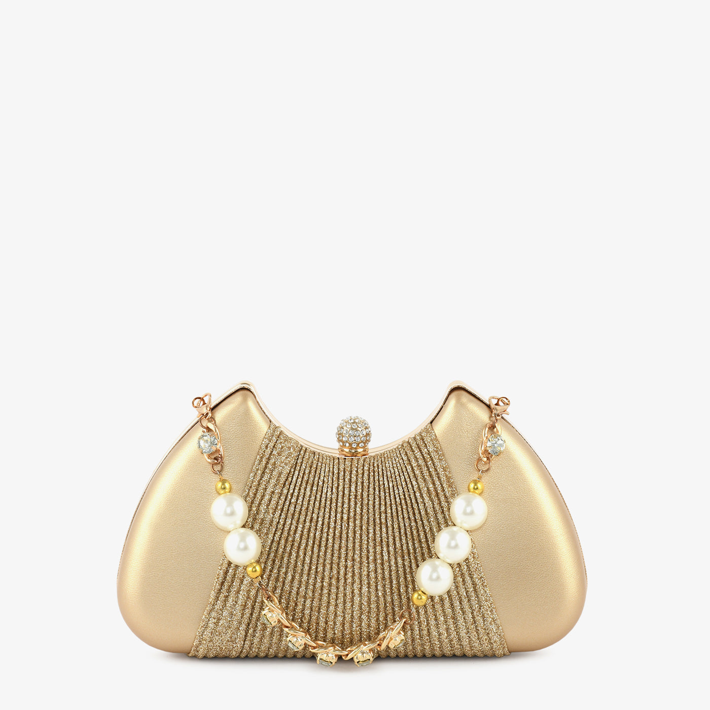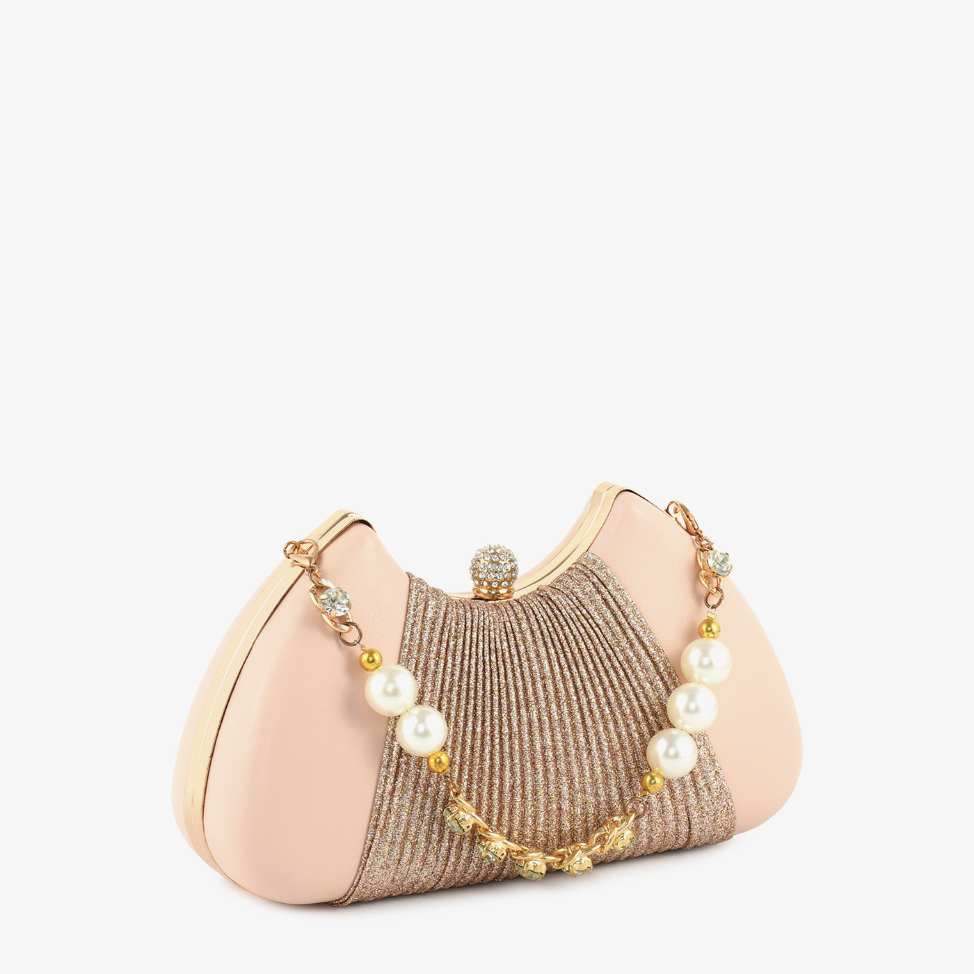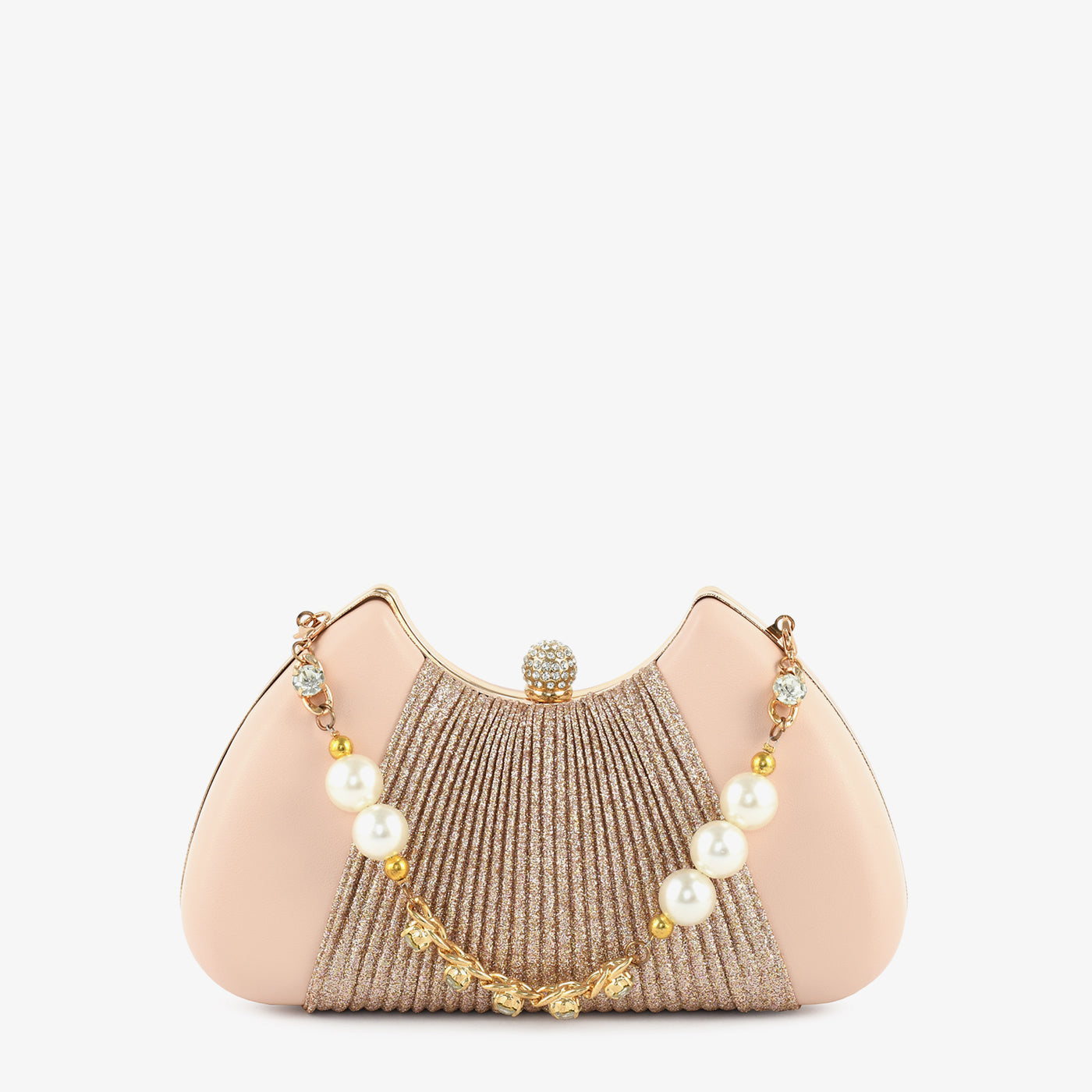 The "Radiant Charm Clutch" is a true statement piece with its pleated shimmer body, pearl beaded strap, and crystal-detailed clasp. Designed to exude grace, it brings together timeless elegance and festive sparkle.