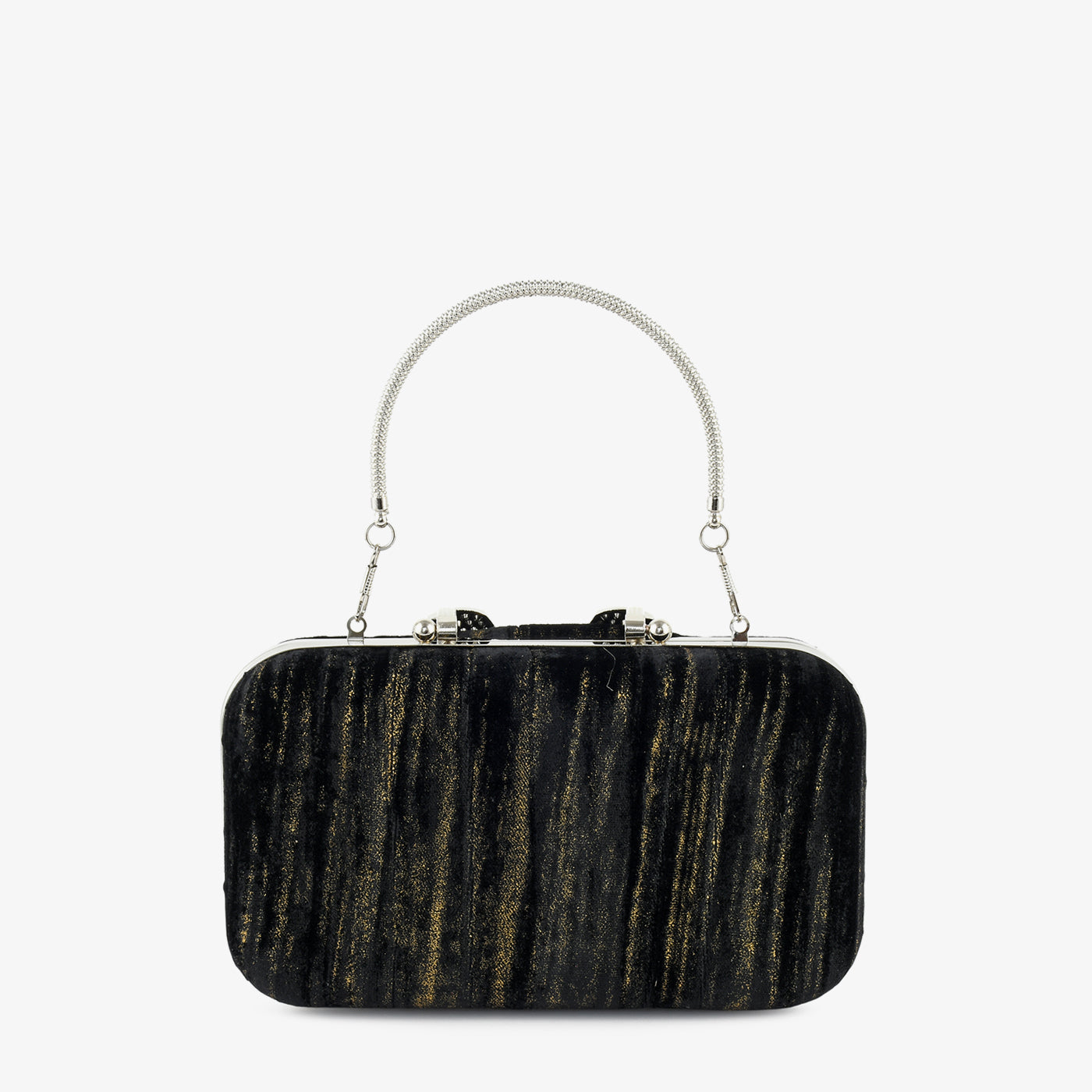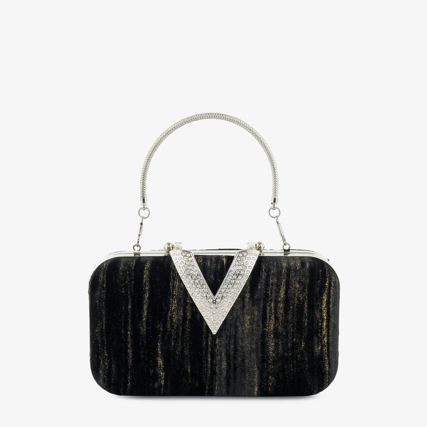 Make a bold statement with the "Golden V Luxe Clutch." Featuring a shimmering metallic base and a striking crystal-encrusted V accent, it’s the perfect blend of modern and glamorous.
