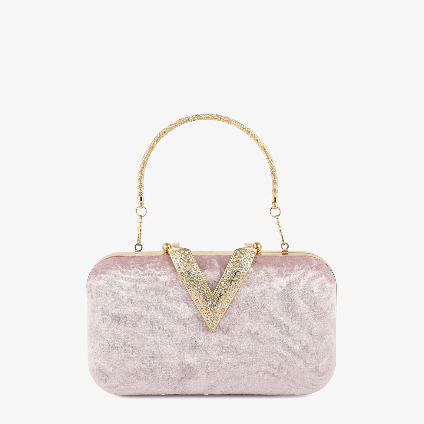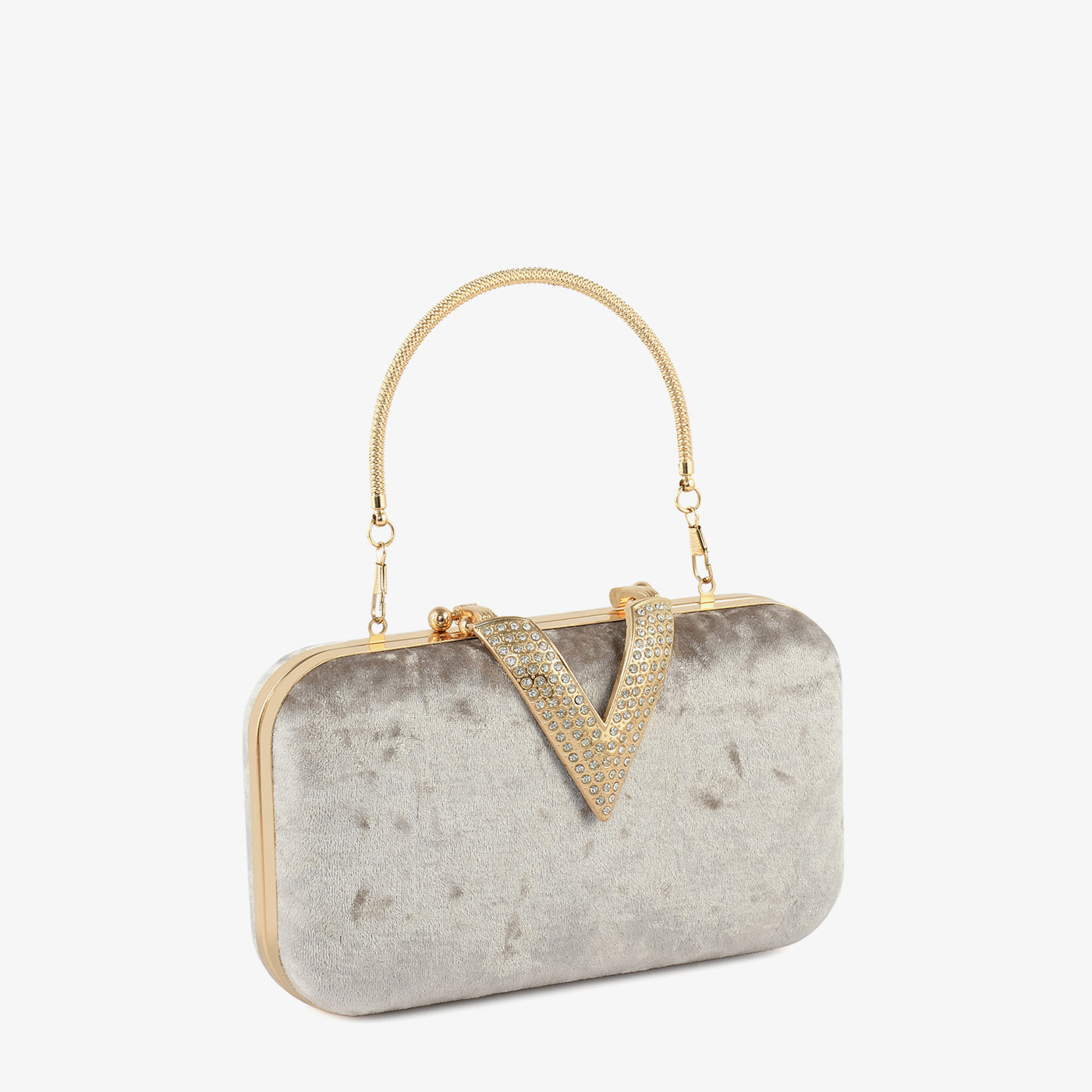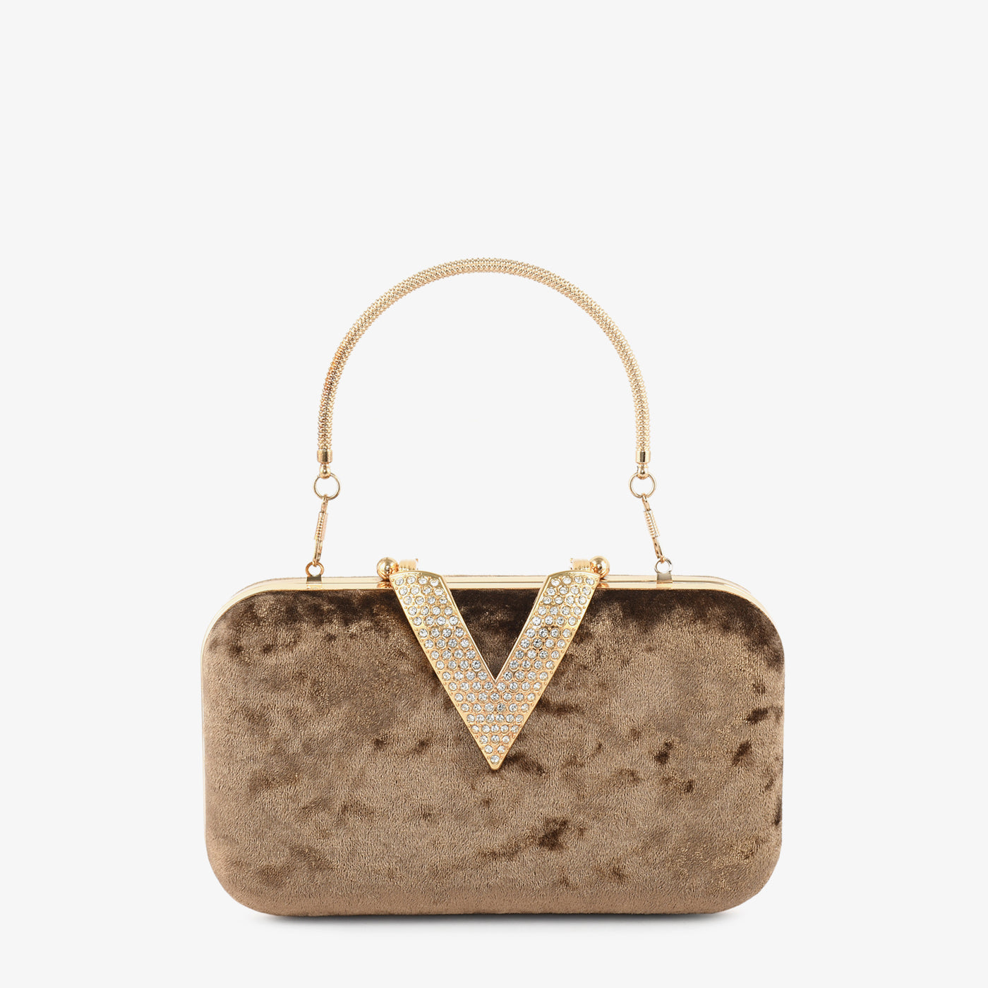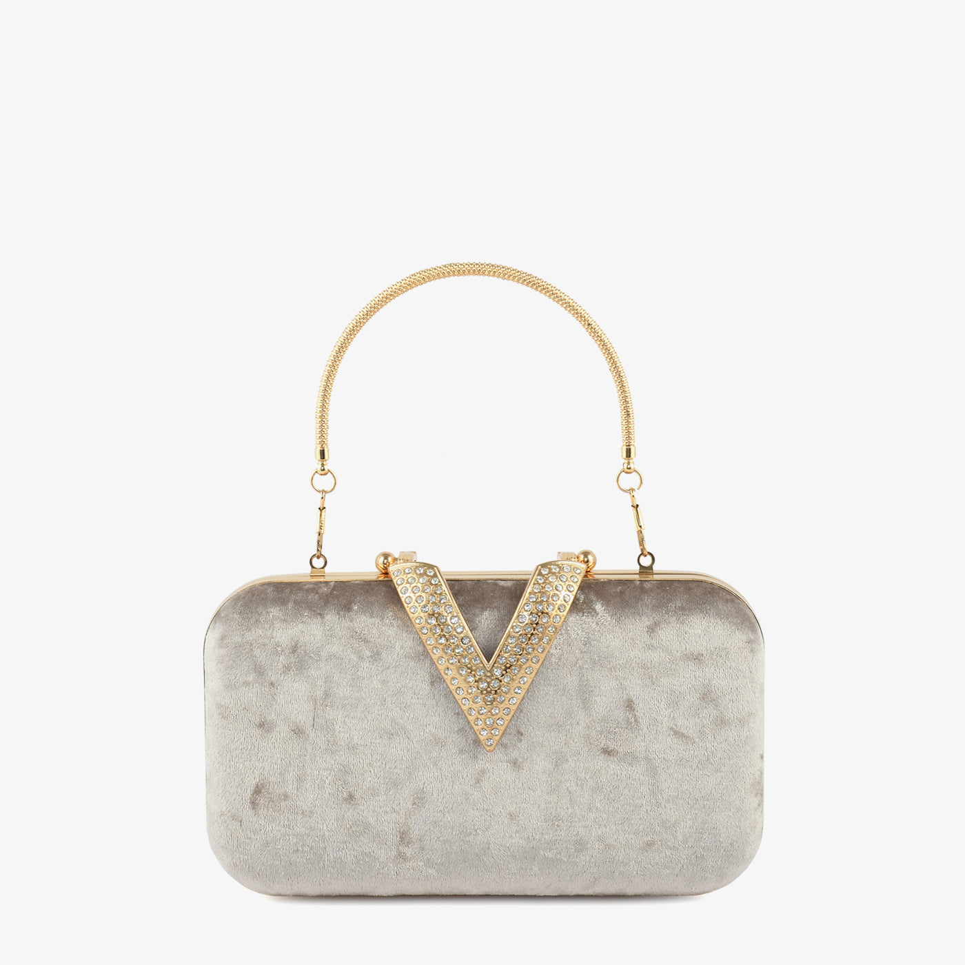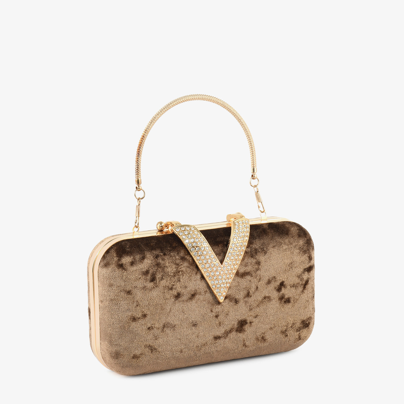 Embrace soft luxury with the "Velour V Glam Clutch." Wrapped in plush velour and topped with a dazzling V-shaped crystal accent, it’s ideal for adding rich texture to evening ensembles.