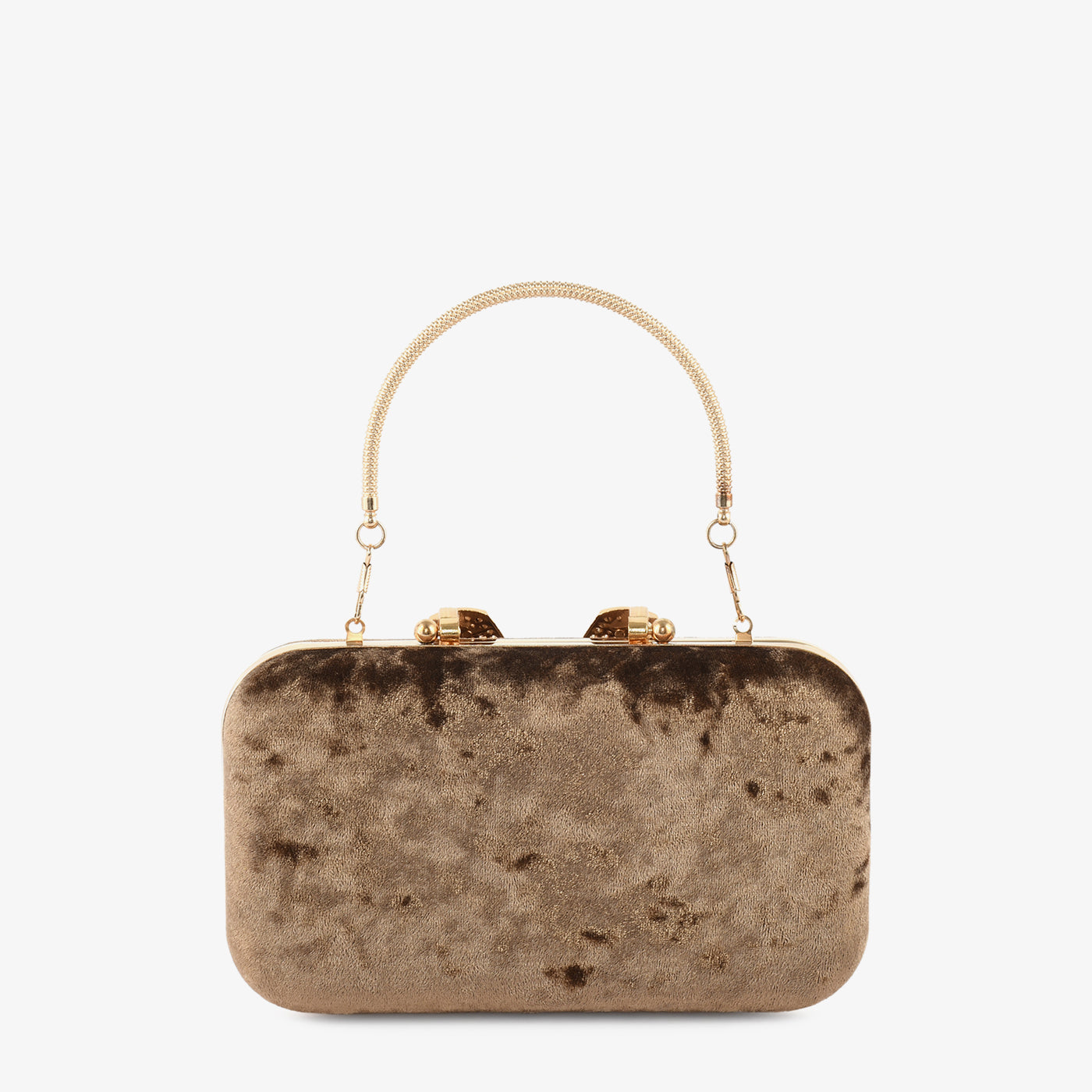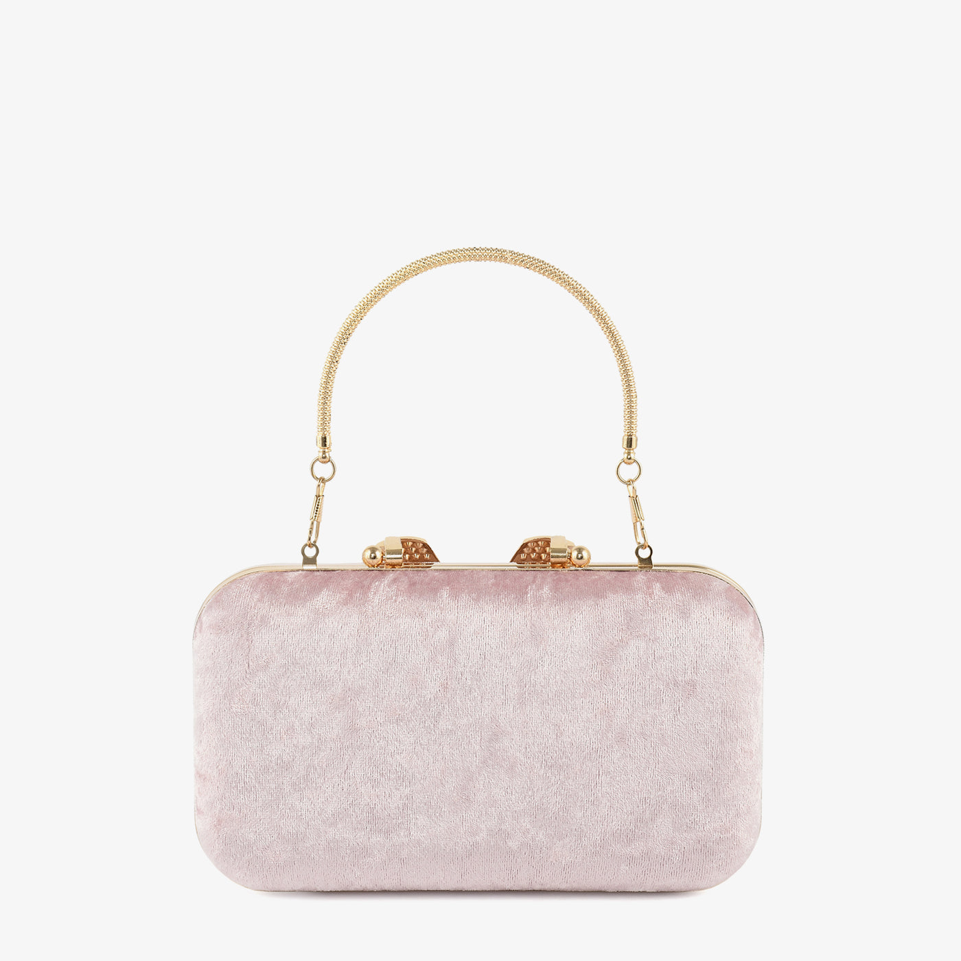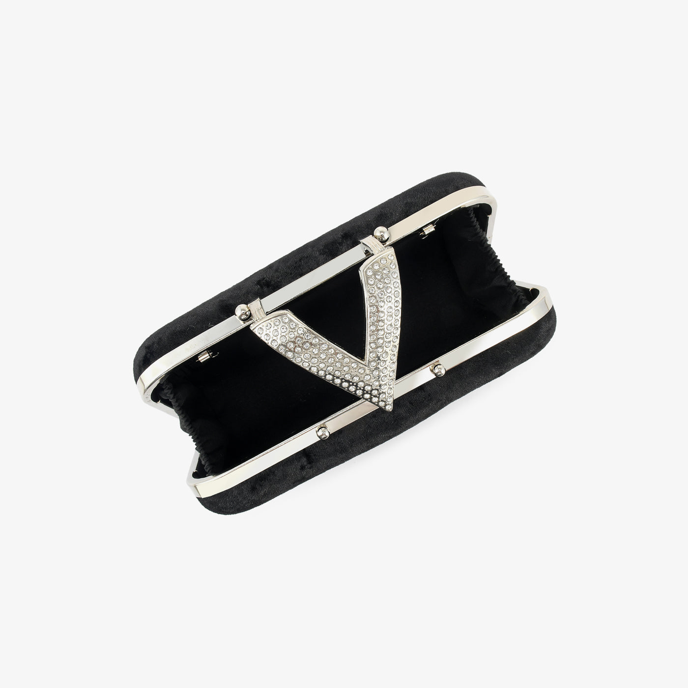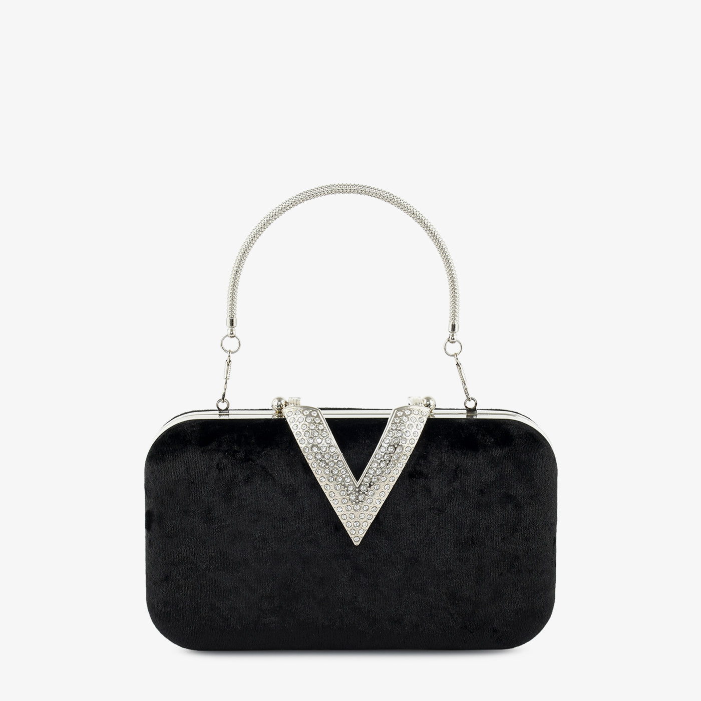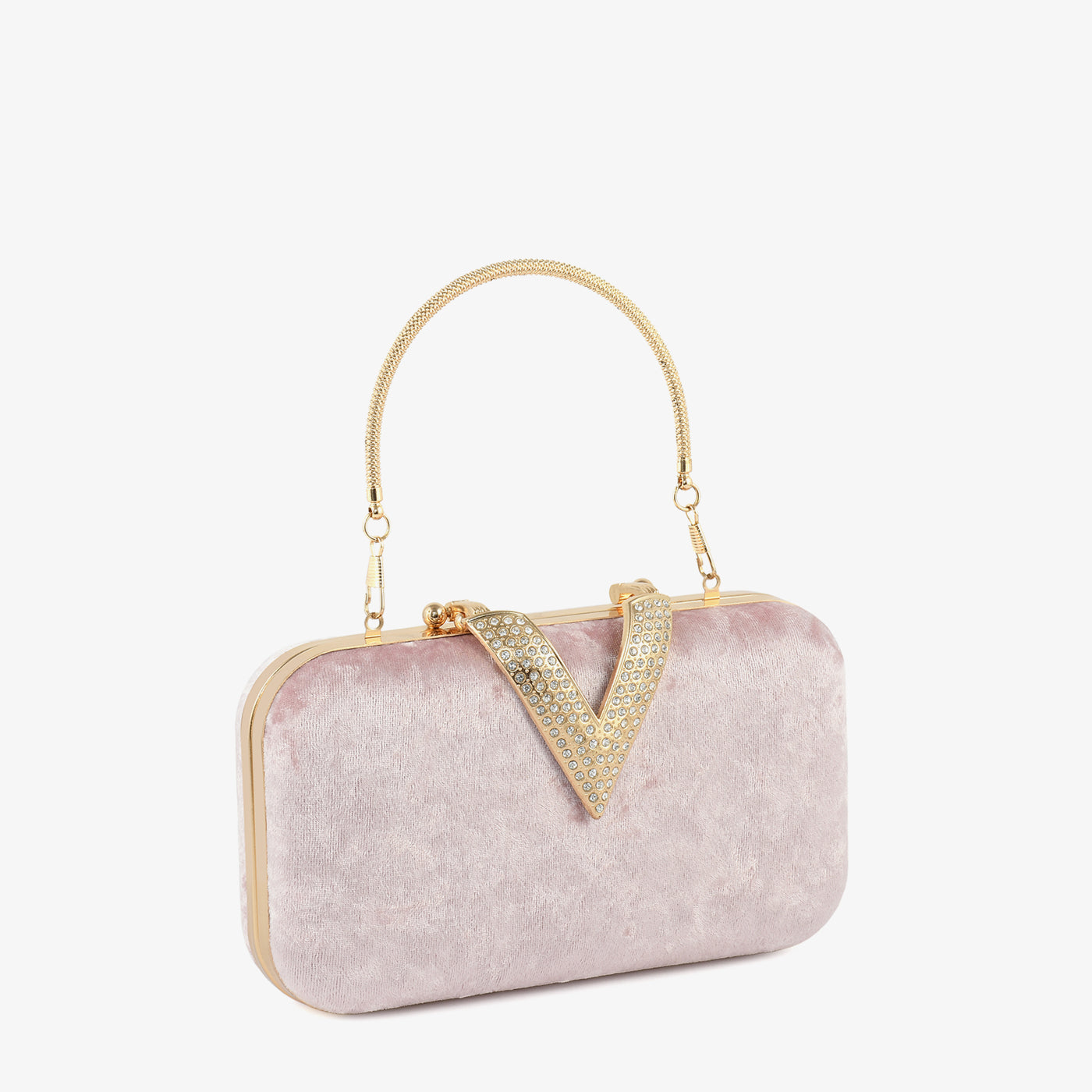 Embrace soft luxury with the "Velour V Glam Clutch." Wrapped in plush velour and topped with a dazzling V-shaped crystal accent, it’s ideal for adding rich texture to evening ensembles.