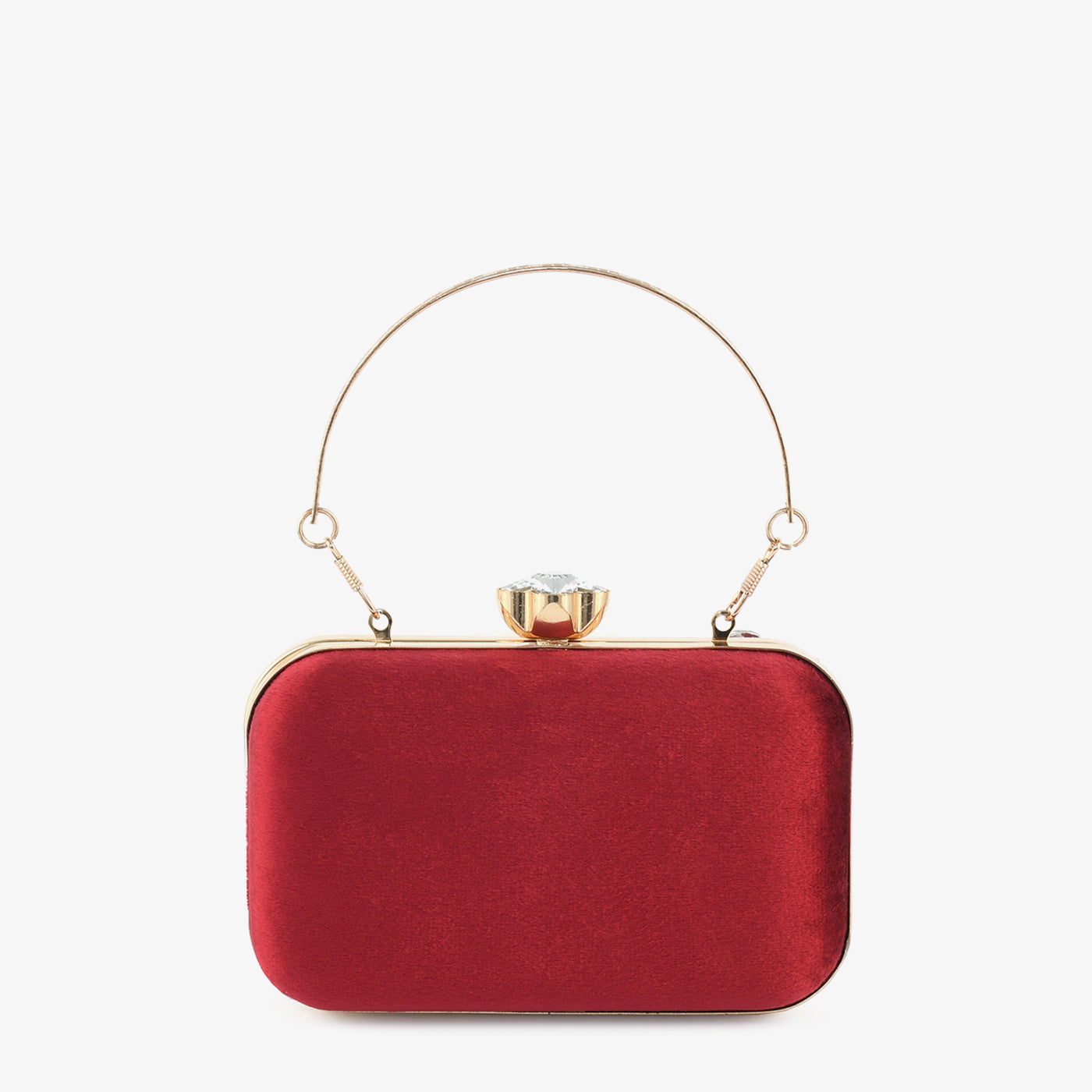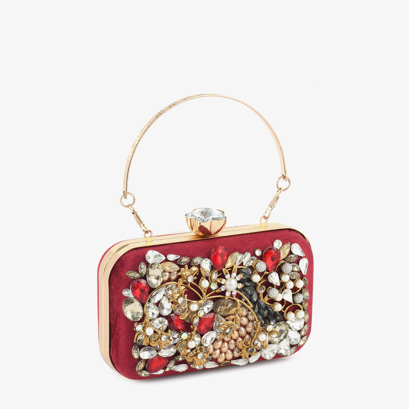 This clutch is richly adorned with multicolored gems and pearls. The floral embellishments add a dramatic royal flair, perfect for grand occasions.